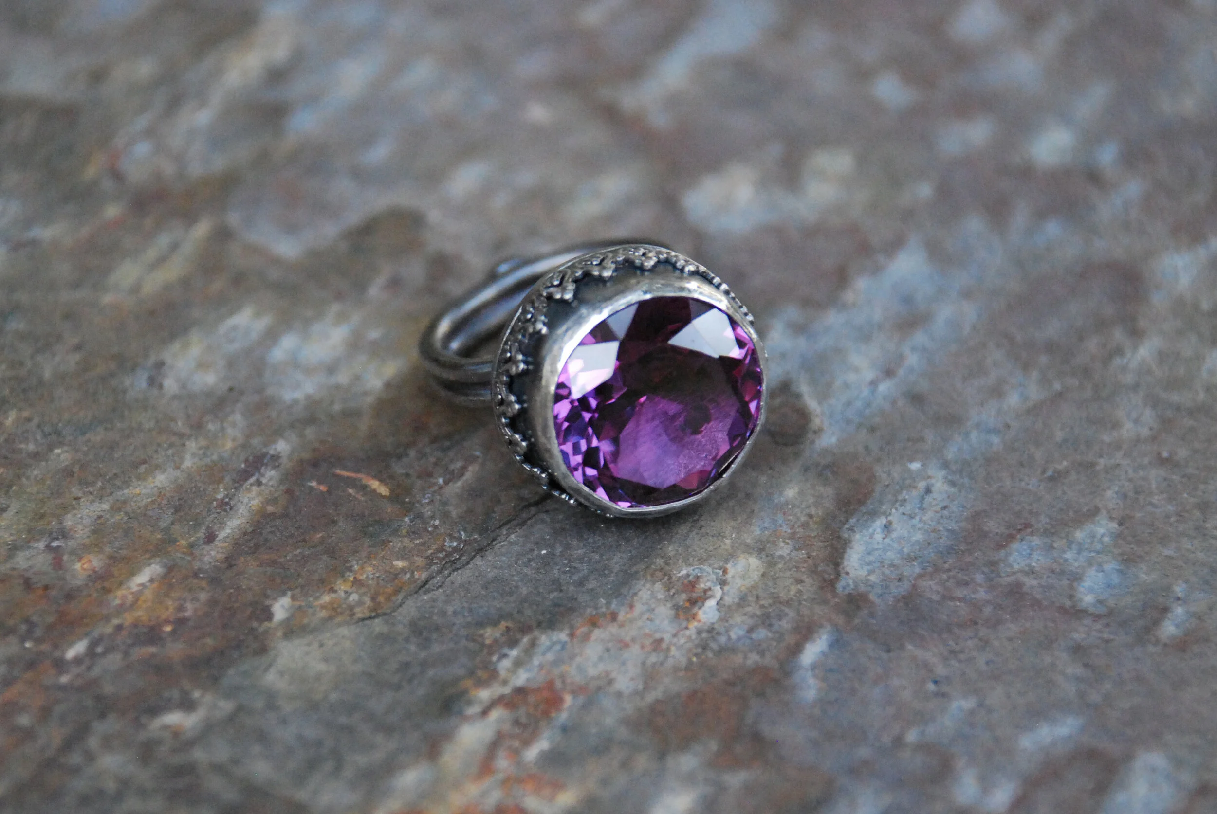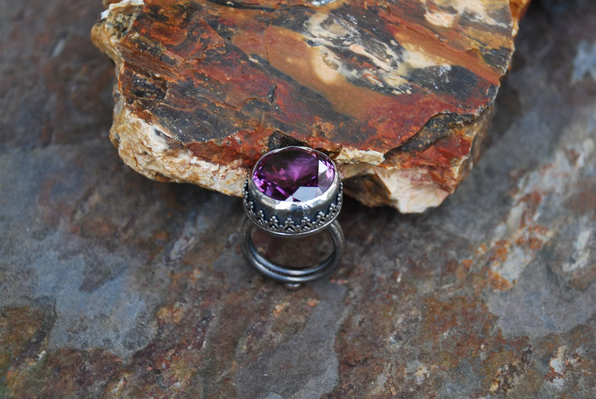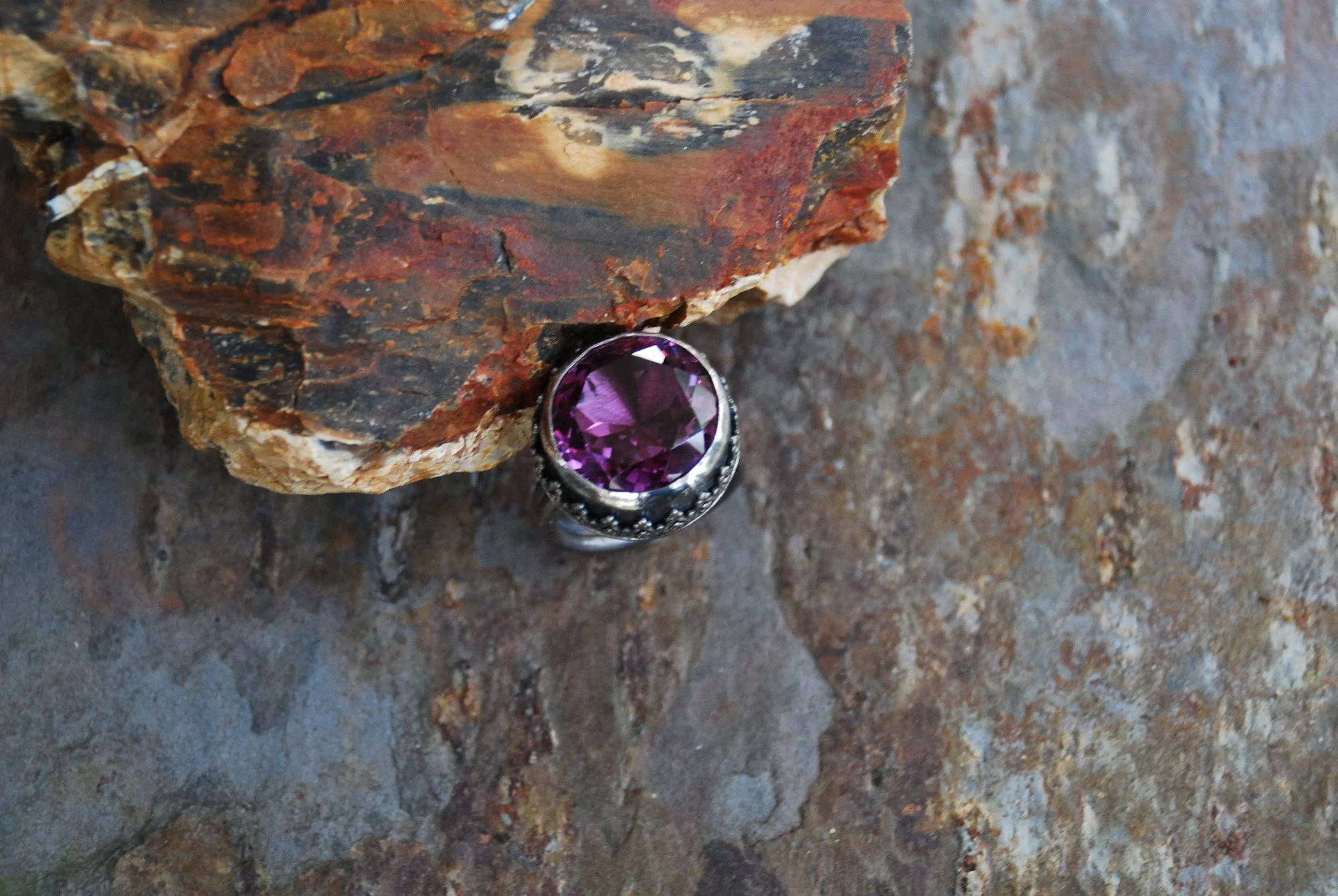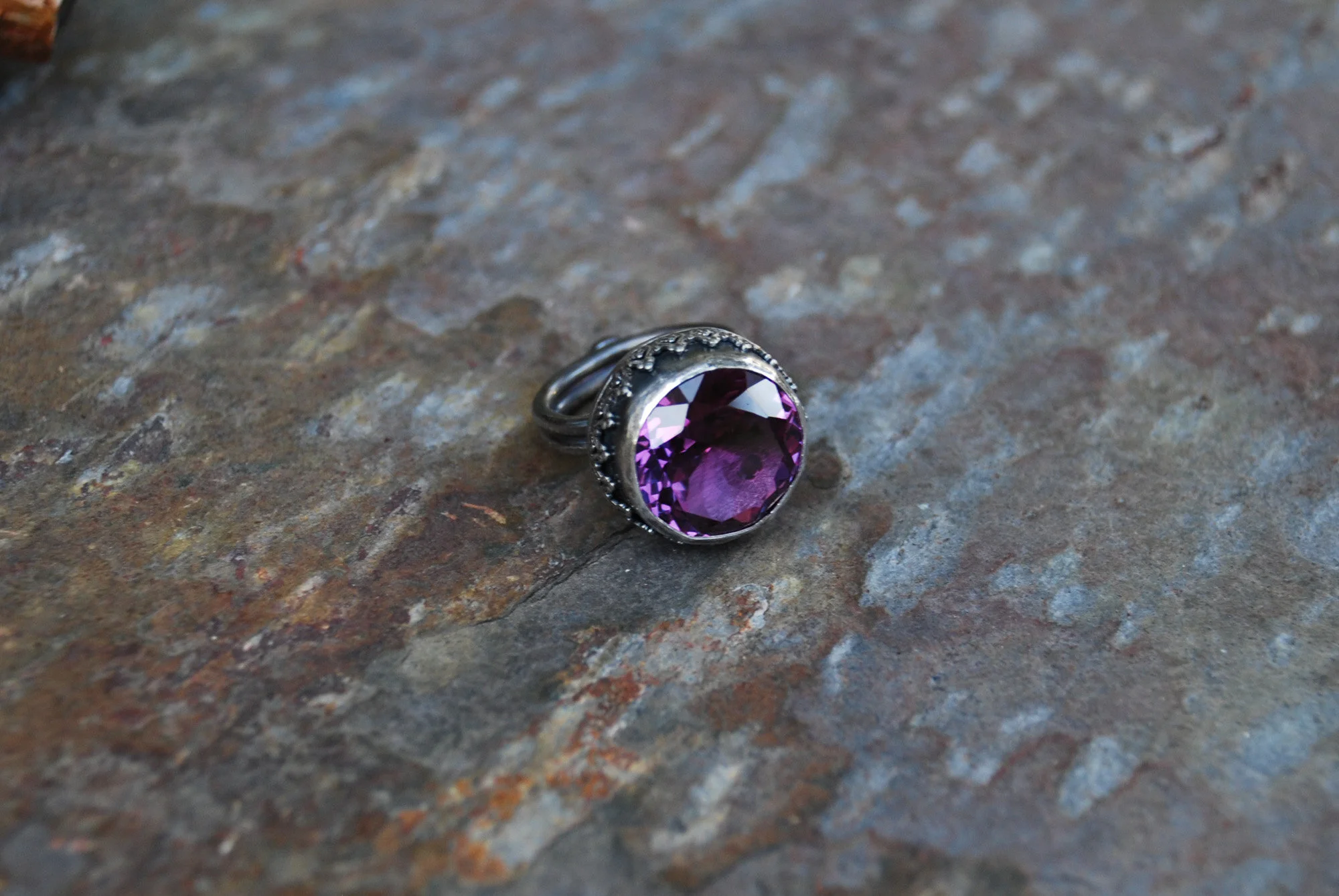 Like it or not, what you wear can speak volumes about you. The jewelry you choose can take an outfit from boring to getting noticed. Sometimes you may just want to sparkle and shine! Just like this ring. The style is simple but it makes a bold statement. A large purple CZ set in sterling silver. Size 7 with adjustable band.