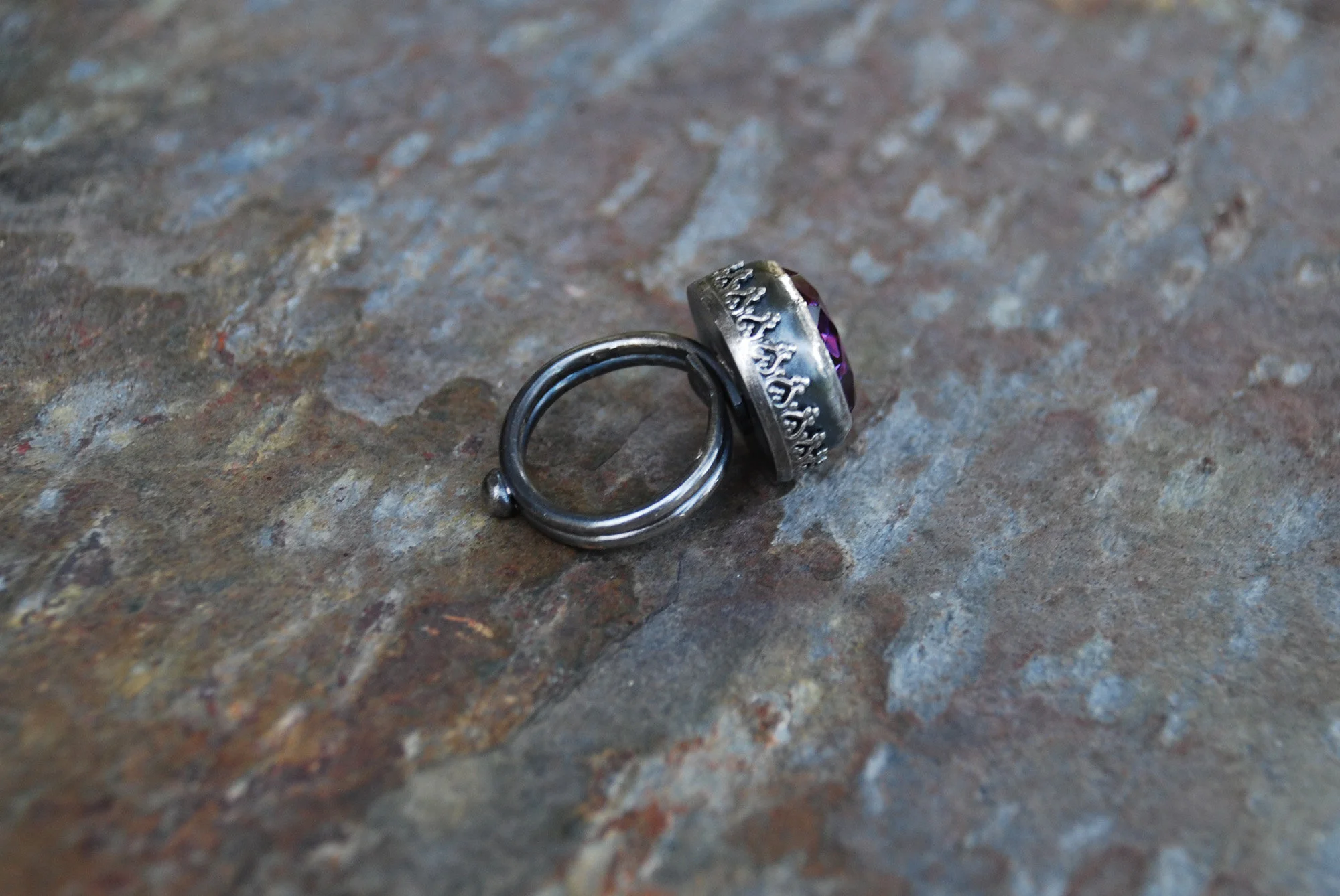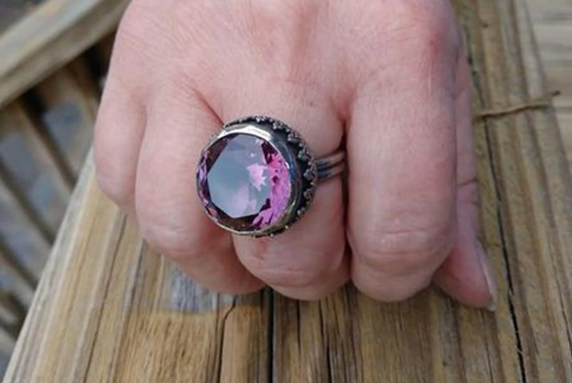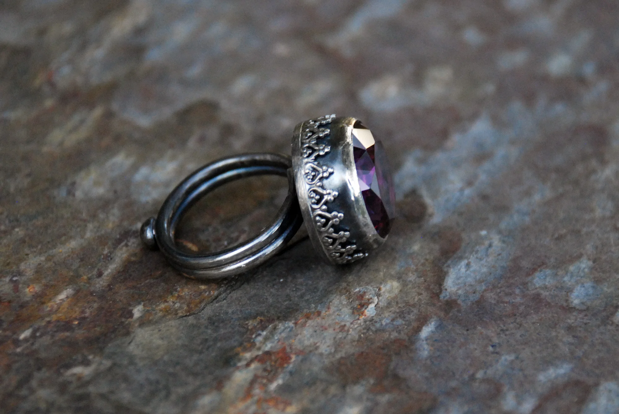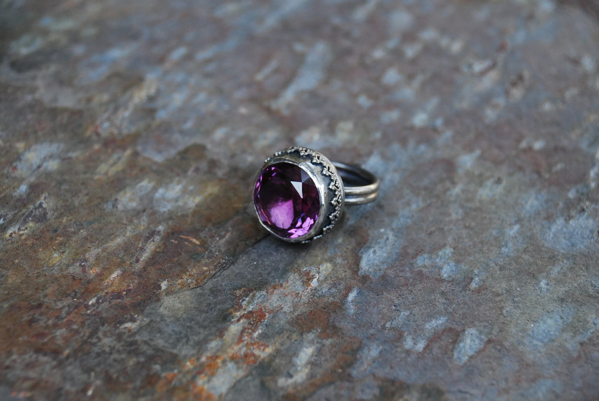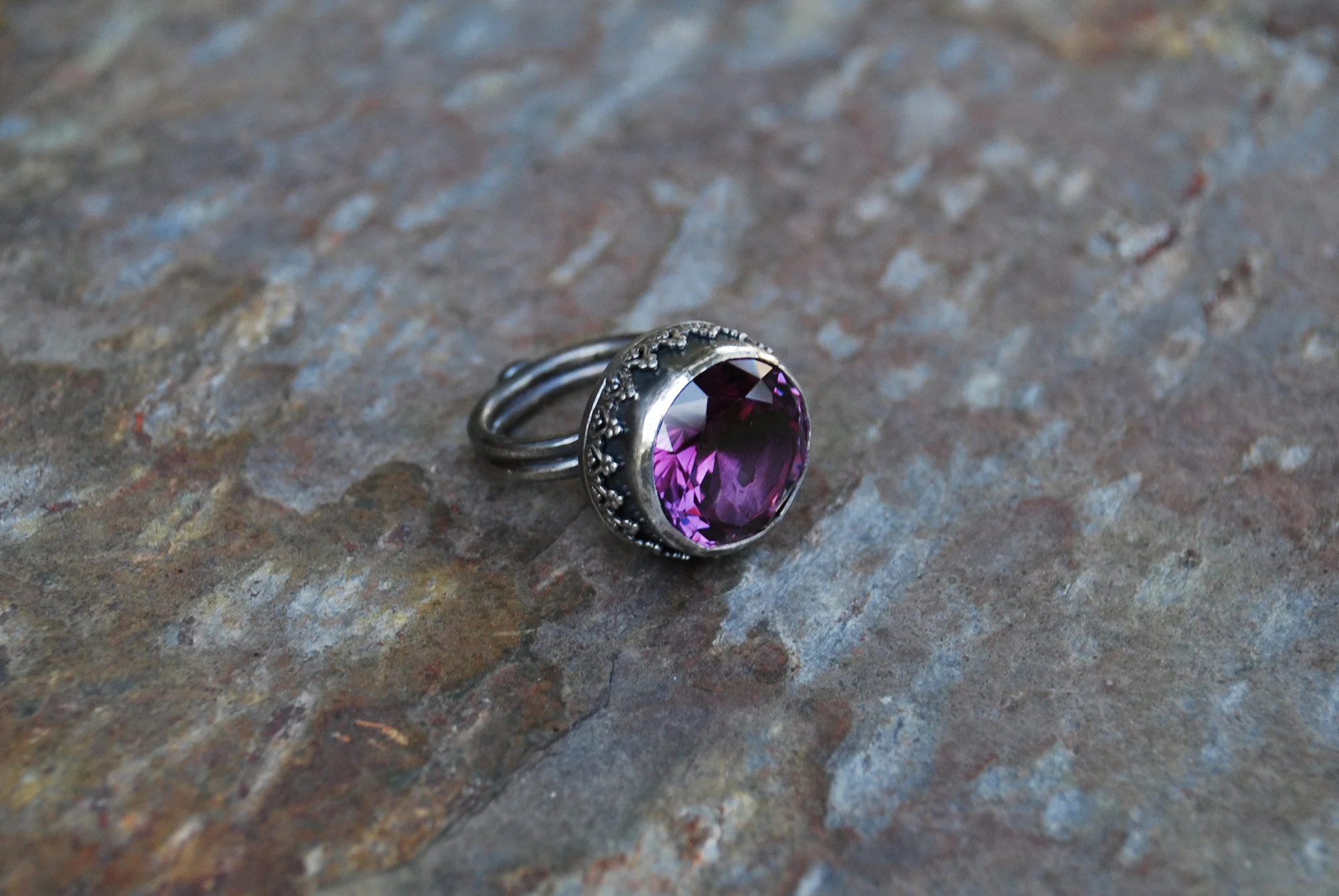 Like it or not, what you wear can speak volumes about you. The jewelry you choose can take an outfit from boring to getting noticed. Sometimes you may just want to sparkle and shine! Just like this ring. The style is simple but it makes a bold statement. A large purple CZ set in sterling silver. Size 7 with adjustable band.