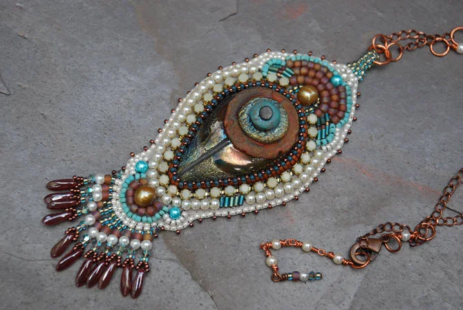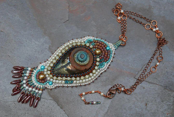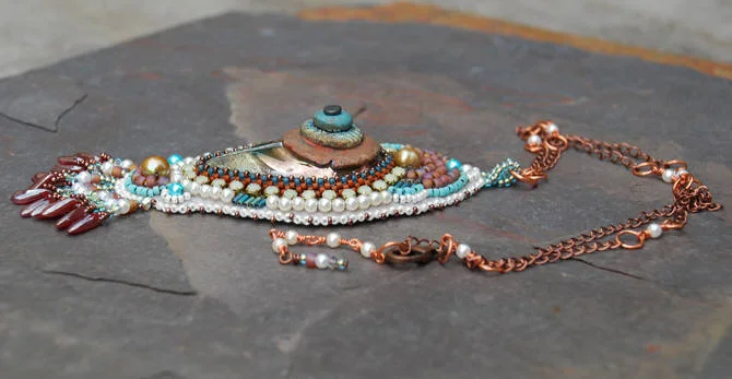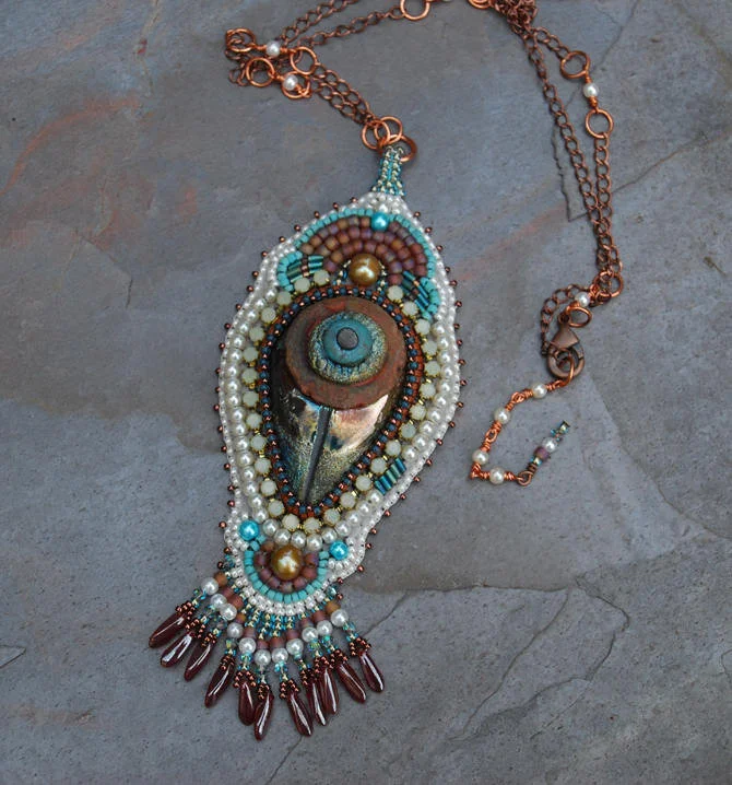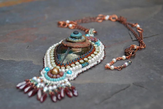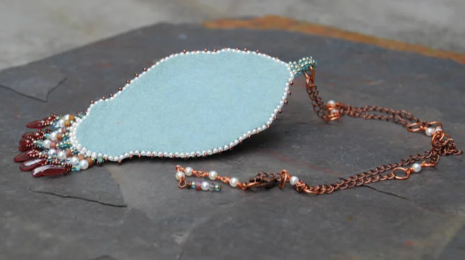 I've never visited Arizona but this piece is my vision of what Arizona might be like. The beautiful raku focal was made by Maku Raku Studio. Surrounded by opalescent cup chain, glass and fresh water pearls, seed beads, Swarovski crystals and daggers. Copper and pearl chain, 16" in length with 3" extension. Backed with light blue ultra-suede.
