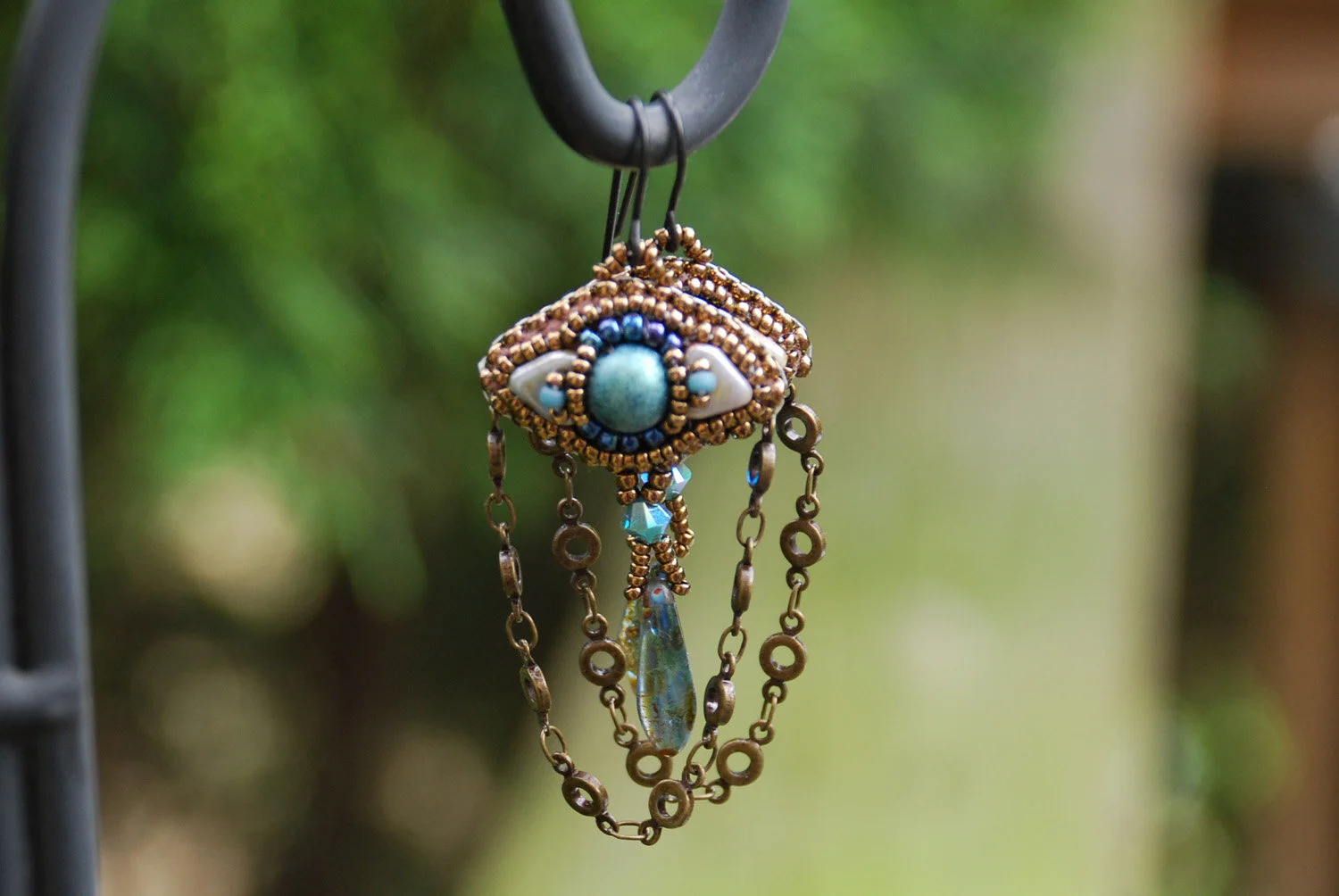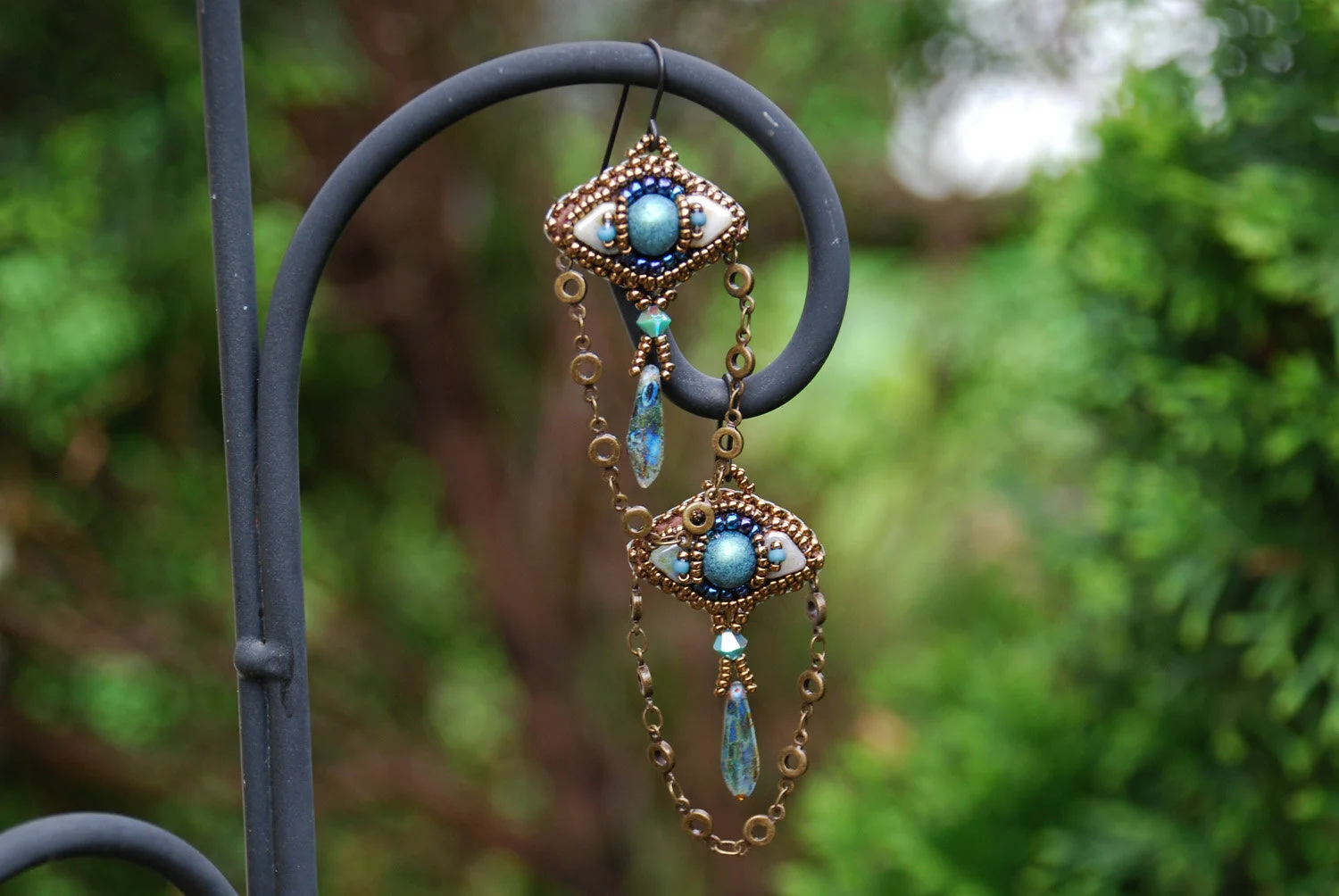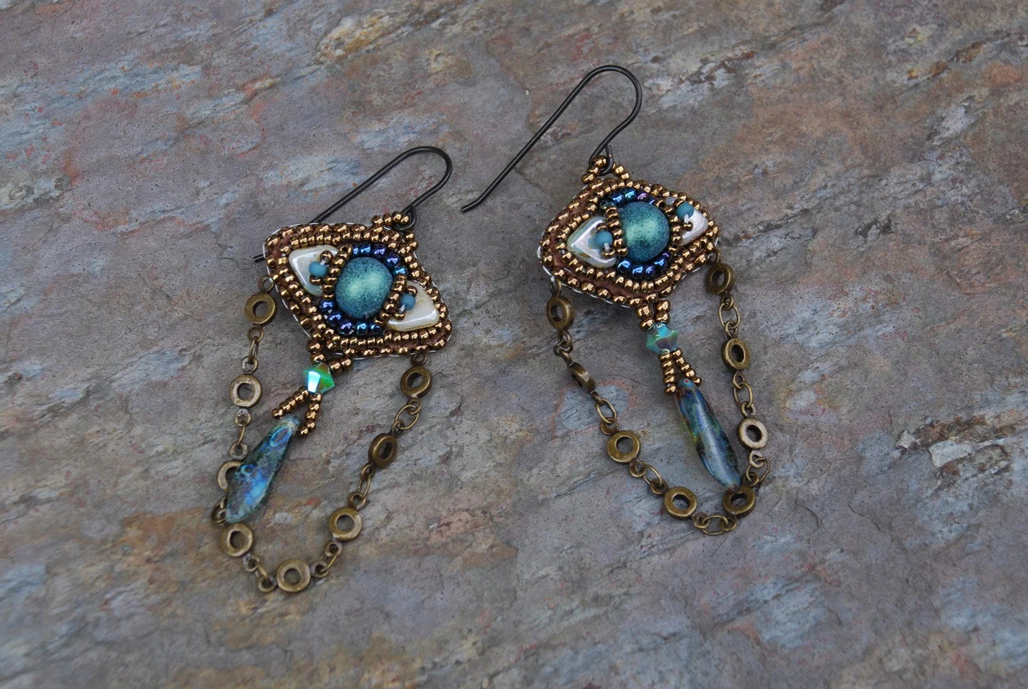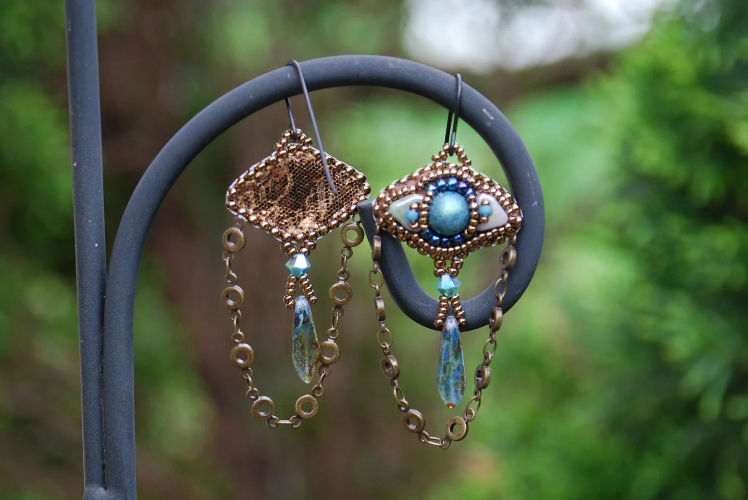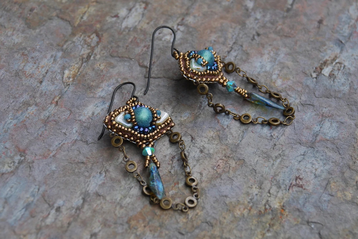 Rock n' Roll bead embroidered earrings, teal, bronze, blue. One of a kind, with seed beads, swarovski crystal, chains, and dagger. Brass ear wires. Backed with metallic copper leather. Approx. 2.5" total length.