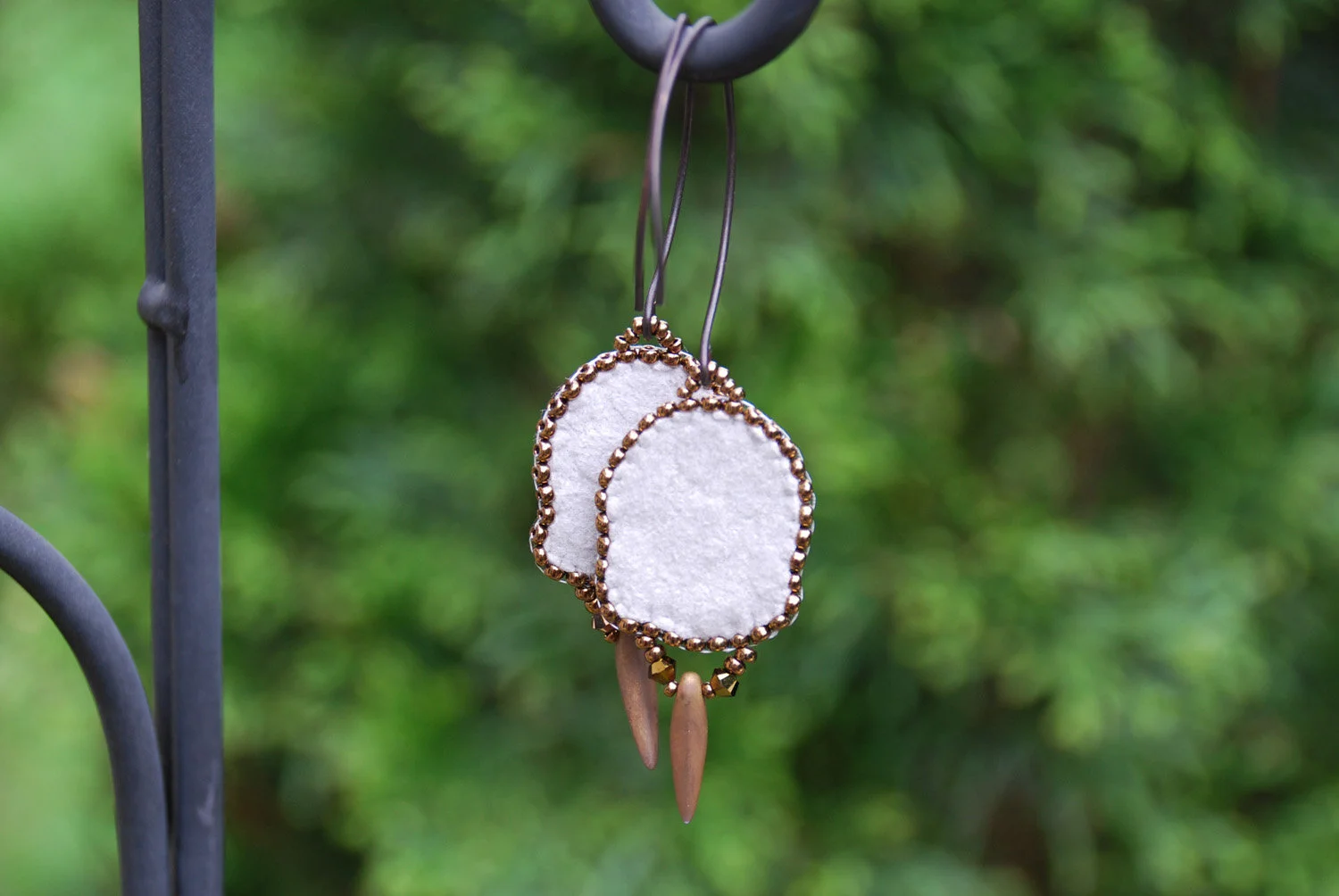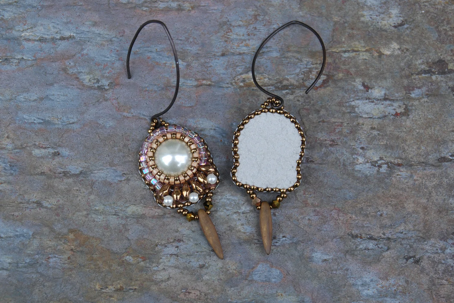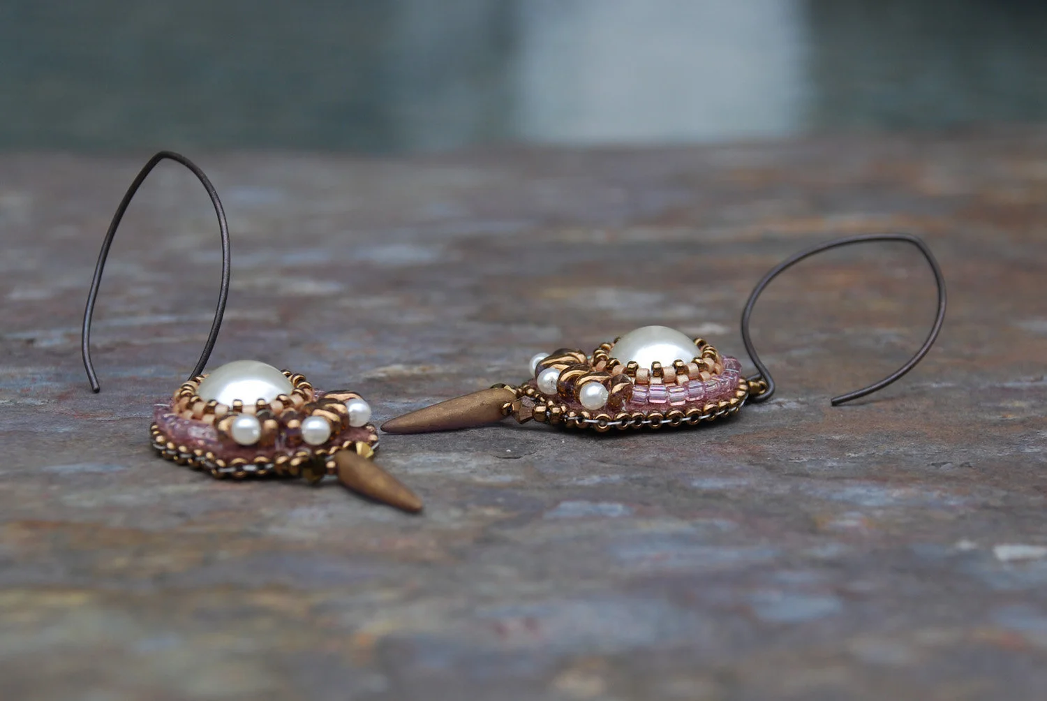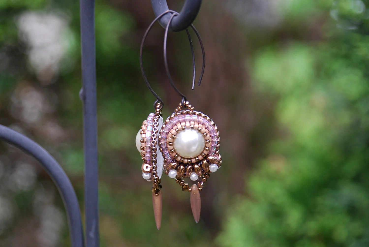 Elegant bead embroidered earrings, light pink, taupe, gold, neutral colors. One of a kind, with glass pearls, seed beads and dagger. Brass ear wires. Backed with gray ultra-suede. Approx. 3" total length.