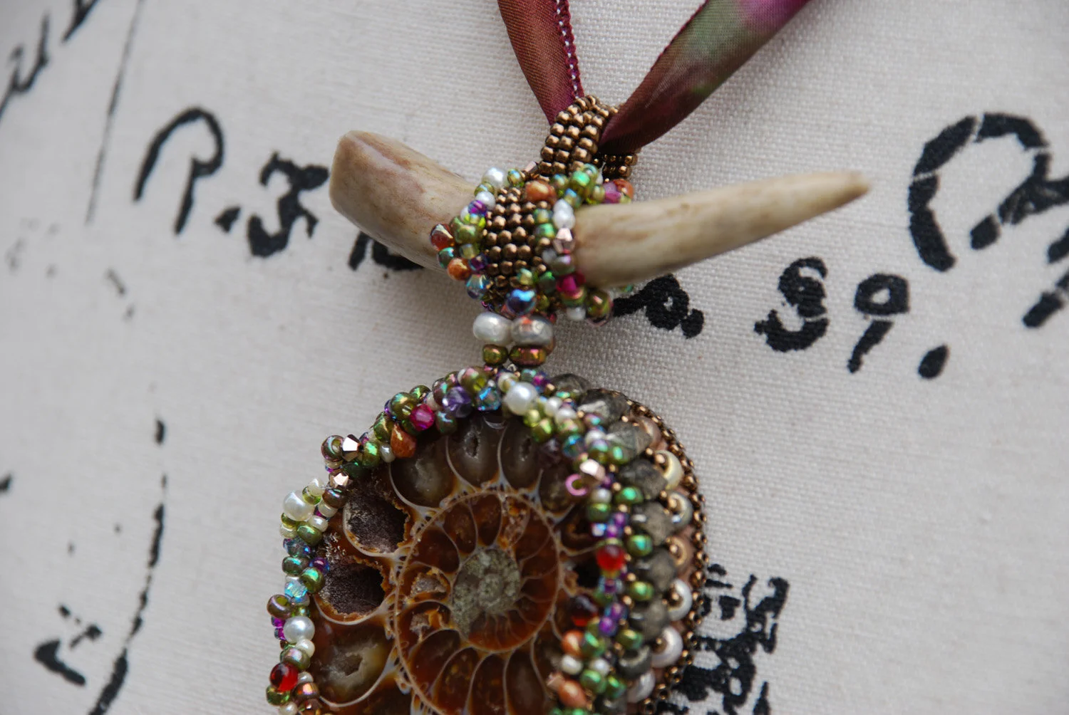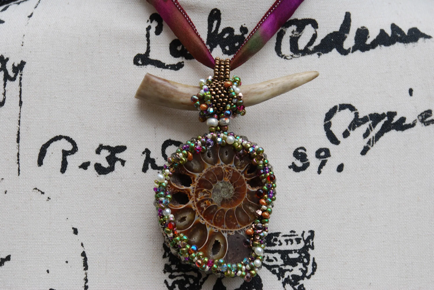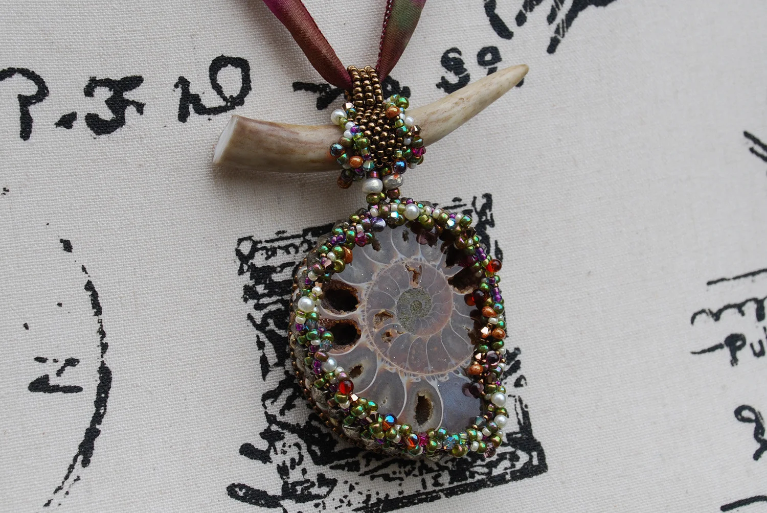 Between Land and Sea - Ammonite Bead Embroidered Pendant