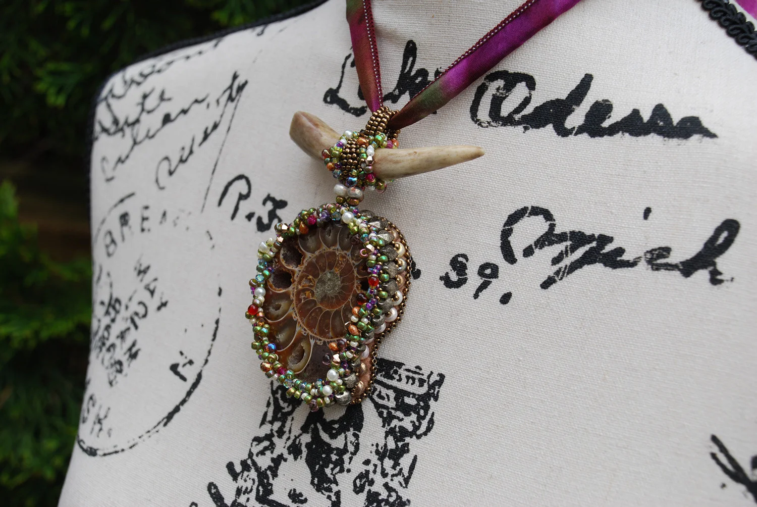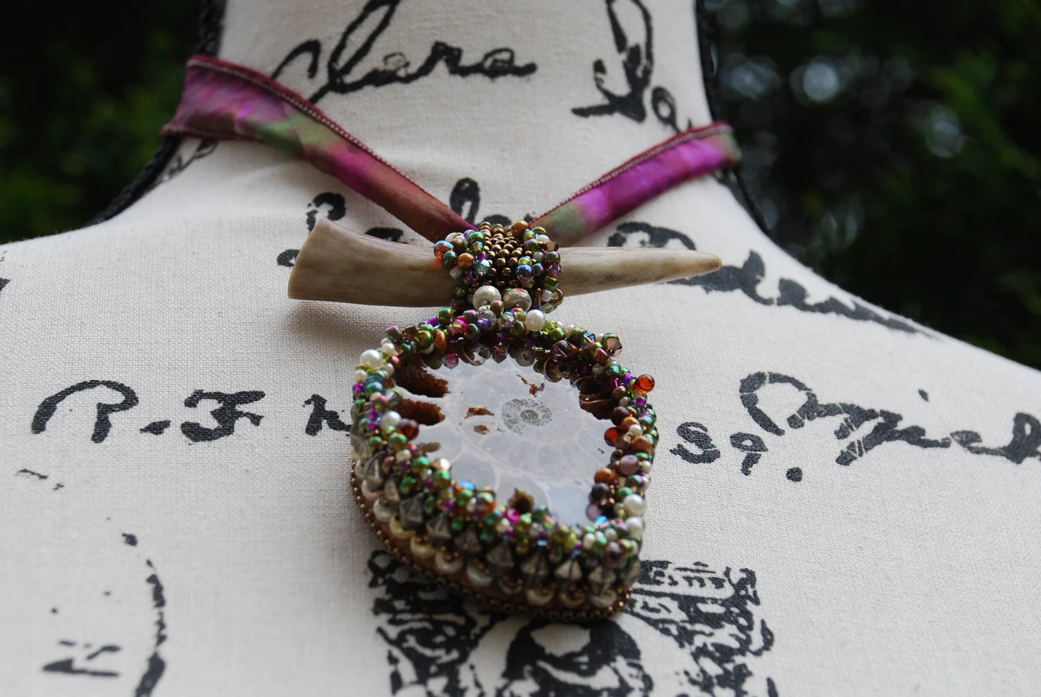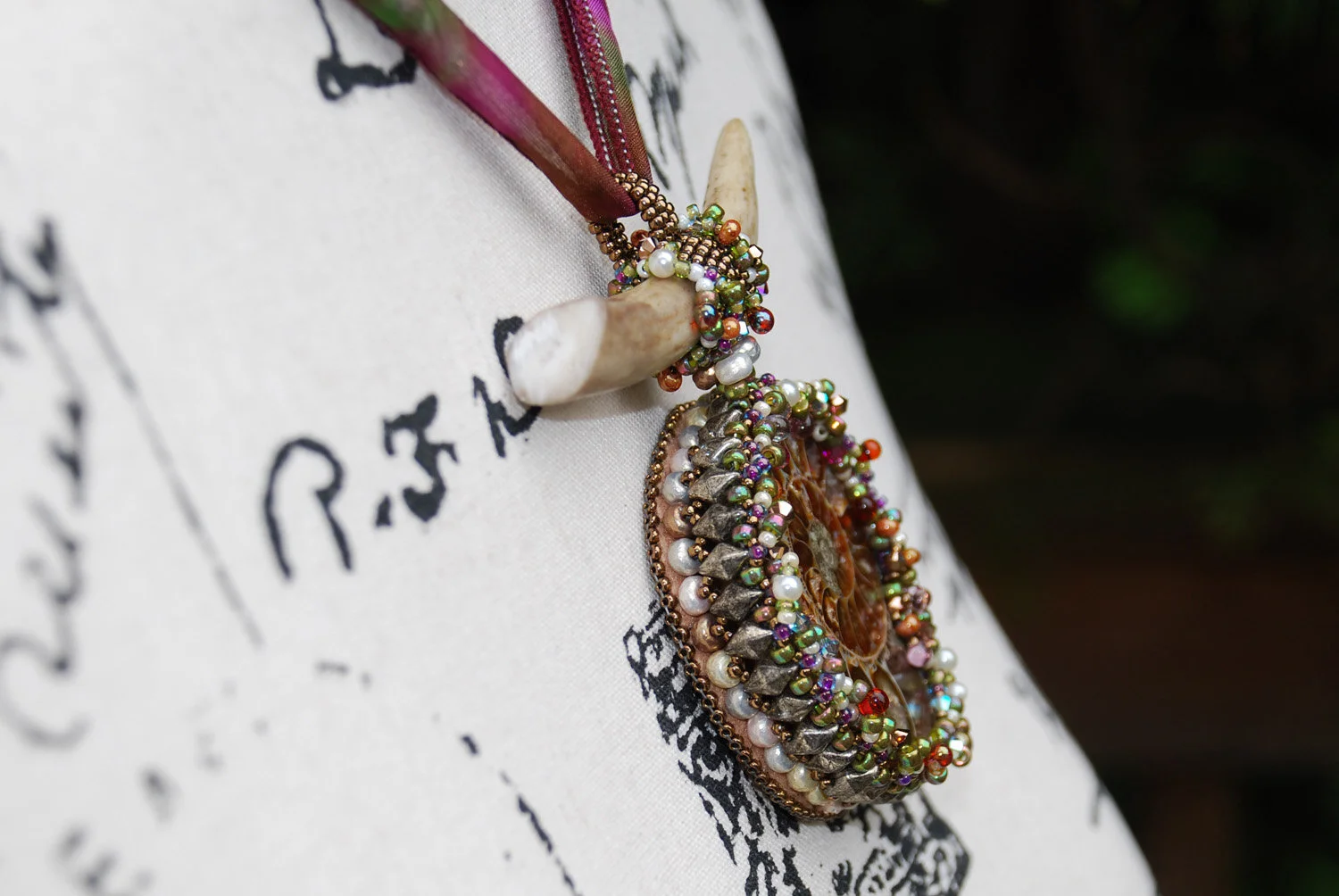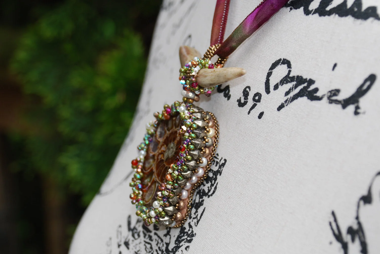 Between Land and Sea - Ammonite Bead Embroidered Pendant