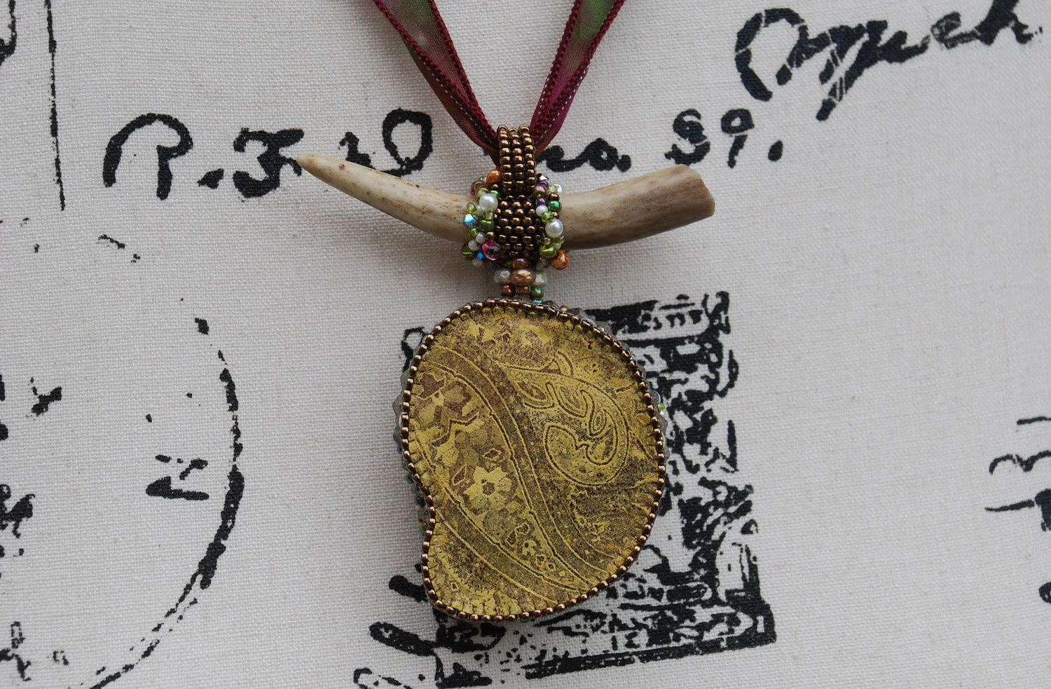 Between Land and Sea offers blessings from both. The base features an Ammonite fossil, an extinct group of marine mollusk. This piece contains several druzy crystal pockets, these are the holes that you see. The Ammonite is a powerful earth healing fossil, and it's spiral shape represents continual change. It has been embroidered with multi-colored glass beads and crystals to look as if time has gifted the fossil, encrusting it with gems. Placed above the Ammonite hangs a piece of deer antler. The deer is a sacred animal with the spirit of gentleness, antlers are a symbol of regeneration. Hangs from a hand dyed silk ribbon. Backed with high quality leather printed with gold metallic paisleys.