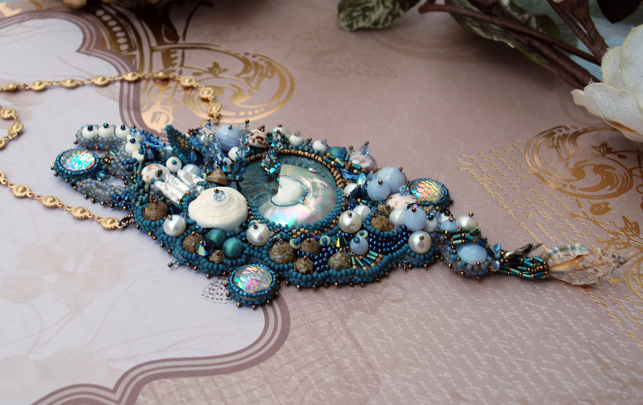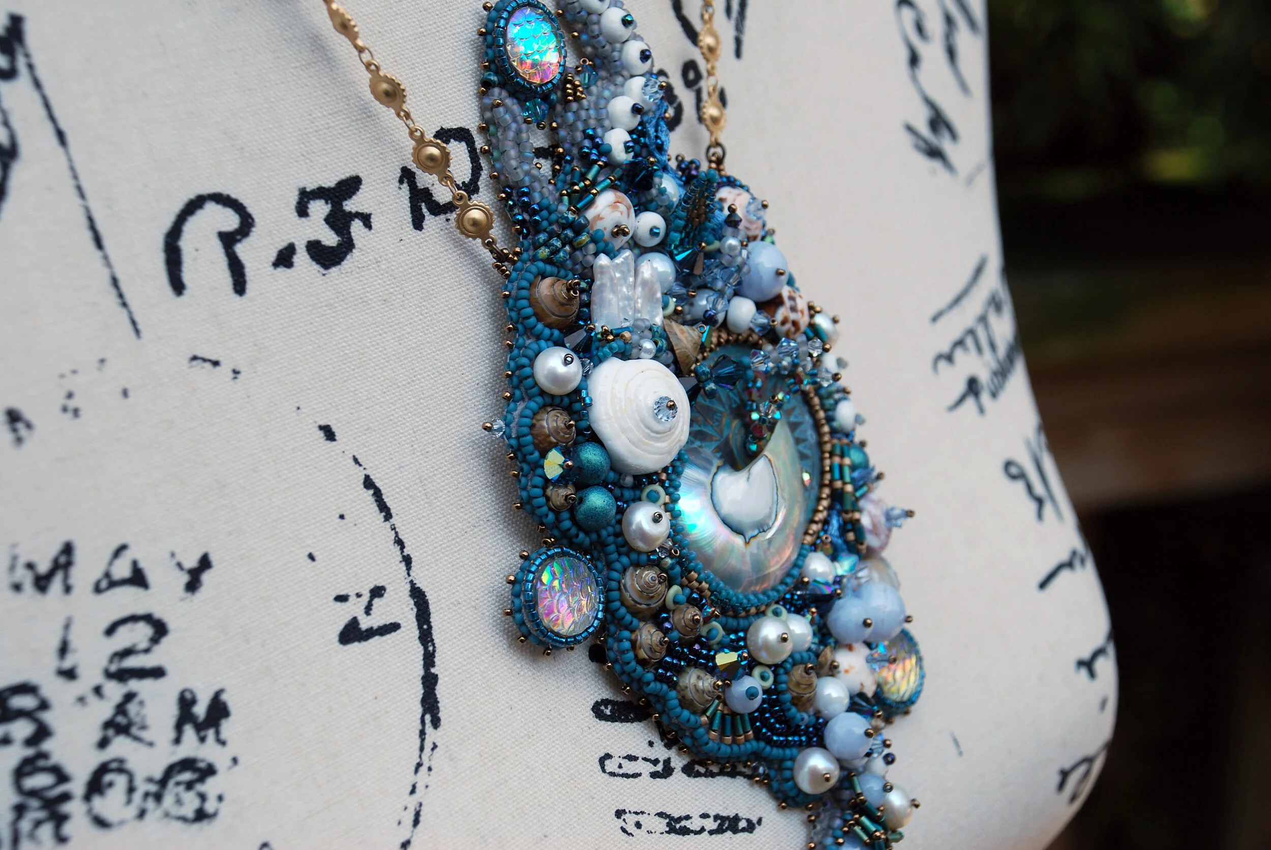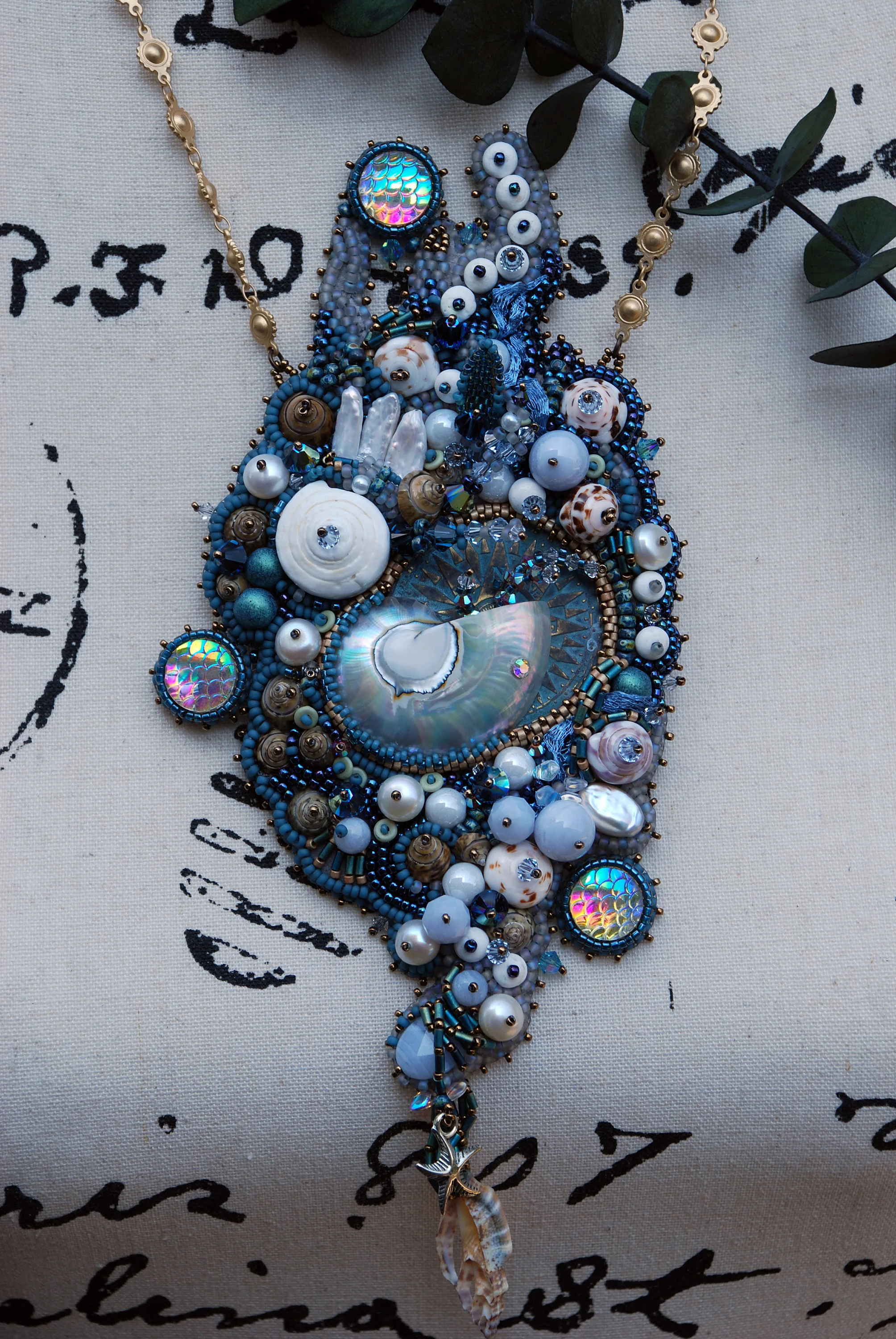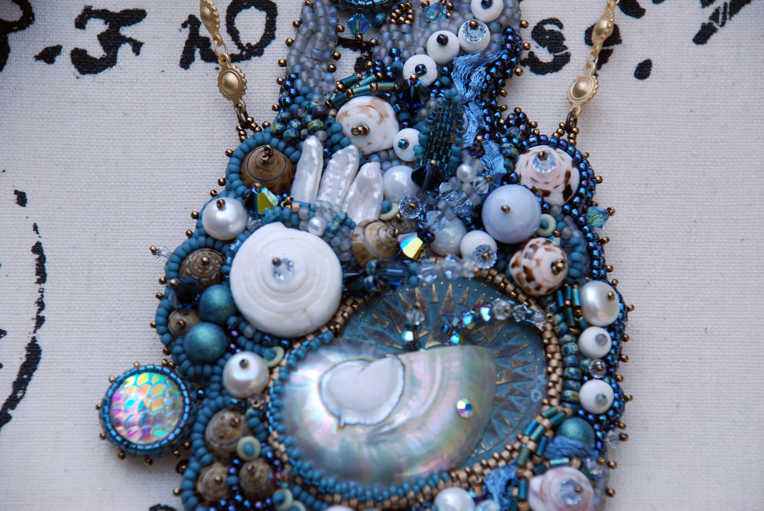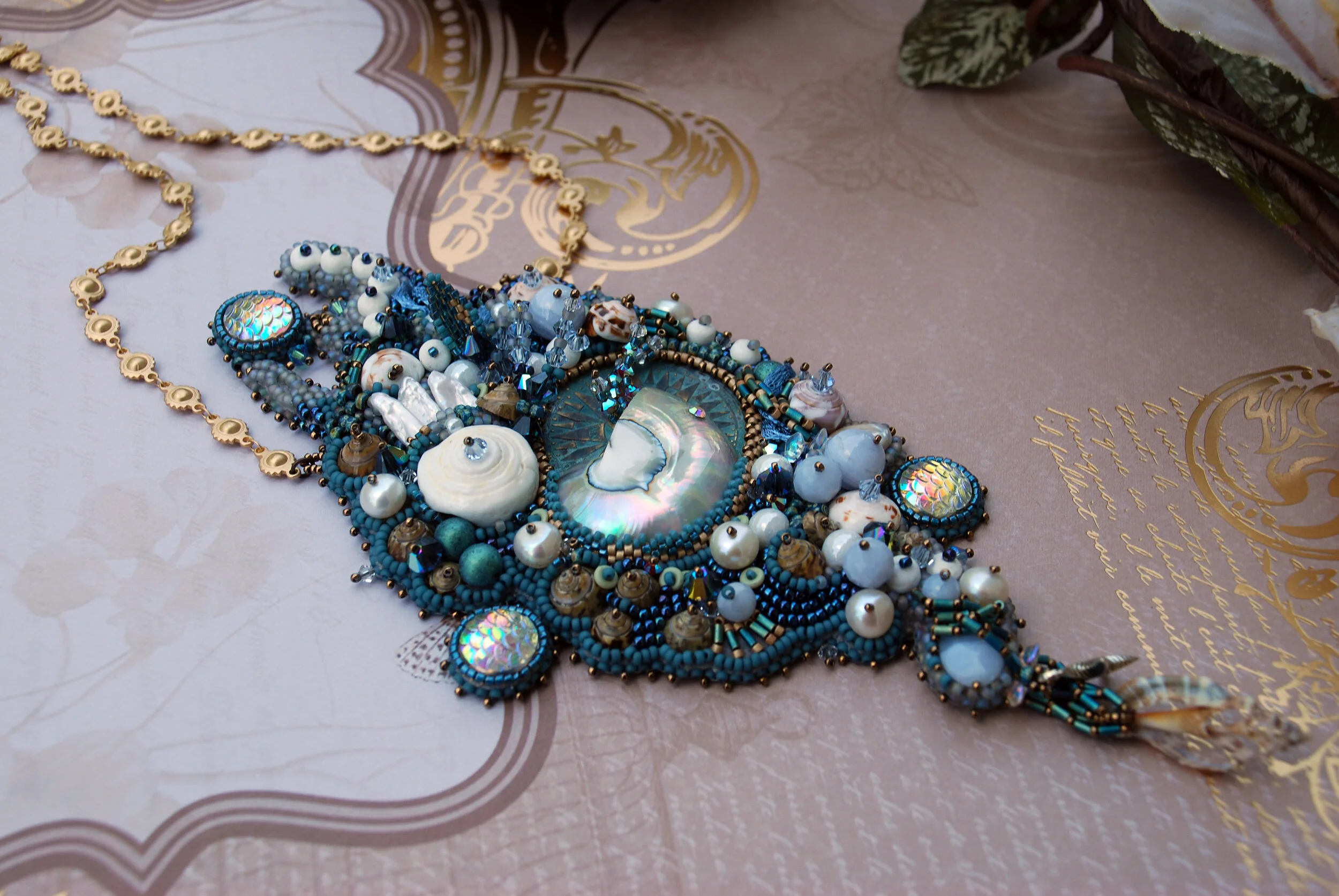 This bead embroidered necklace is made from an assortment of hand selected beautiful components. The focal is a beautiful Nautilus Shell (that are no longer being exported) and a metal compass component. Blue Lace agate stones, Australian crystals, freshwater pearls, wire lace, starfish charm, czech mates, mermaid scale cabs, and shells. Some of the elements are from Maui. This necklace is perfect for all you mermaids out there! Ideal for a beach wedding or wearing around a beach town. Matte brass sun chain. Lobster clasp. Backed with gray stone embossed ultra-suede. Chain is 16" in length. Pendant is 8" x 3.5".
