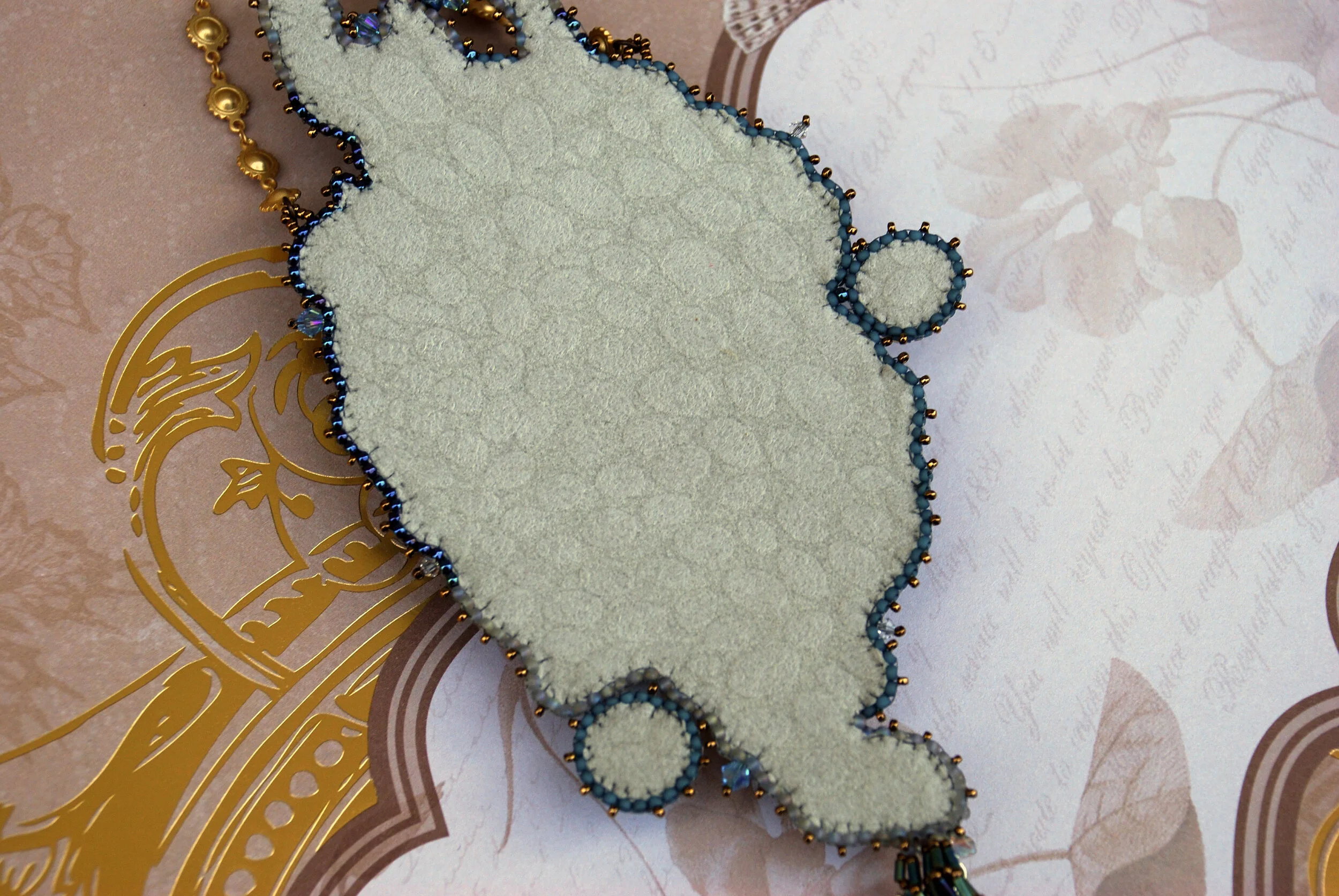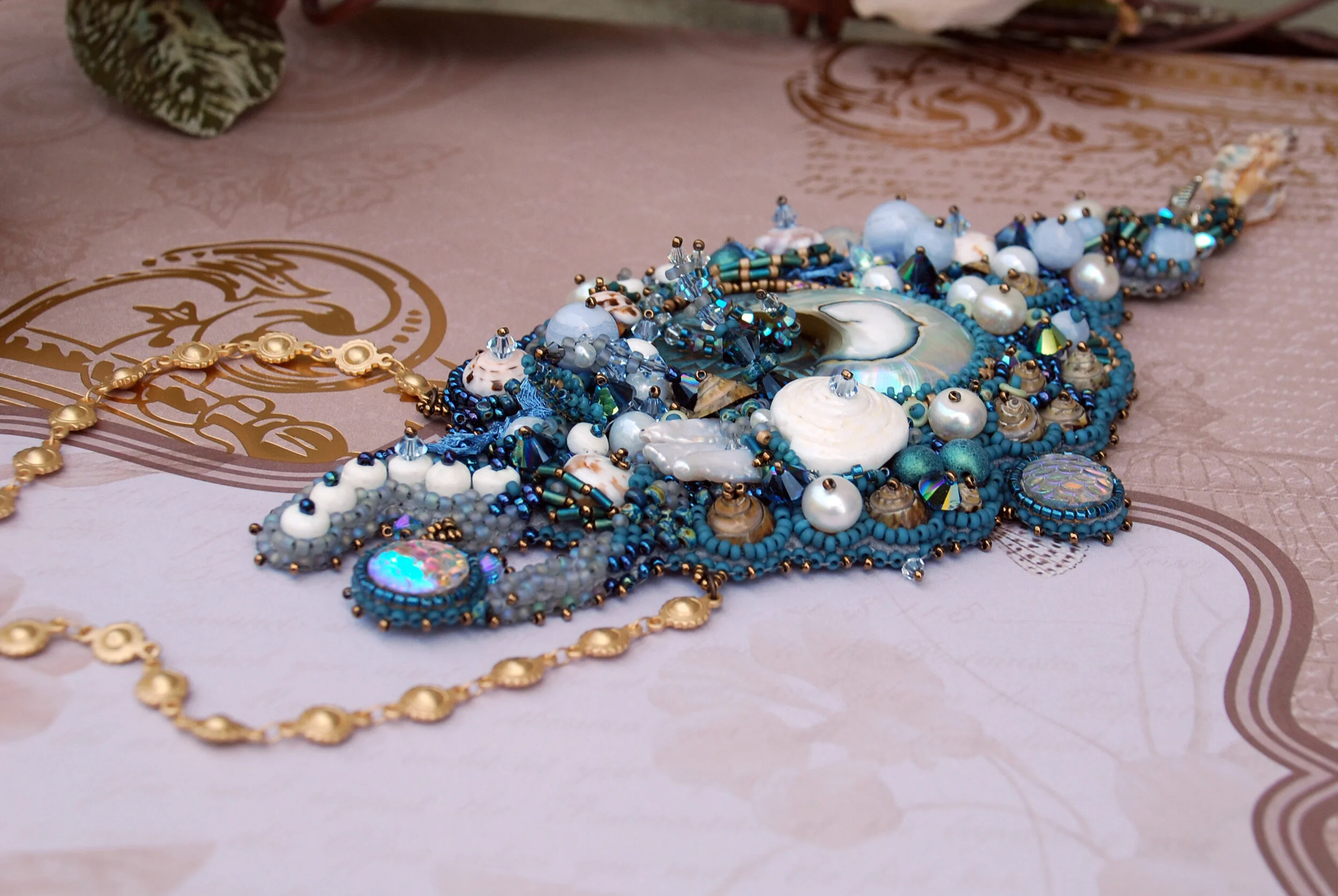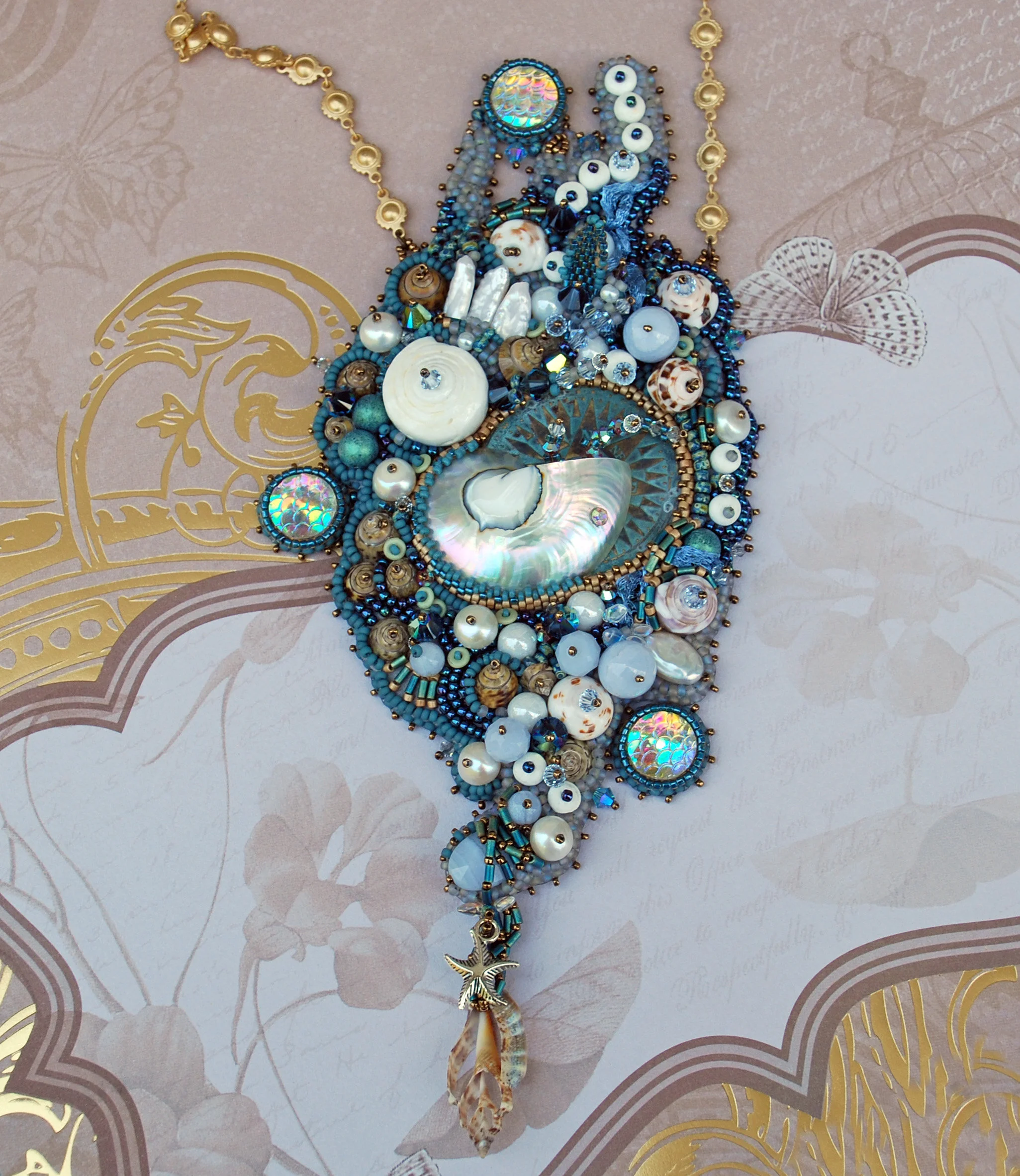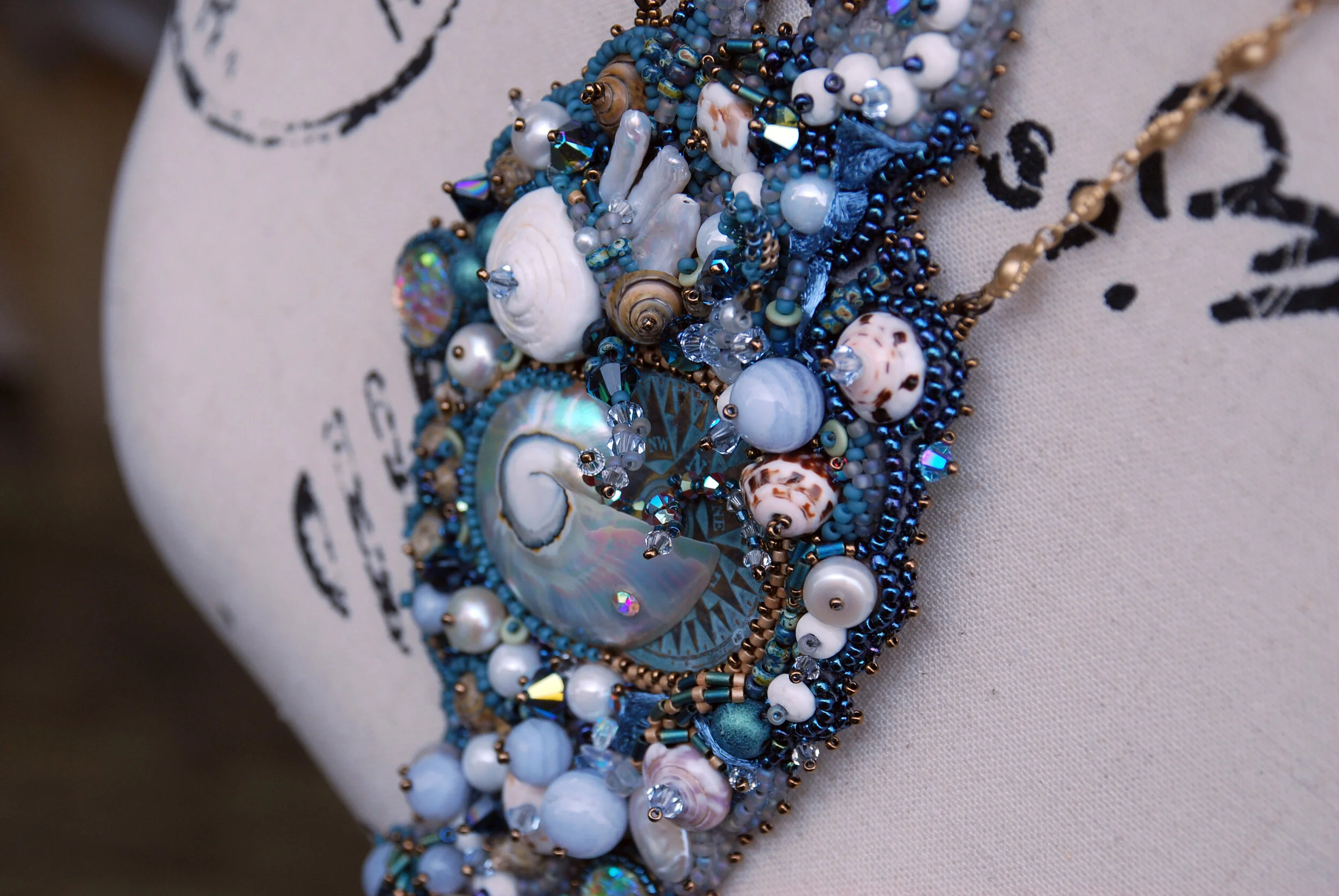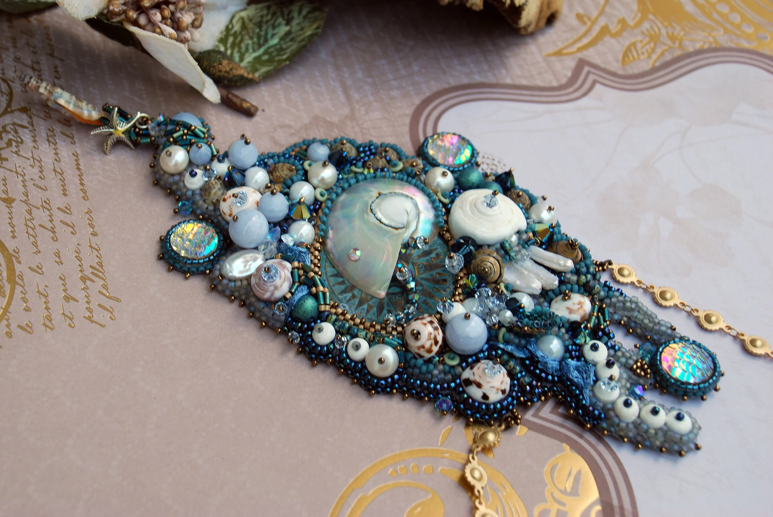 This bead embroidered necklace is made from an assortment of hand selected beautiful components. The focal is a beautiful Nautilus Shell (that are no longer being exported) and a metal compass component. Blue Lace agate stones, Australian crystals, freshwater pearls, wire lace, starfish charm, czech mates, mermaid scale cabs, and shells. Some of the elements are from Maui. This necklace is perfect for all you mermaids out there! Ideal for a beach wedding or wearing around a beach town. Matte brass sun chain. Lobster clasp. Backed with gray stone embossed ultra-suede. Chain is 16" in length. Pendant is 8" x 3.5".