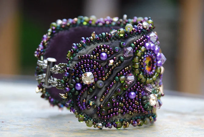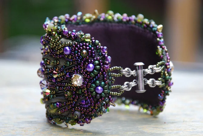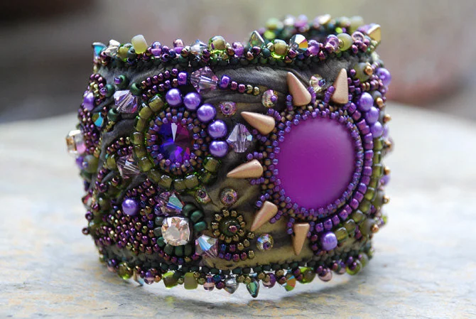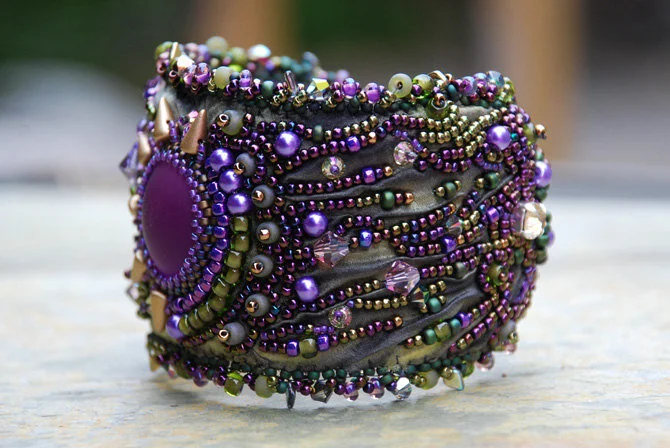 Dust in the Wind is a hand made one of a kind original creation. Made with olive green variegated shibori silk, purple luna cabochon, matte gold spikes, Swarovski crystals, glass pearls, and seed beads. Interior is lined with purple leather. Size: 2 and 1/4" wide, 7 and 1/2" long. Slide clasp.