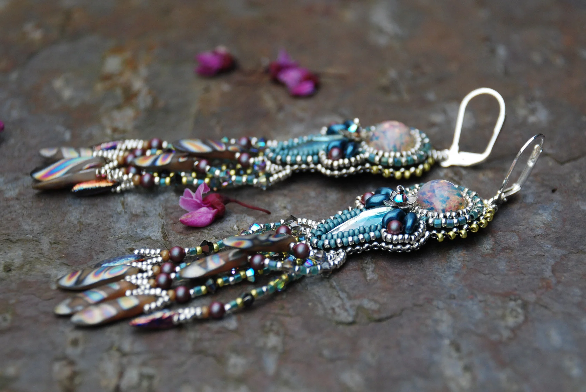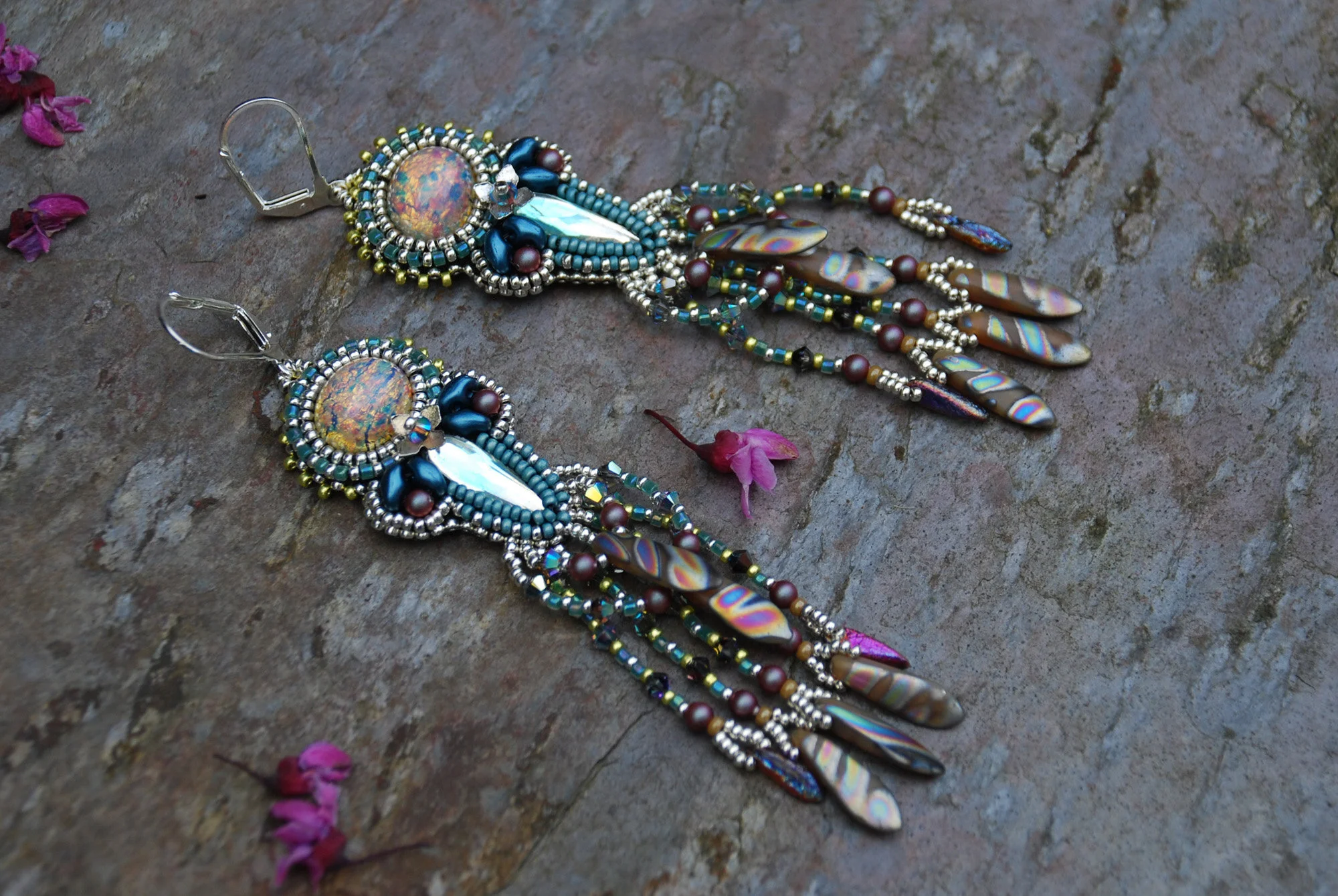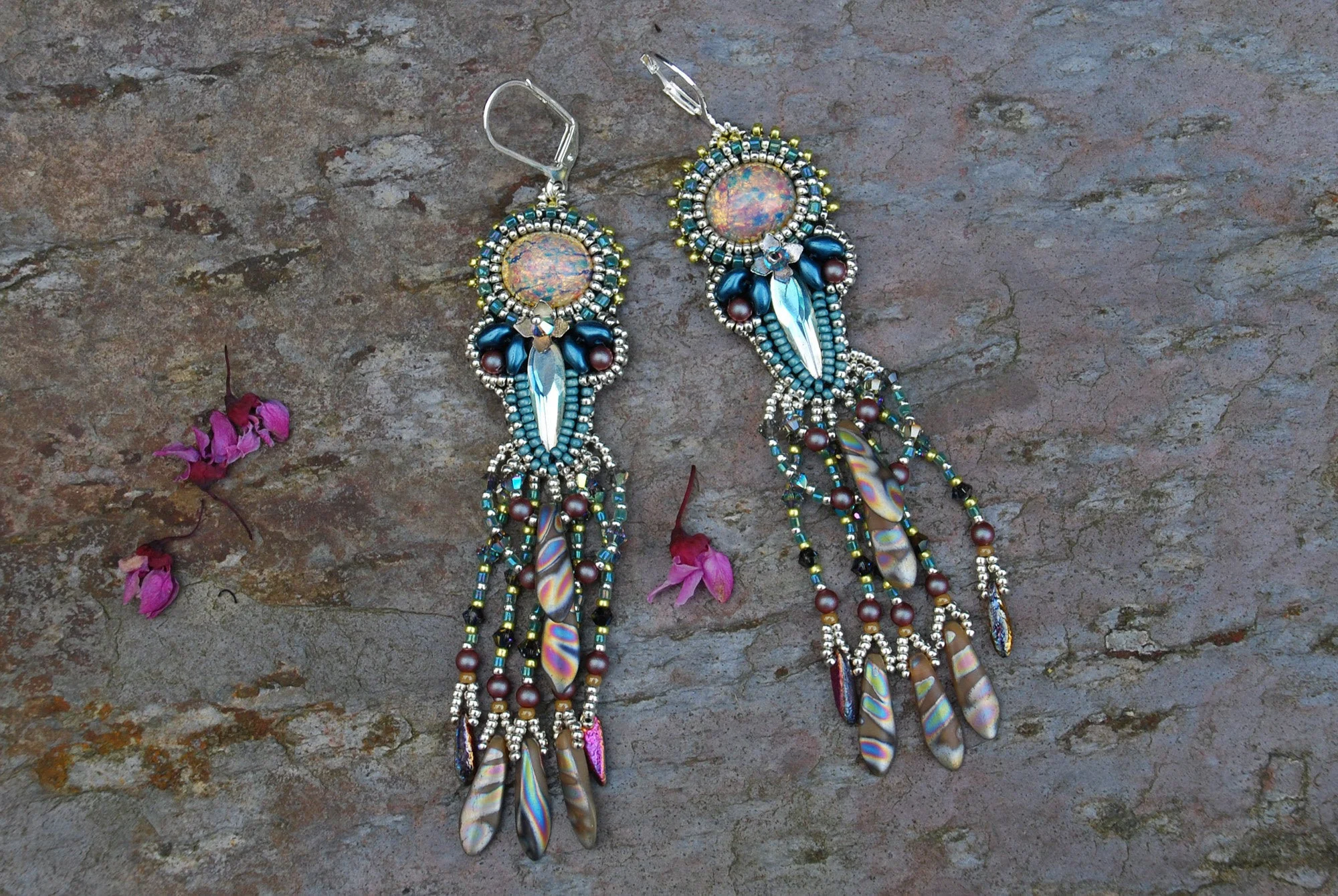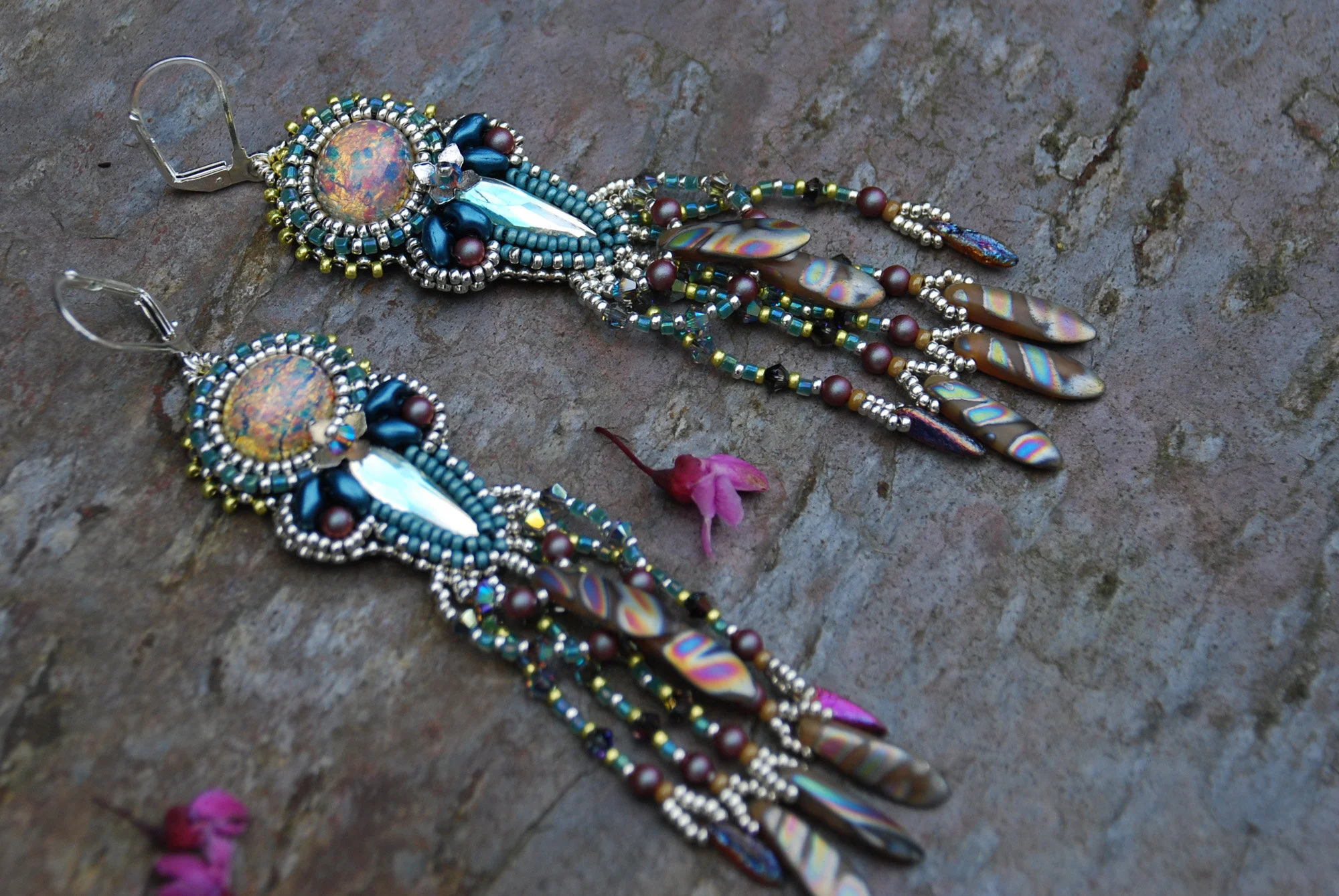 Grand Horizon bead embroidered earring will be a great reminder for those who like to travel, view spectacular sunsets, sunrises, all those beautiful skylines no matter where you are. One of a kind, made with seed and dagger beads, Swarovski crystals and pearls and vintage glass cabochons. Silver plated leaver back ear wires. Backed with black ultra-suede. 4 inches in length. Silver accents.