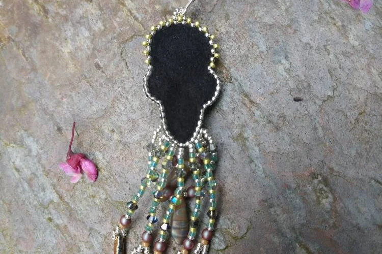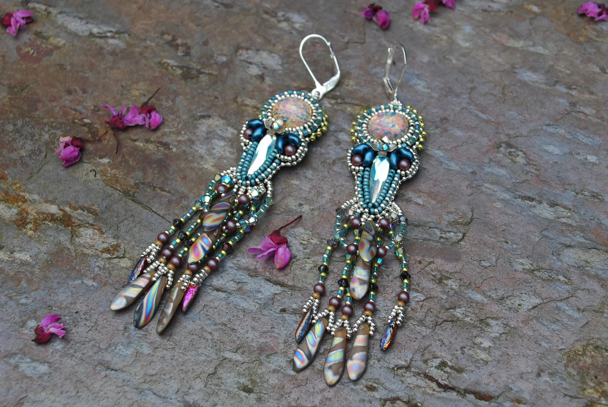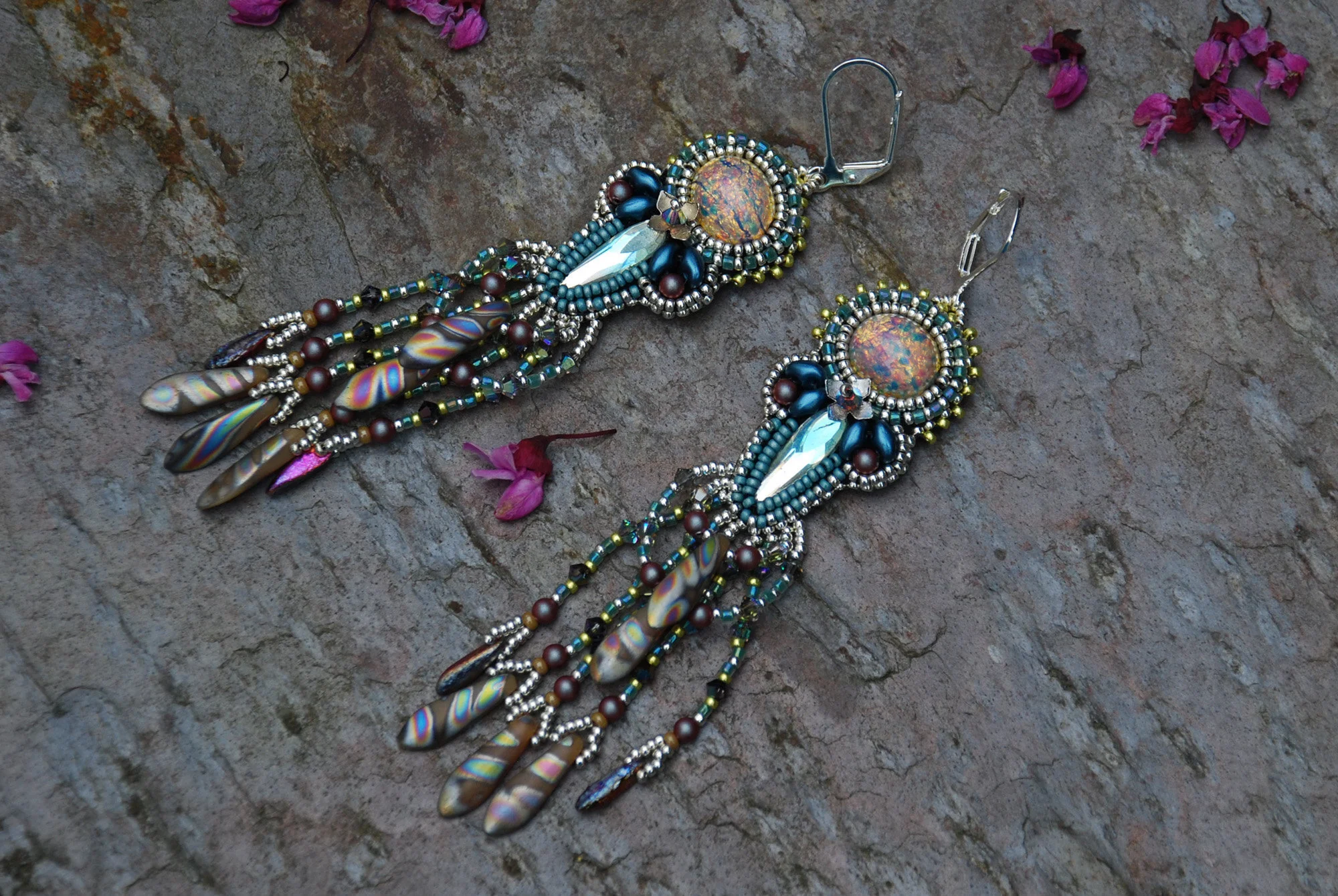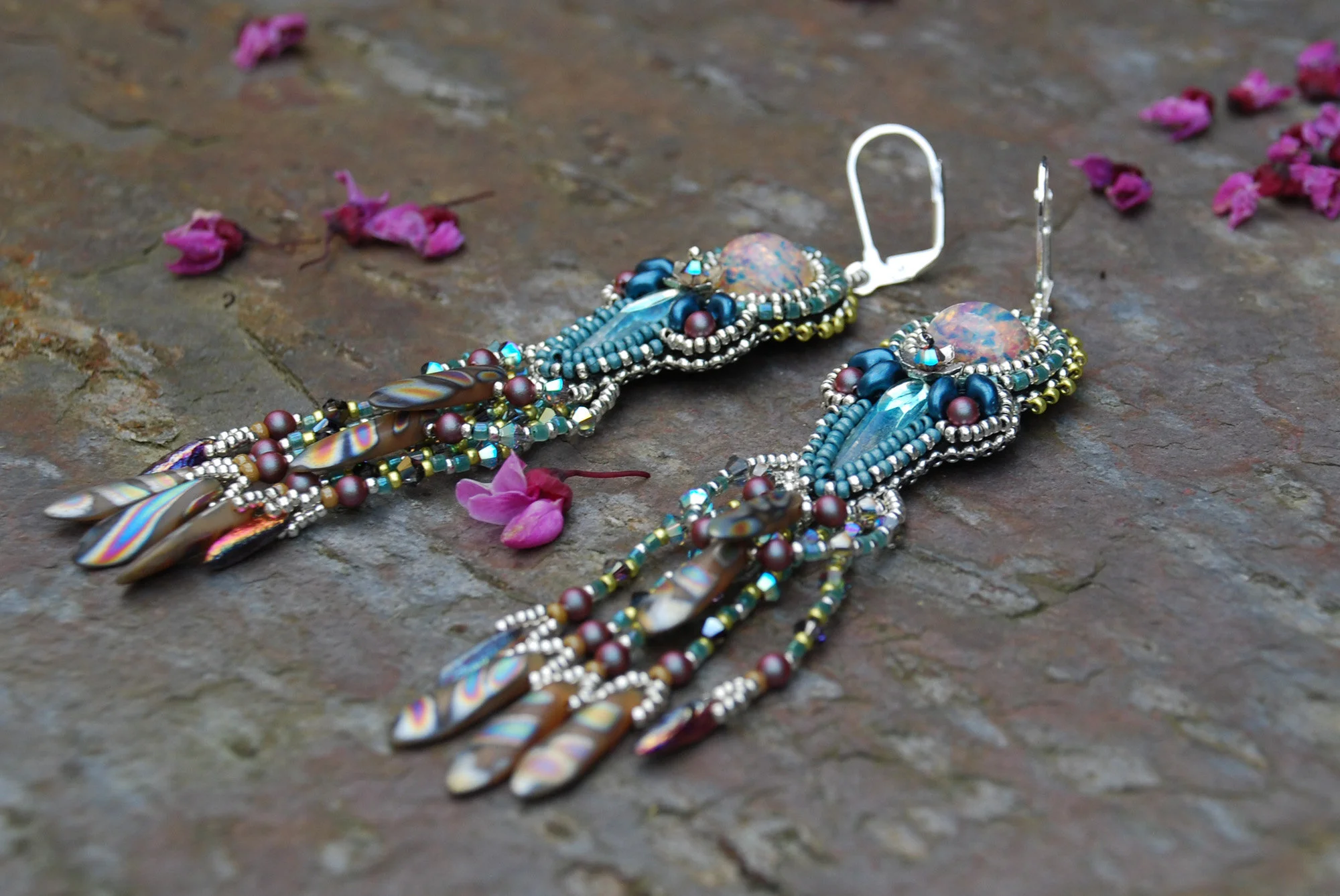 Grand Horizon bead embroidered earring will be a great reminder for those who like to travel, view spectacular sunsets, sunrises, all those beautiful skylines no matter where you are. One of a kind, made with seed and dagger beads, Swarovski crystals and pearls and vintage glass cabochons. Silver plated leaver back ear wires. Backed with black ultra-suede. 4 inches in length. Silver accents.