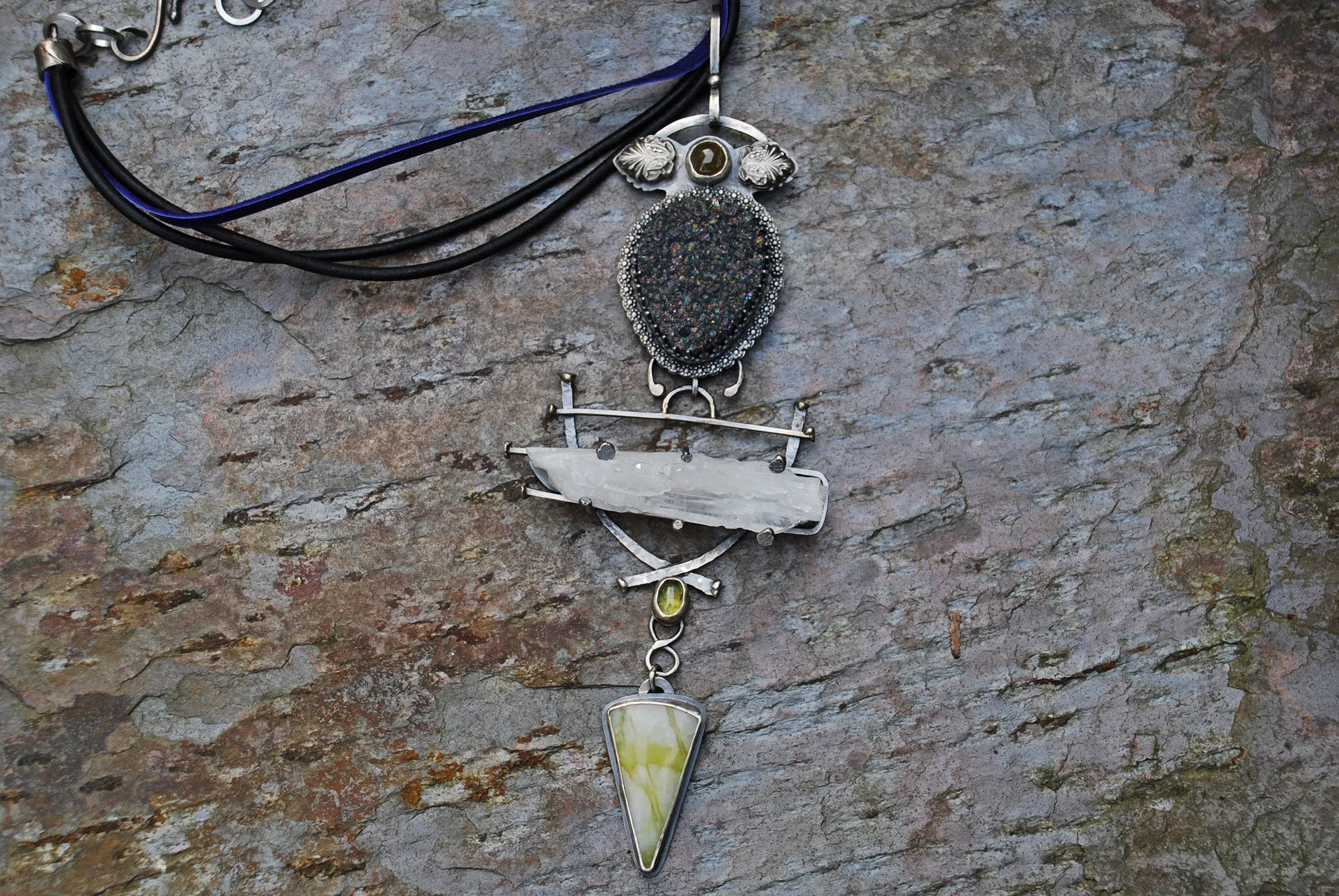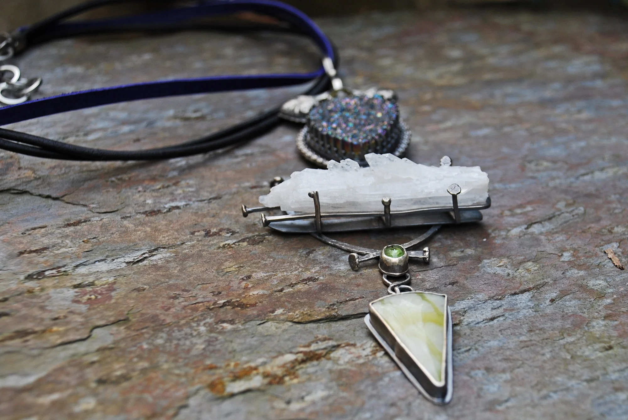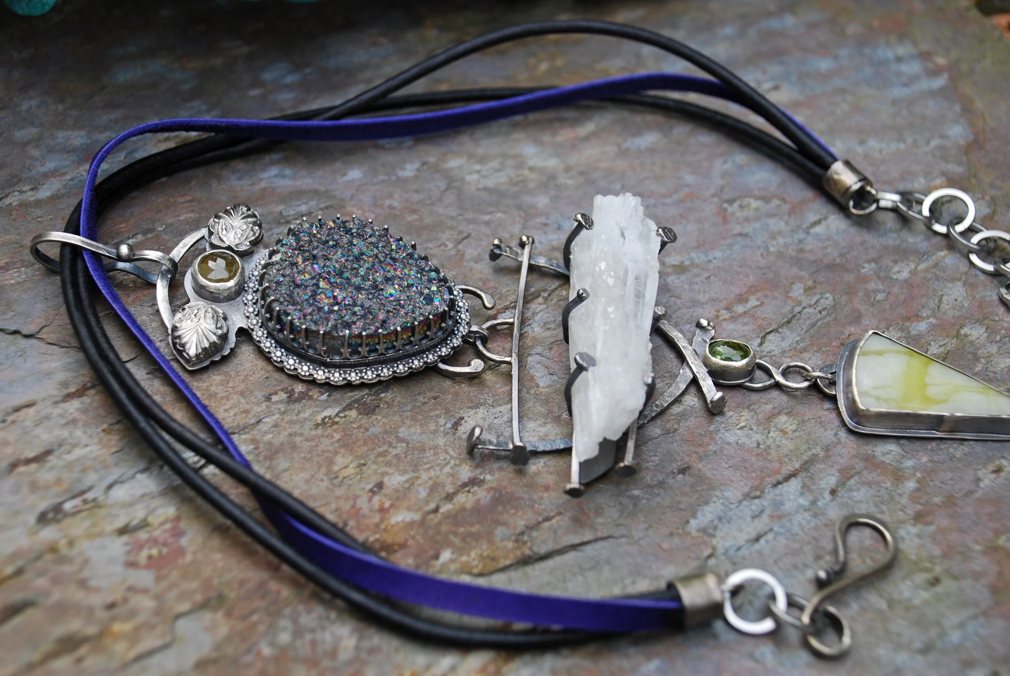 The Last Snow is modern industrial with a hints of nature. Titanium coated quartz druzy encased in gallery wire, surrounded by floral wire. Natural quartz hangs horizontally surrounded and caged by sterling nails. Hints of green appear as peridot and vesuvianite make an appearance. Last but not least, Bamboo Forest Jade in the shape of a triangle points towards the rich soil. Lots of beautiful details throughout this piece. 100% handmade by me. One of a kind, you'll not find another! 16" leather cords in black and purple, sterling end-caps and S-shaped hook. 2" extension.