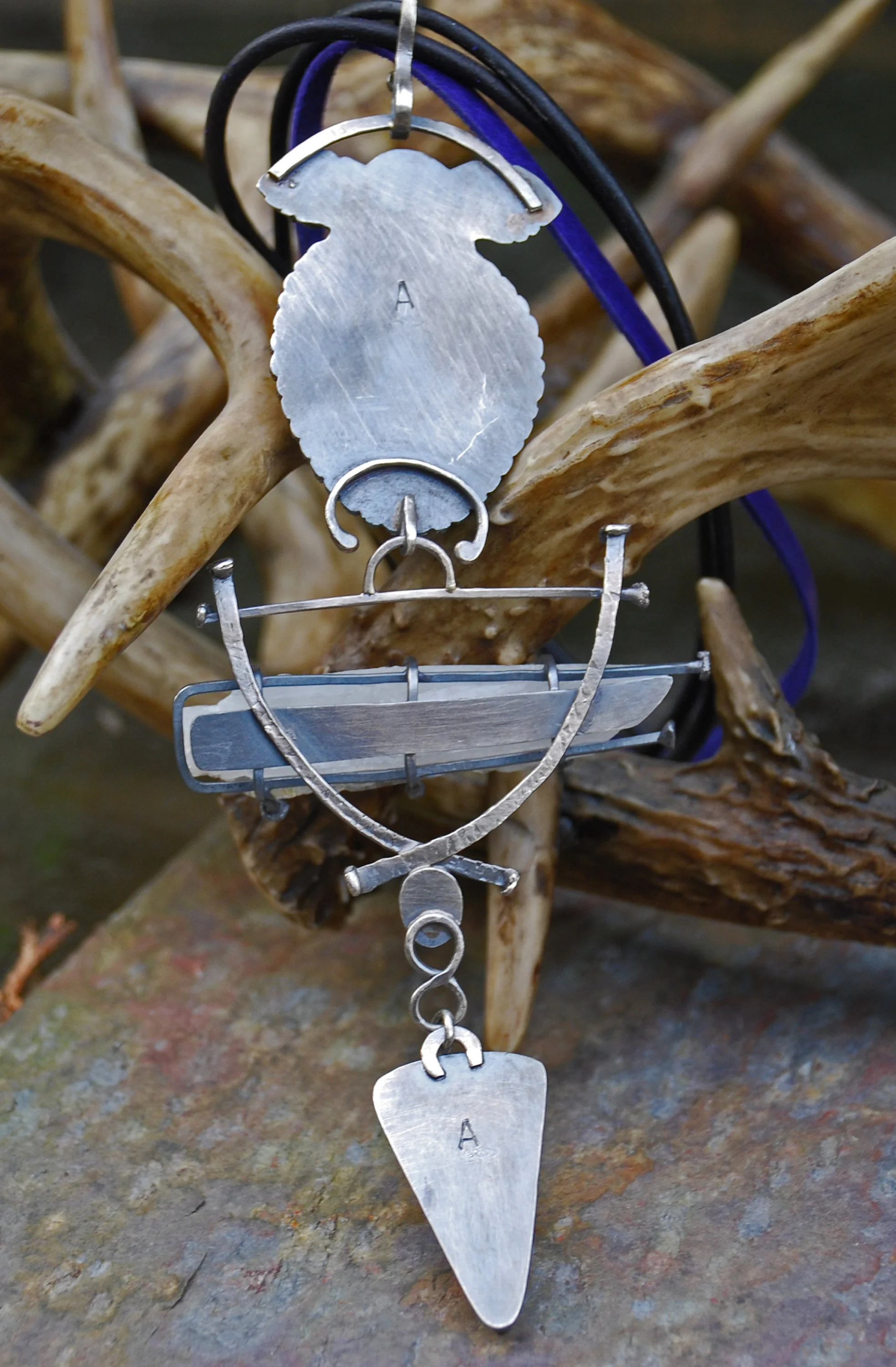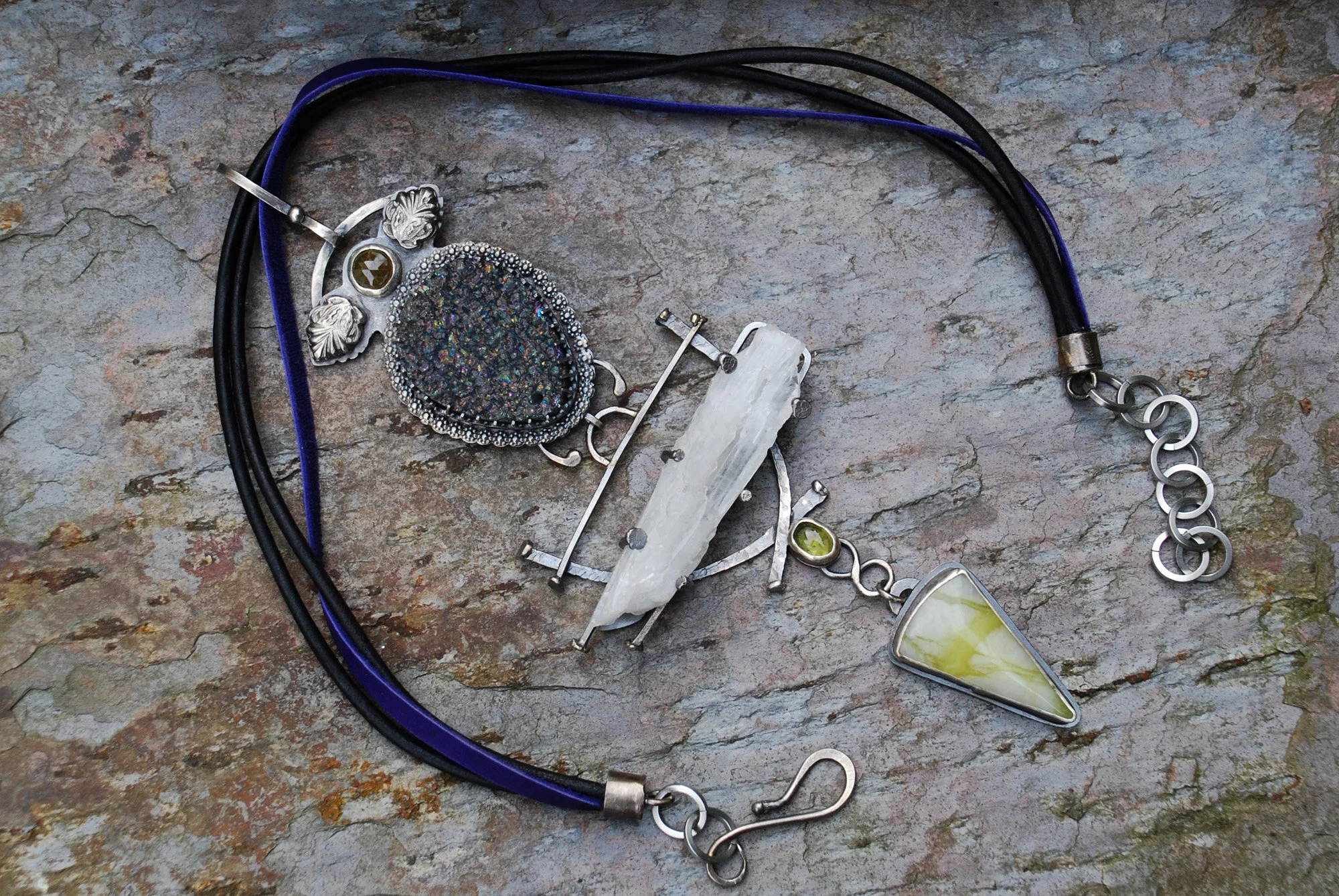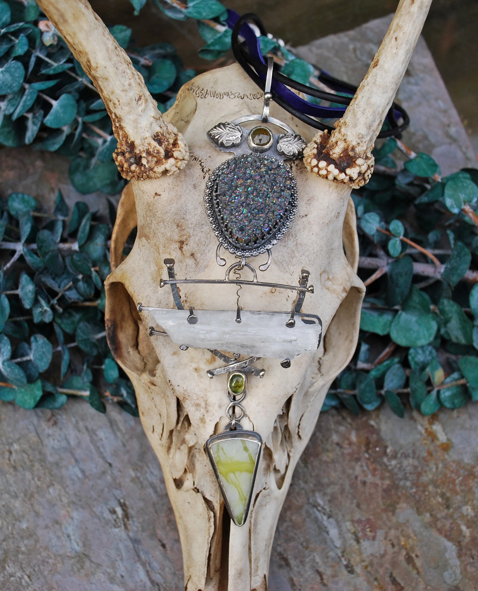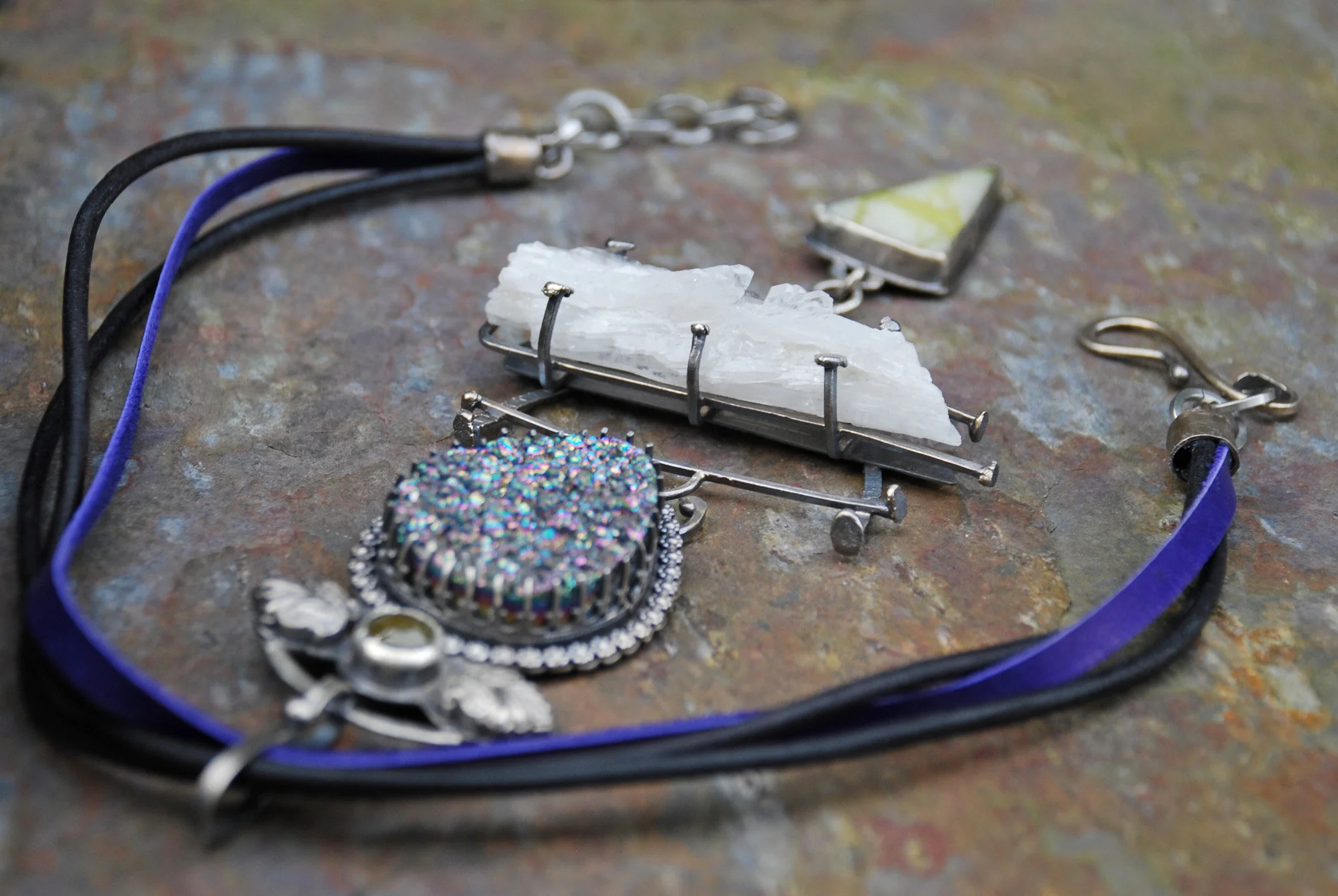 The Last Snow is modern industrial with a hints of nature. Titanium coated quartz druzy encased in gallery wire, surrounded by floral wire. Natural quartz hangs horizontally surrounded and caged by sterling nails. Hints of green appear as peridot and vesuvianite make an appearance. Last but not least, Bamboo Forest Jade in the shape of a triangle points towards the rich soil. Lots of beautiful details throughout this piece. 100% handmade by me. One of a kind, you'll not find another! 16" leather cords in black and purple, sterling end-caps and S-shaped hook. 2" extension.