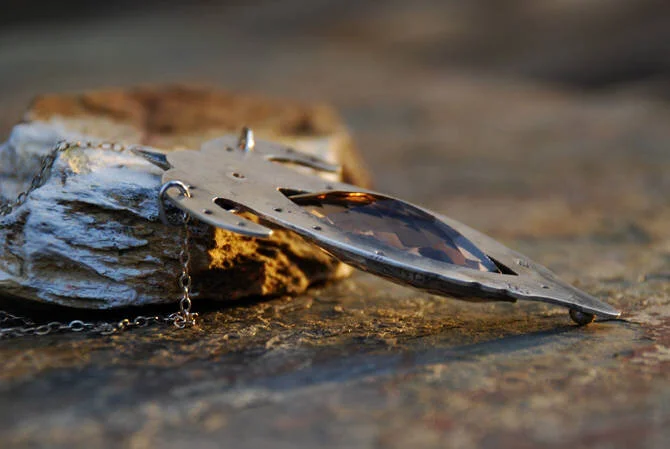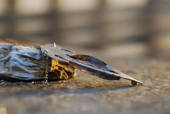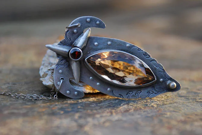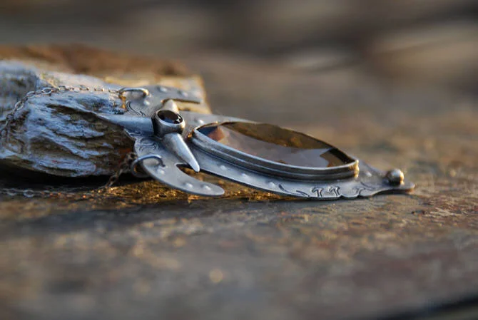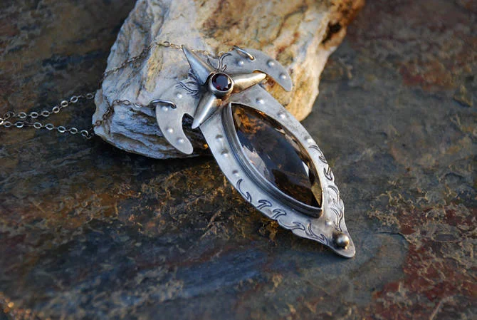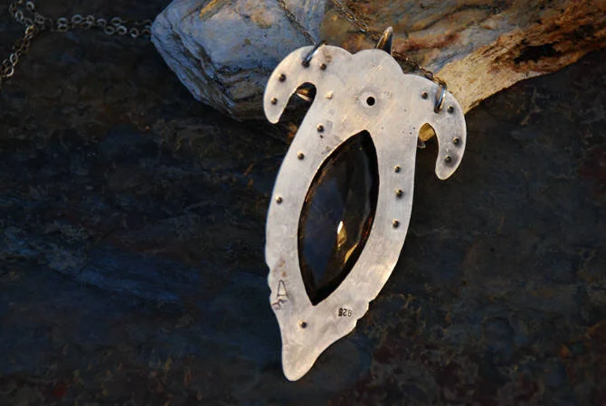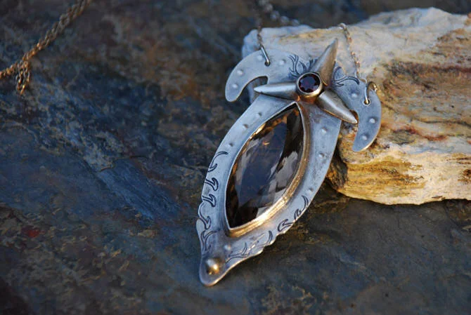 This is an original one of a kind necklace that I named the natural harlequin. It is made from sterling silver sheet, with a large faceted marquee of smokey quartz. The smokey quartz has been set in a step bezel with the back open to catch maximum light and is accented by a round faceted garnet. Hand stamped. Sterling silver chain and lobster clasp, 17". Pendant measures 2.5" in length by 1.5" wide.
