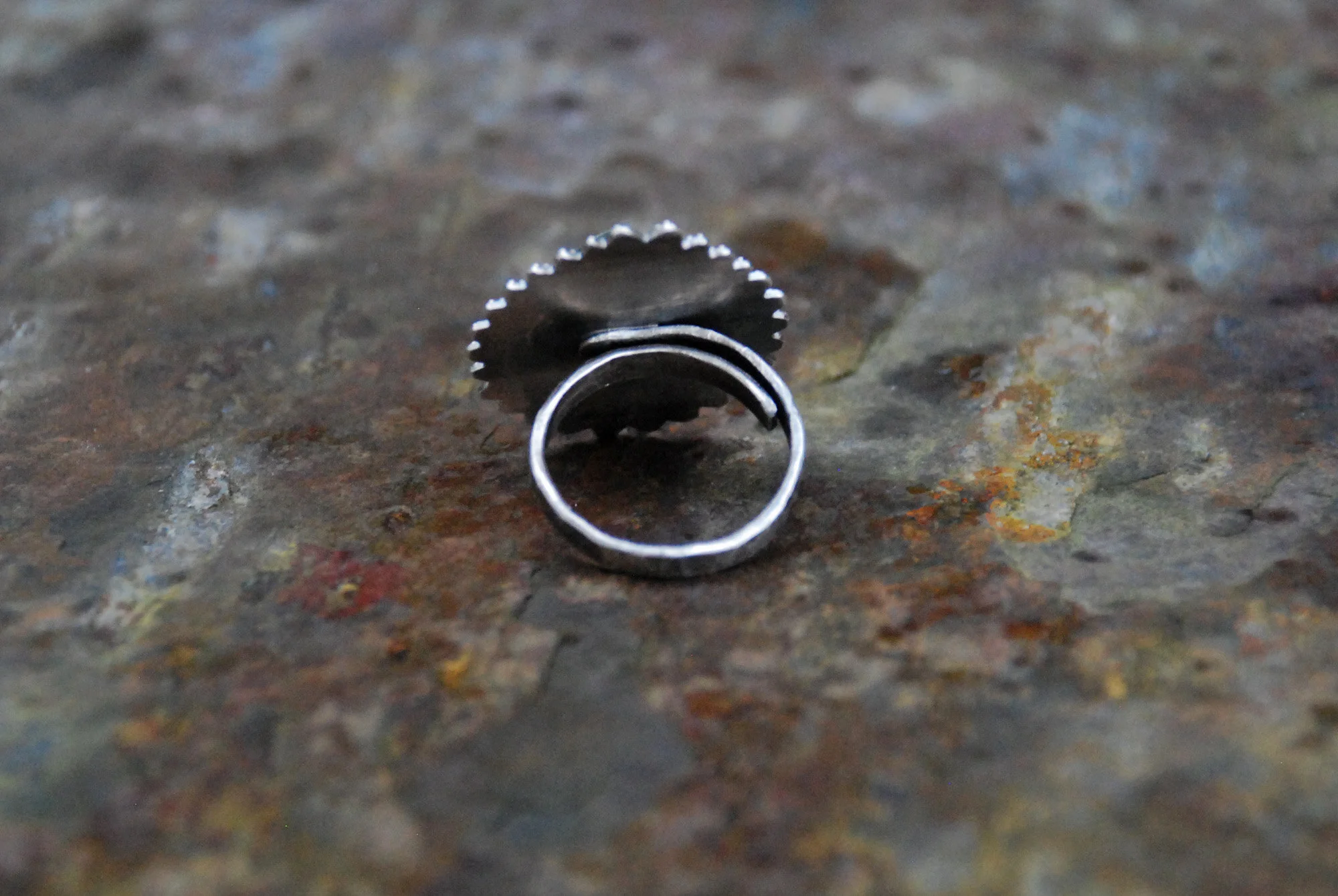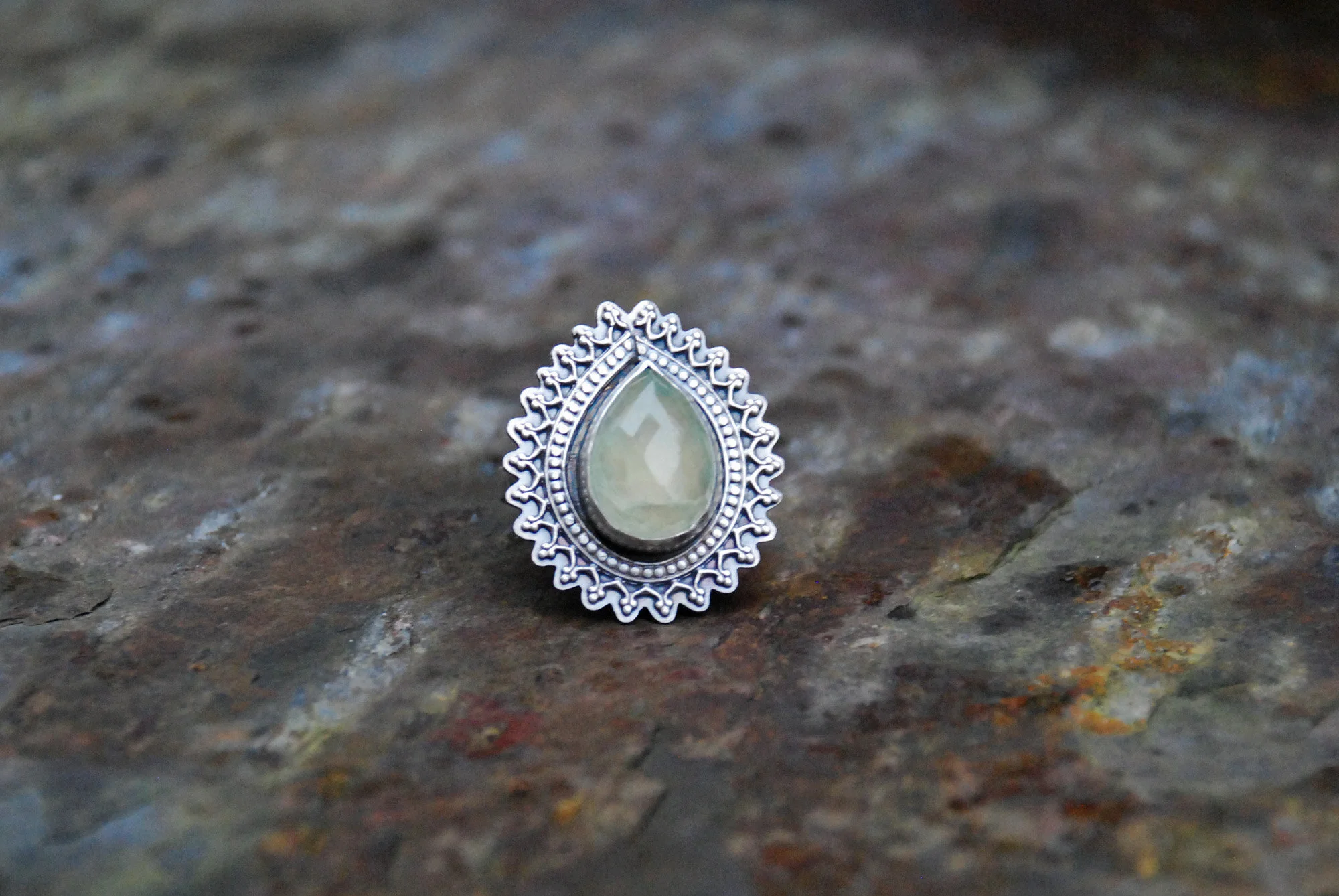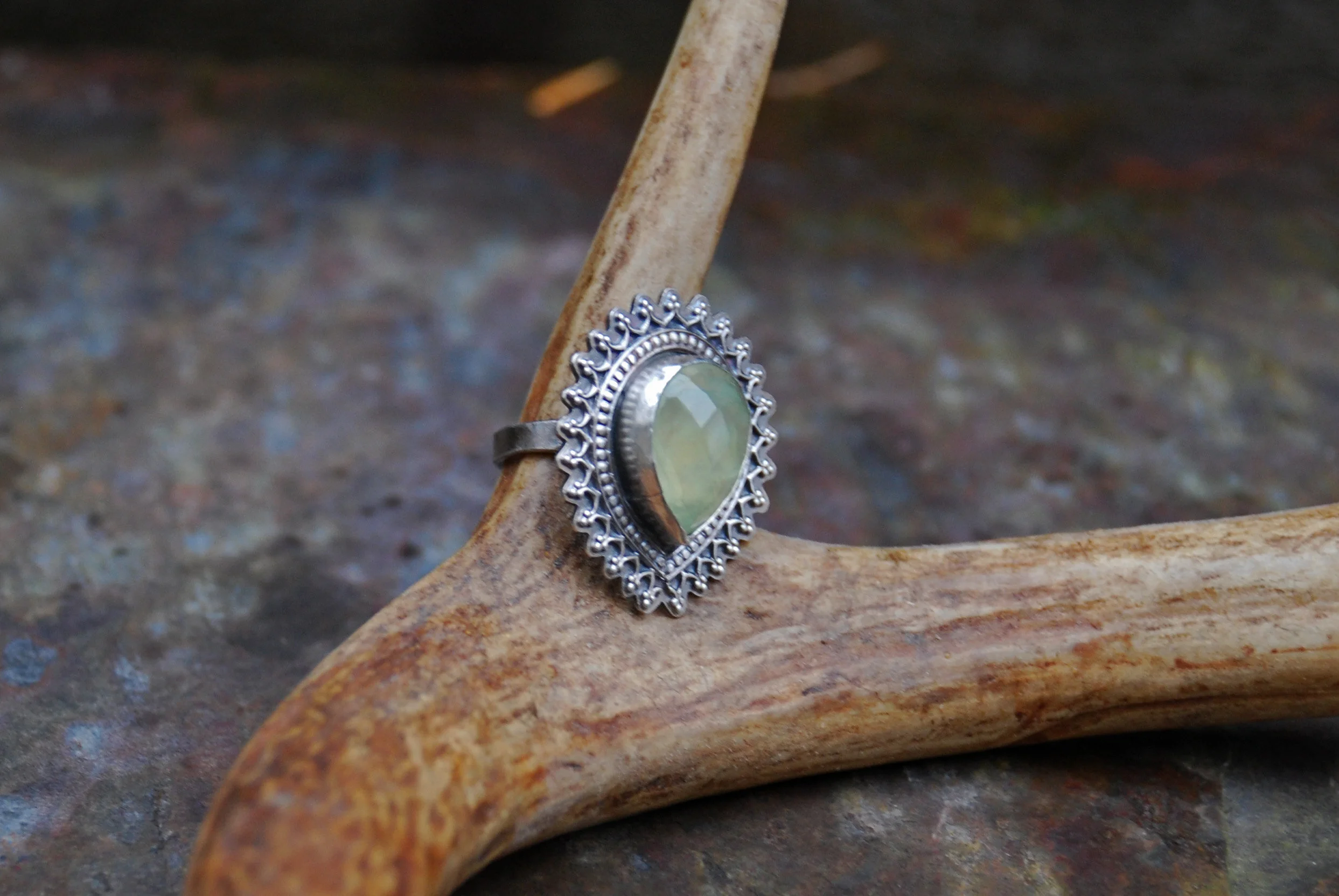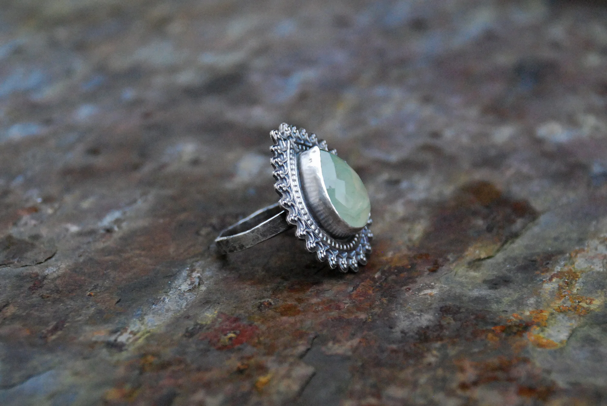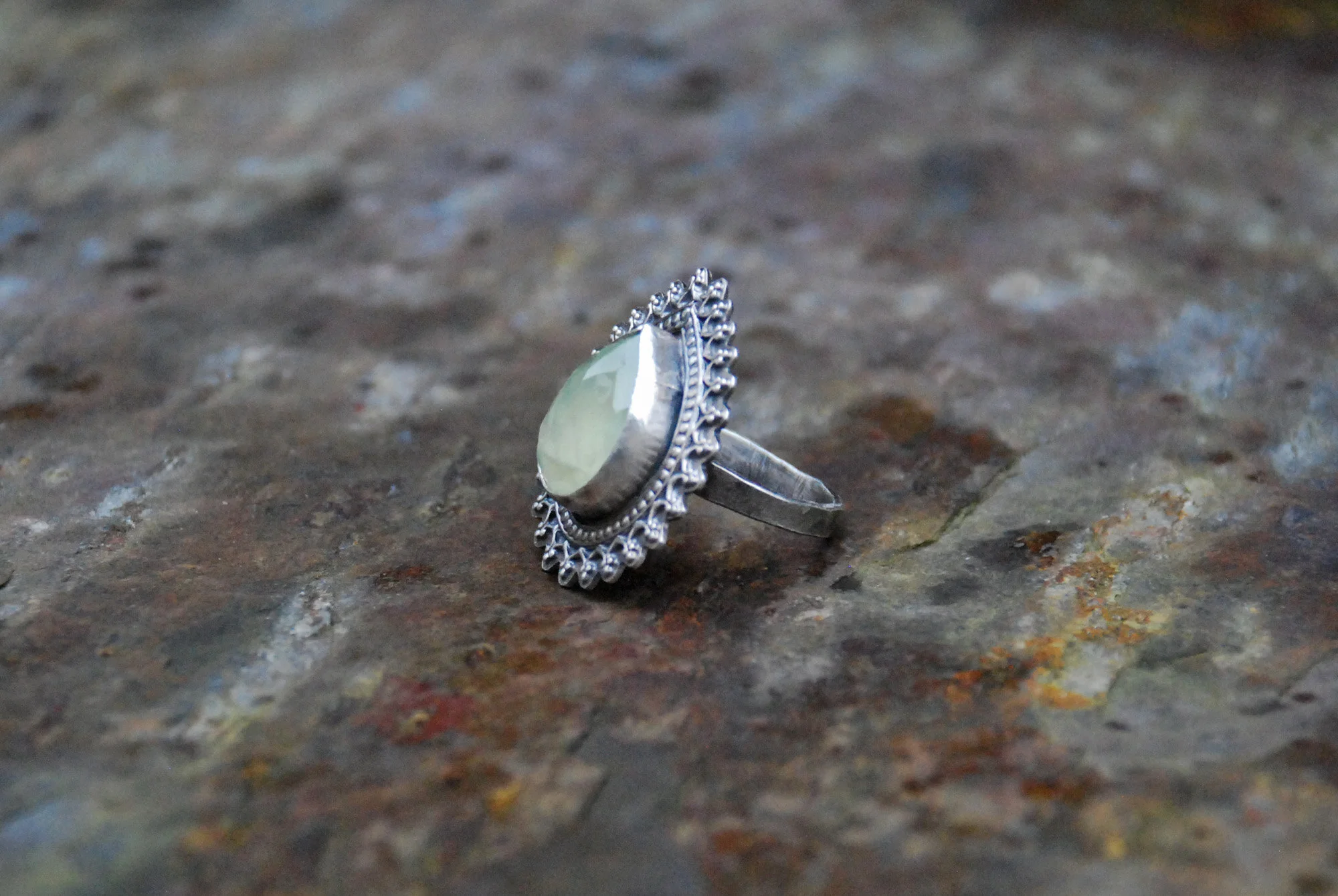 The Queen of Romance definitely makes a statement, but a soft and loving one. The faceted prehnite is eternally surrounded by a crown of gallery wire. Prehnite is considered a stone of unconditional love and the crystal to heal the healer. Made of sterling silver with adjustable band. Brush finish. Size 7.25. Approximately 1" x 1.25"