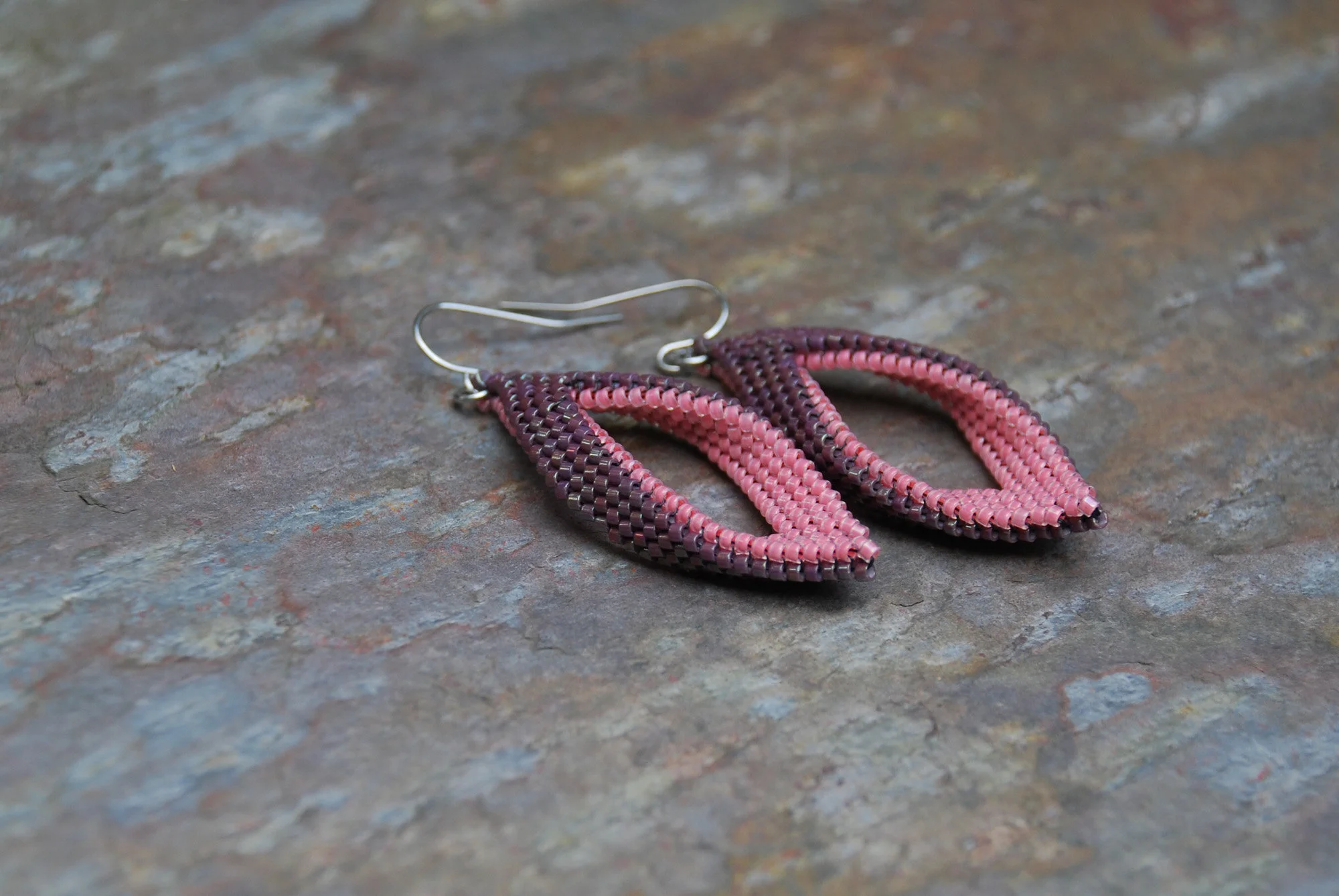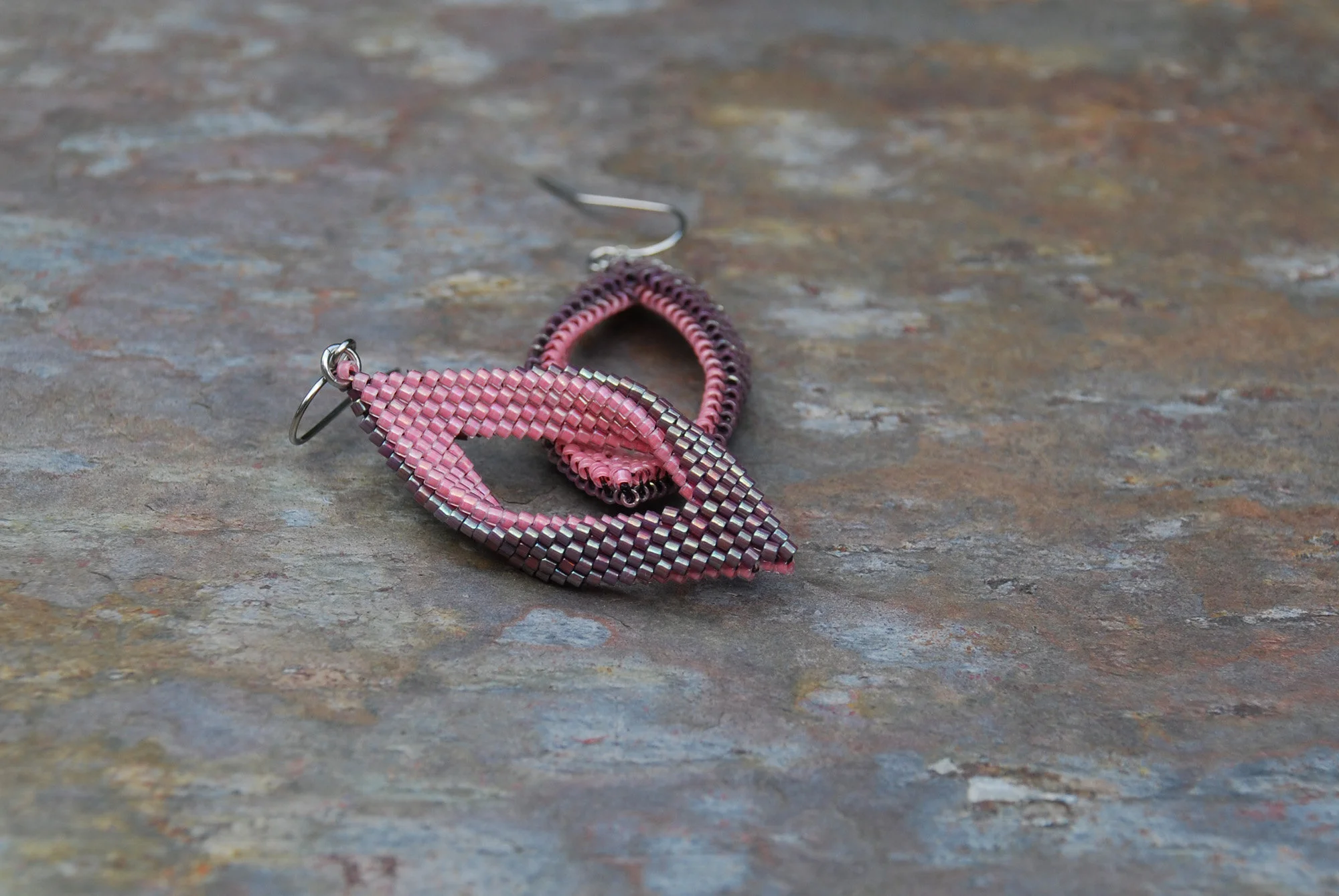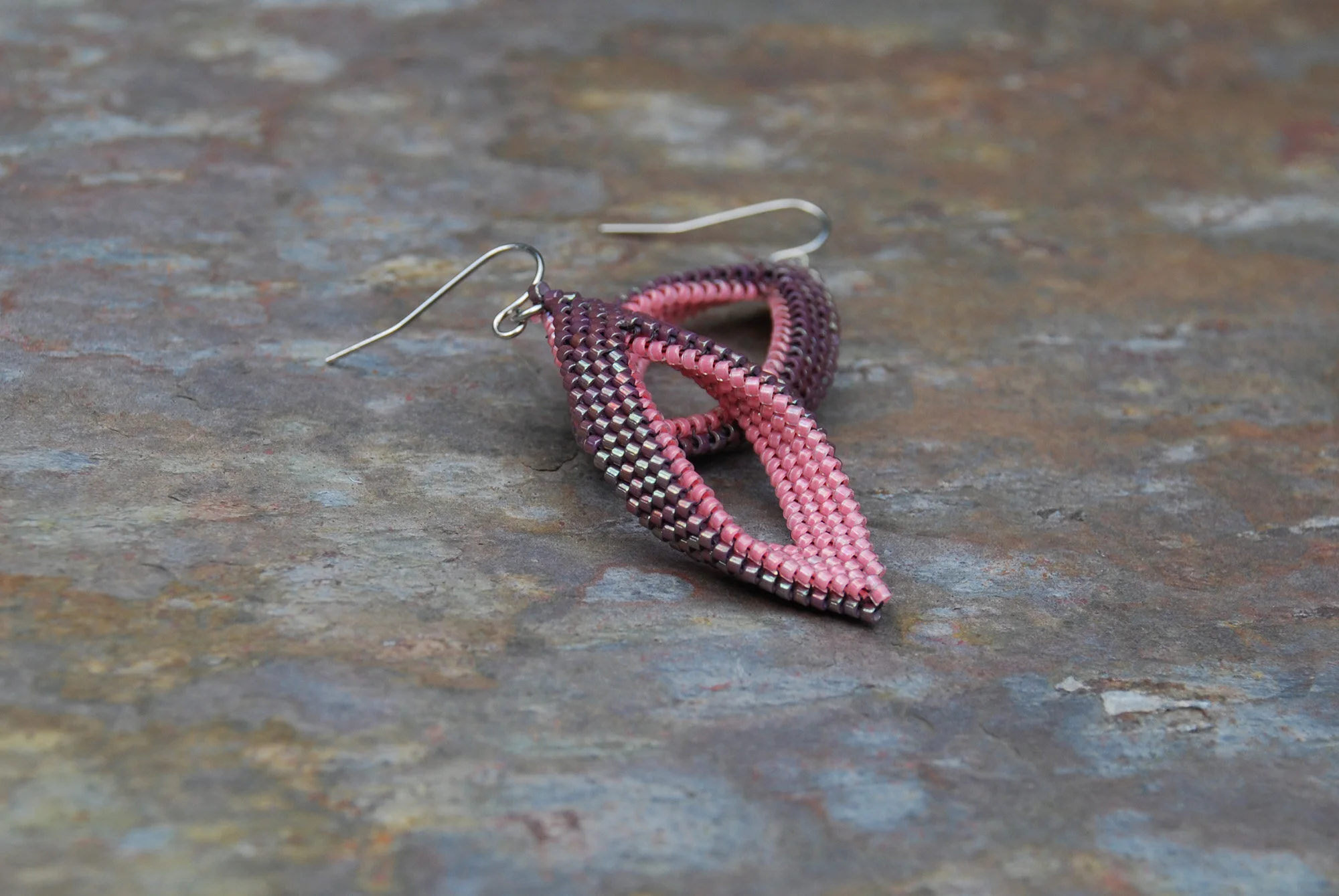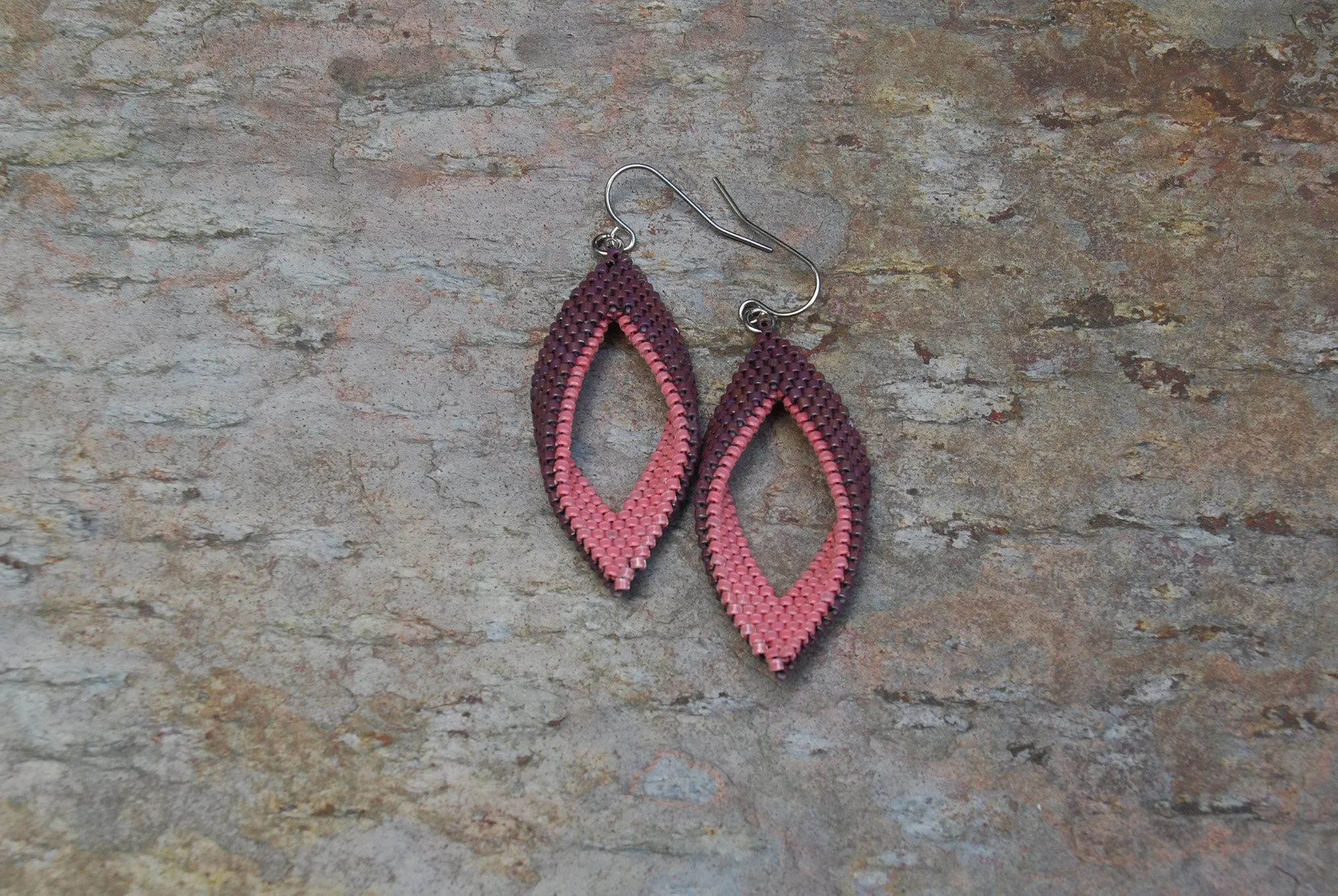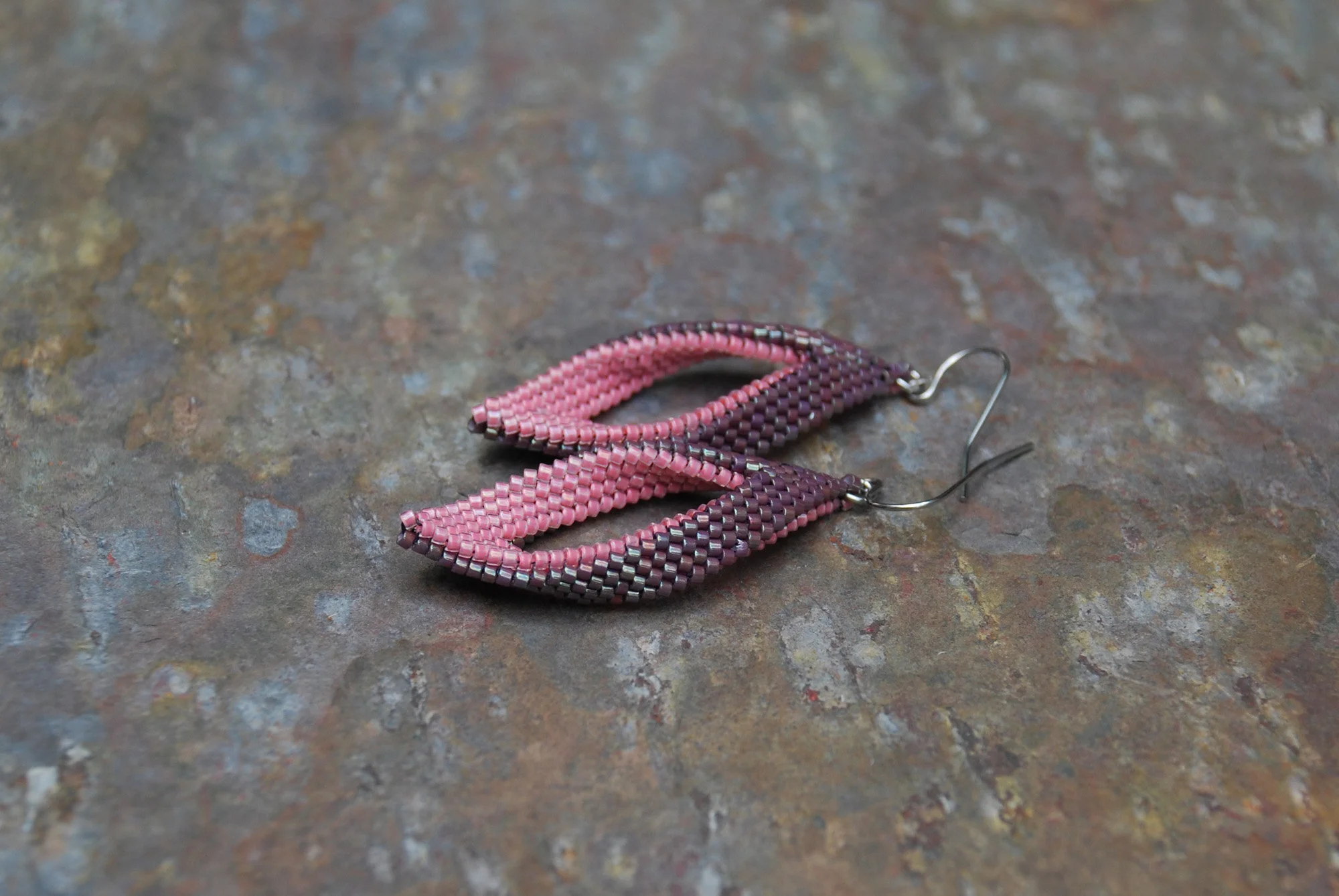 Geometric leaf earrings are peyote stitched using fireline. Rose Pink and Raspberry Gold. Stainless Steel ear wires. Approximately 2" in length.