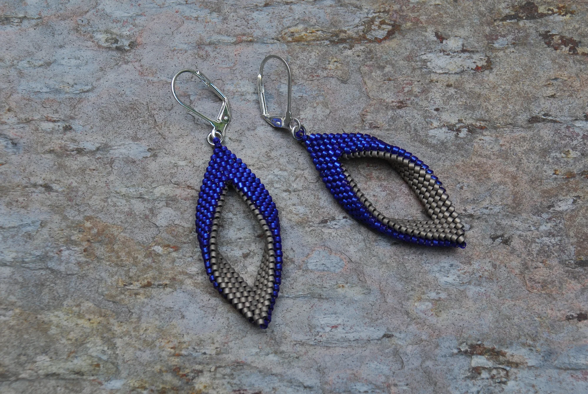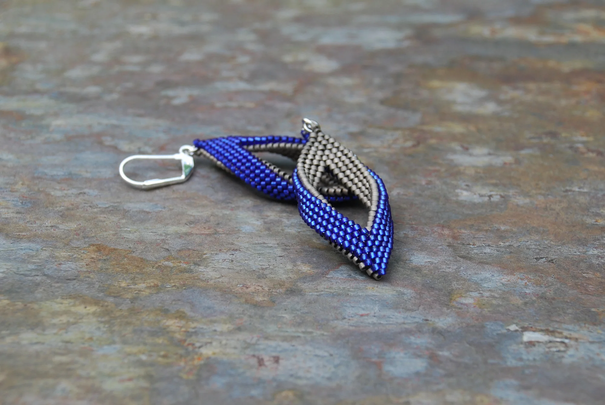 Geometric leaf earrings are peyote stitched using fireline. Royal Blue and Matte Silver. Sterling Silver leaver back ear wires. Approximately 2" in length.
