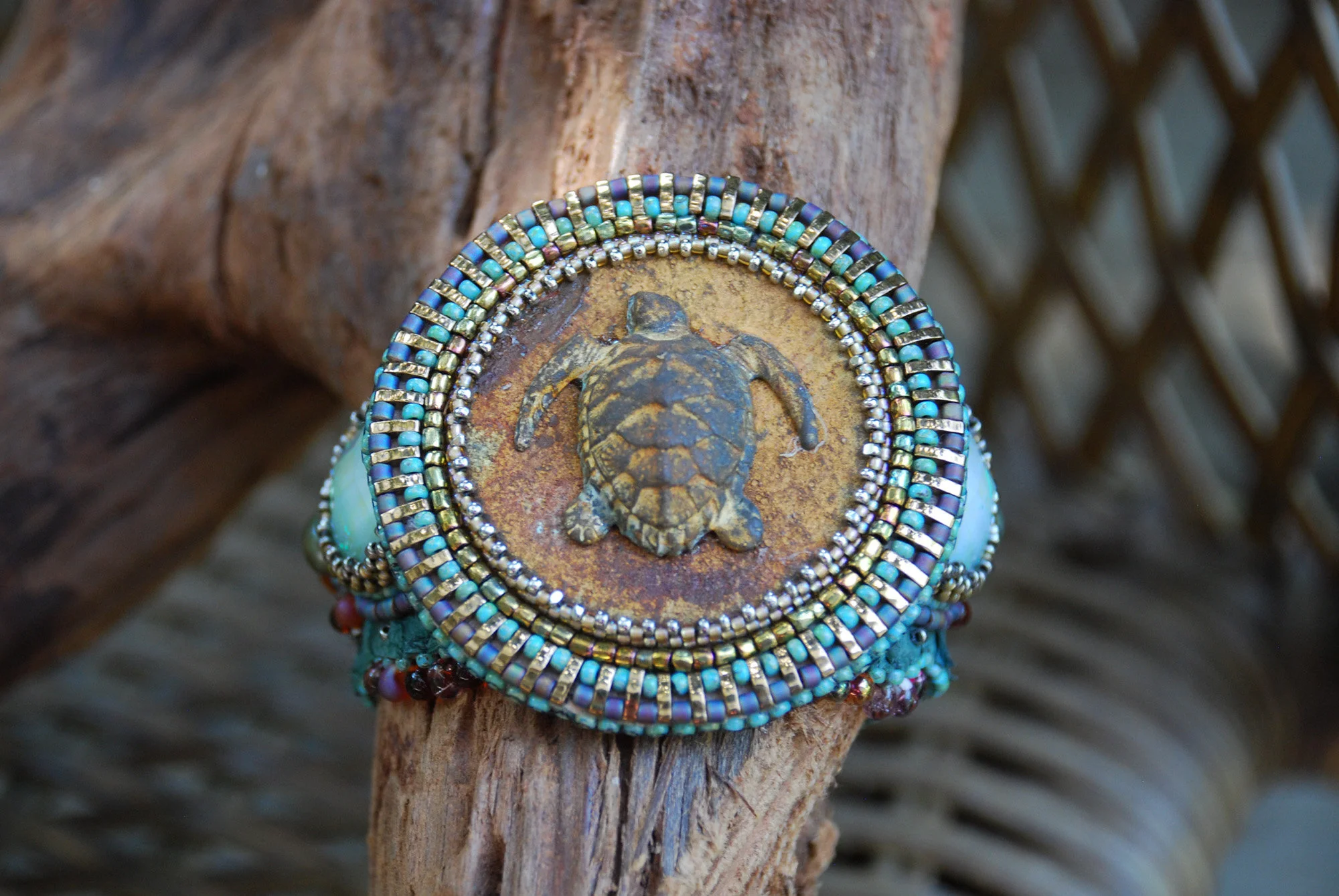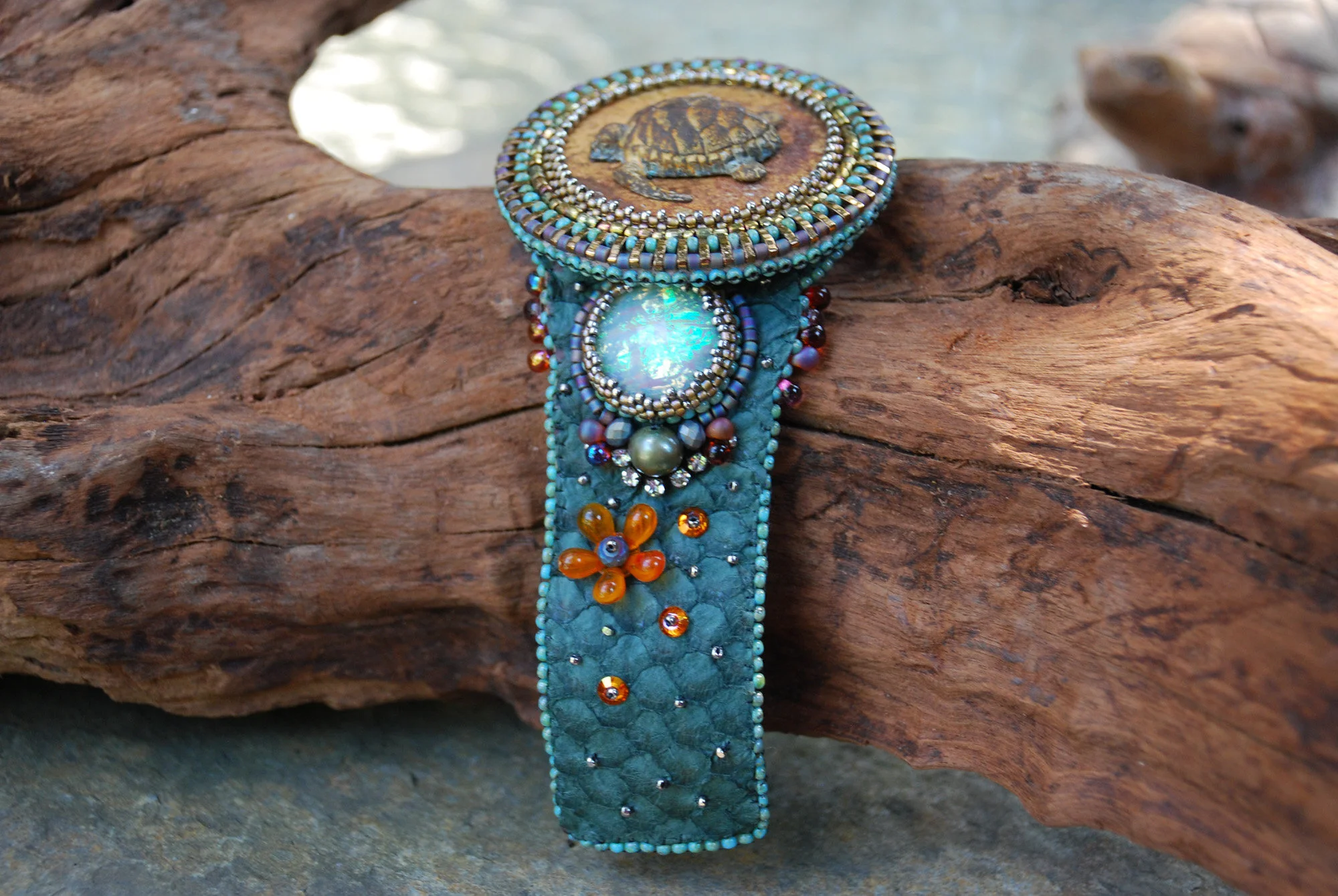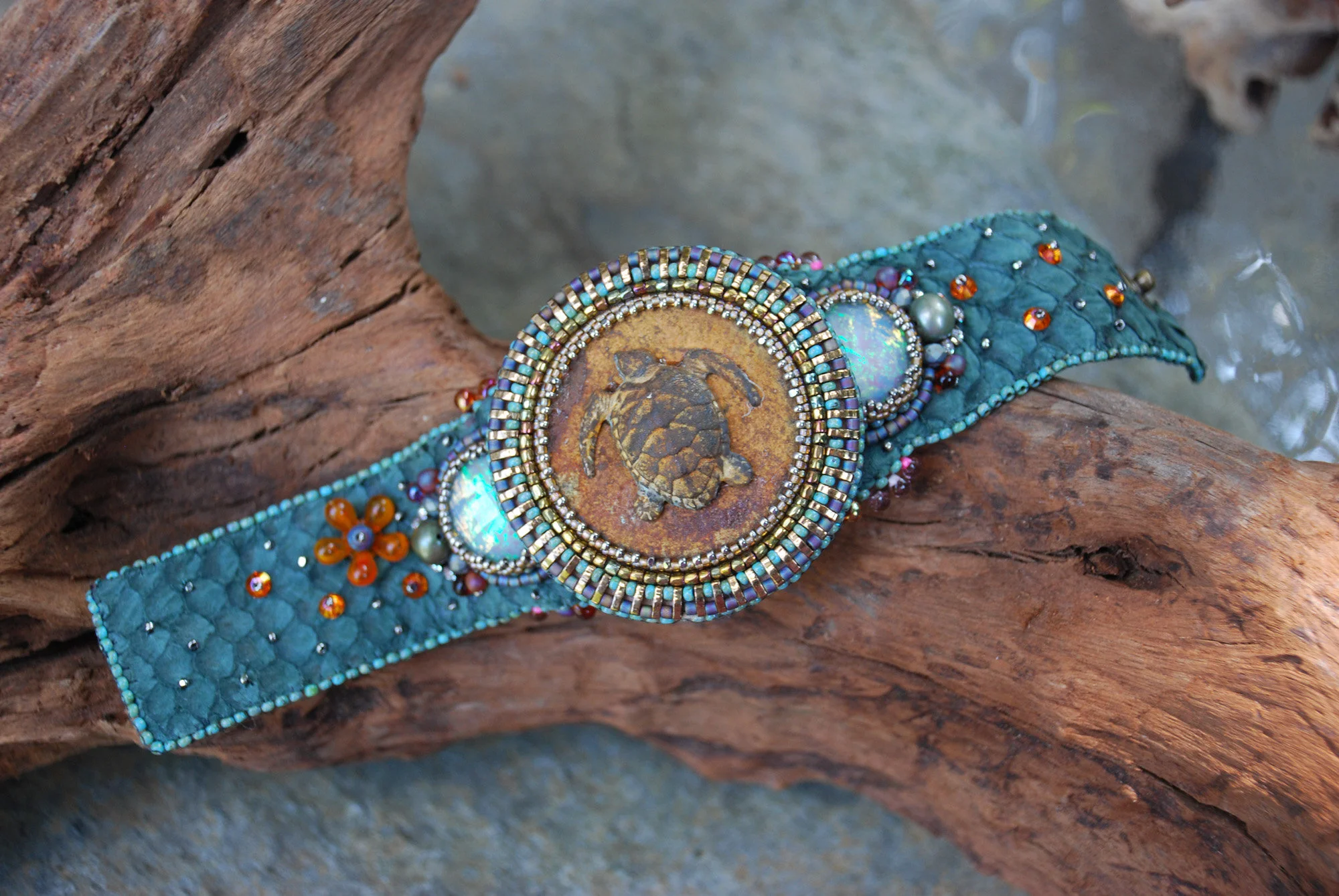 This sea turtle bracelet is an amazing one of a kind piece of art. Imagine walking on the beach and finding this turtle medallion, worn and weathered from the elements. Surrounded by metallic and turquoise beads. On each side there are opalescent acrylic cabs cut in a checkerboard pattern that flashes green, pink, purple and blue. Pearls, Czech beads, rhinestone cup chain, Swarovski crystals, all on a green fish leather base. Snap closure. Fits wrists up to 7". Focal is 2", band is 1" wide. Backed with patterned ultra-suede. Light and comfortable to wear.