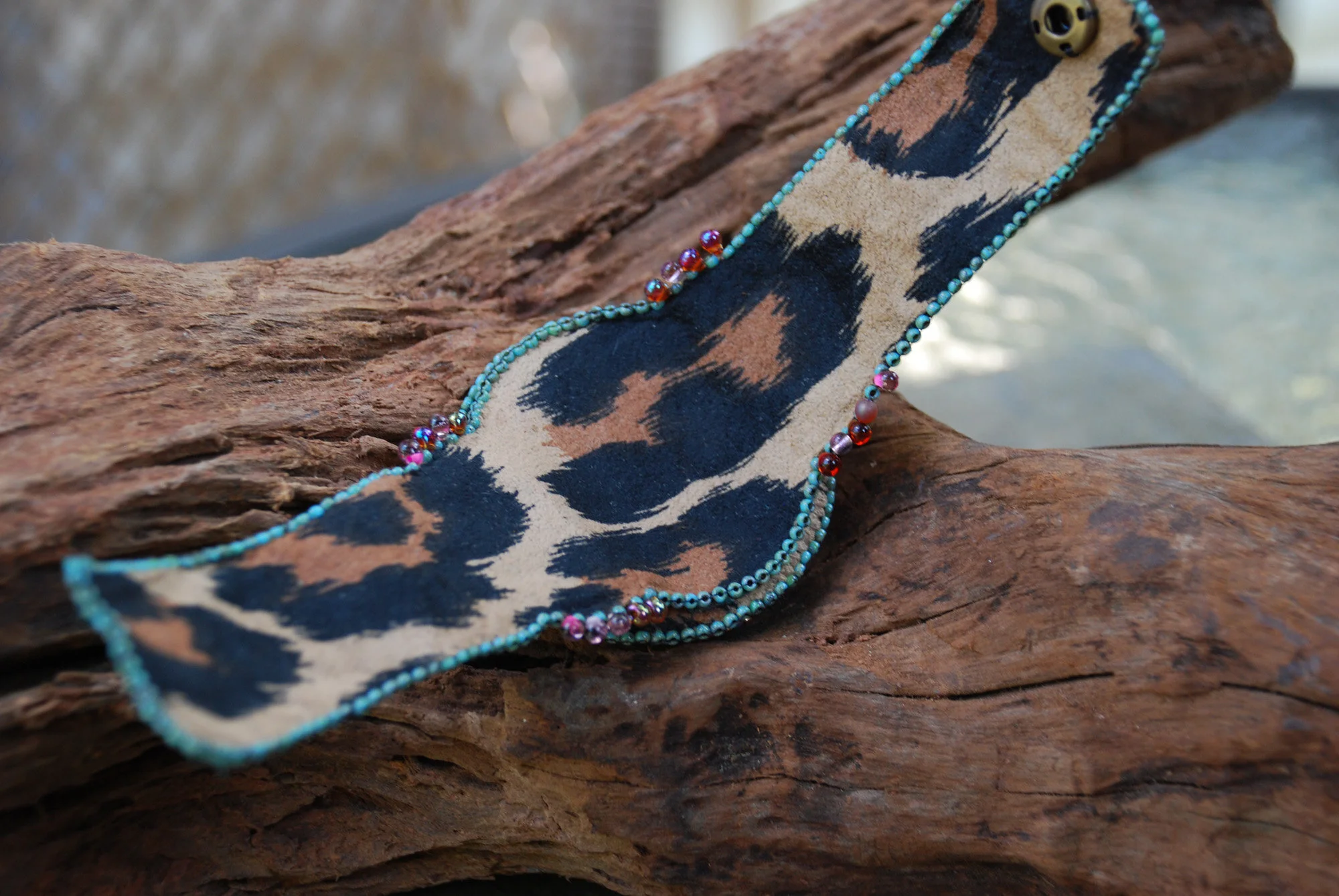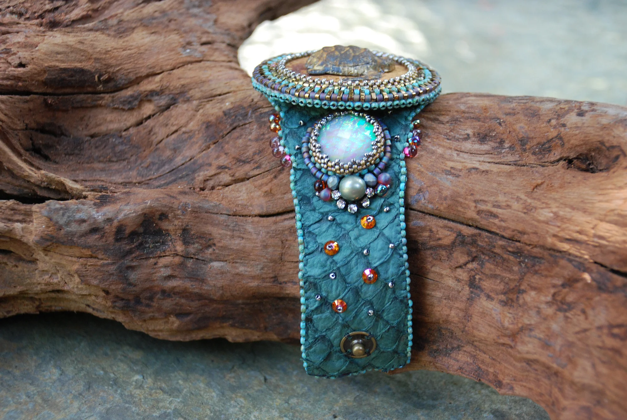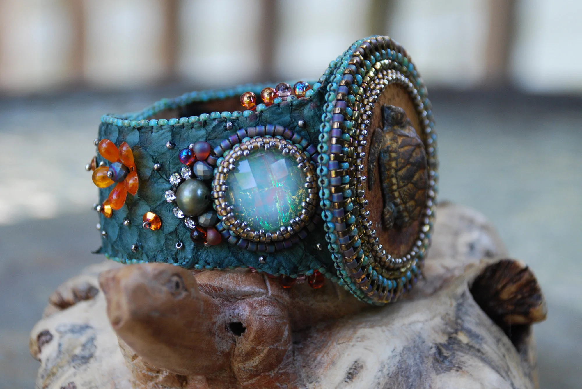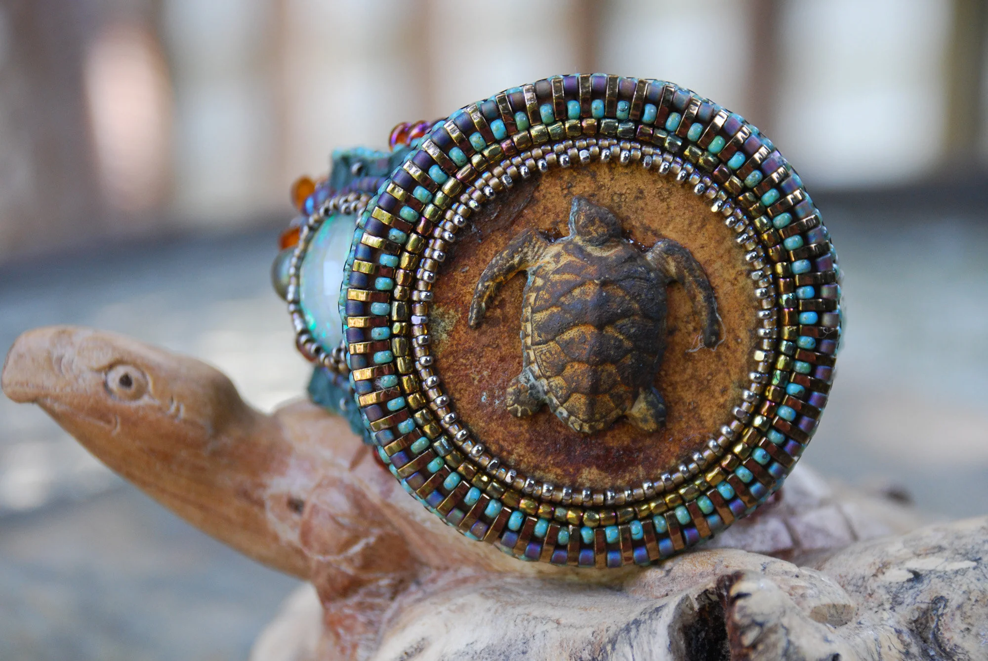 This sea turtle bracelet is an amazing one of a kind piece of art. Imagine walking on the beach and finding this turtle medallion, worn and weathered from the elements. Surrounded by metallic and turquoise beads. On each side there are opalescent acrylic cabs cut in a checkerboard pattern that flashes green, pink, purple and blue. Pearls, Czech beads, rhinestone cup chain, Swarovski crystals, all on a green fish leather base. Snap closure. Fits wrists up to 7". Focal is 2", band is 1" wide. Backed with patterned ultra-suede. Light and comfortable to wear.