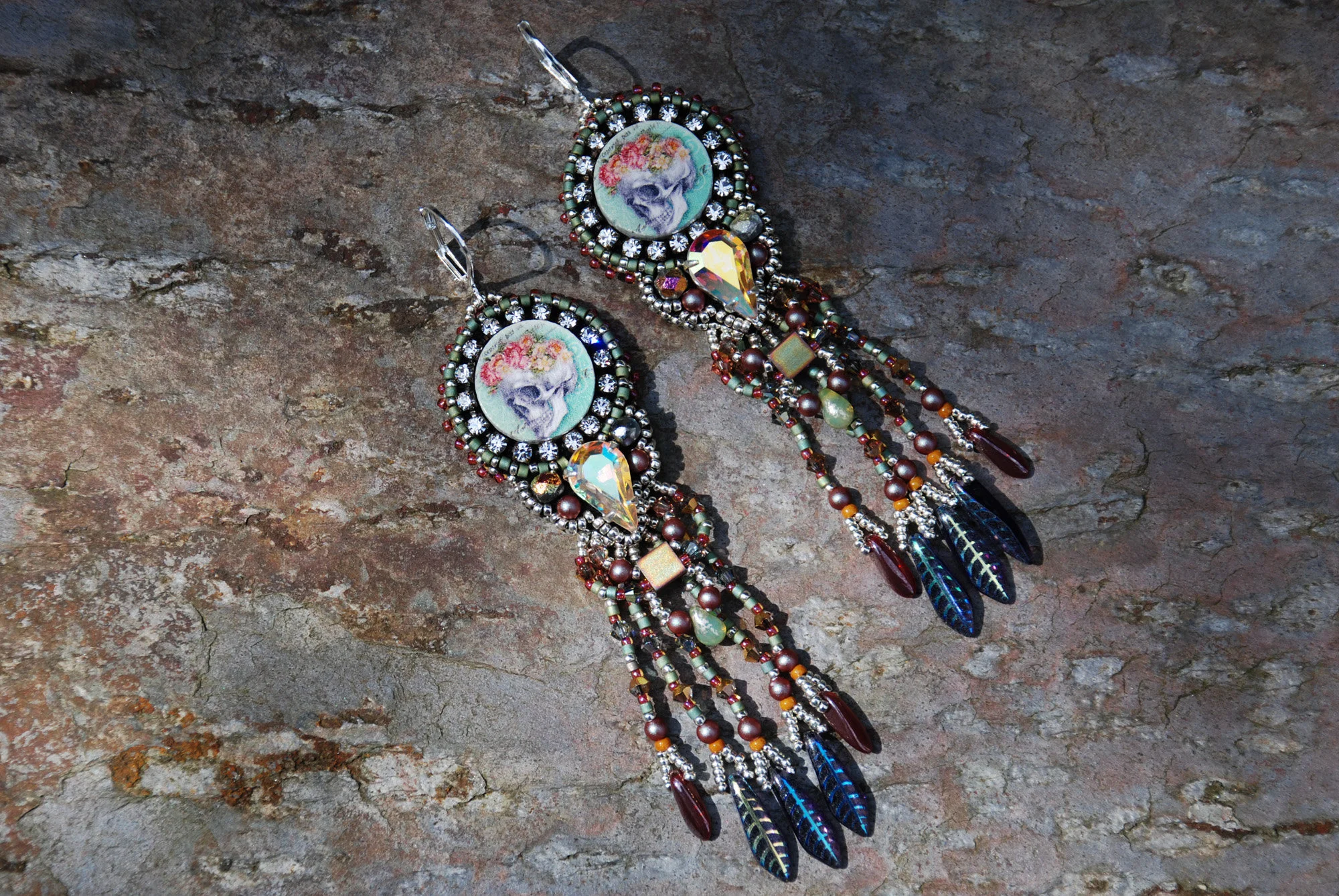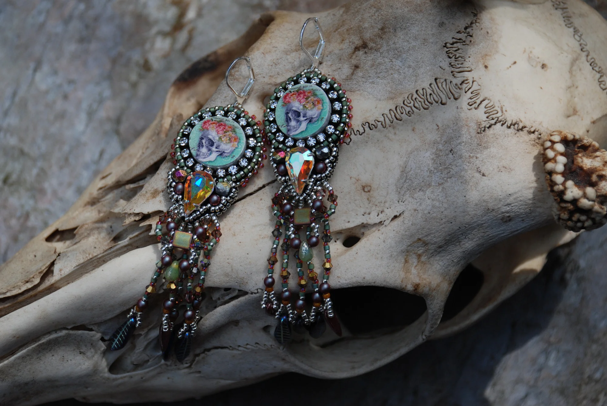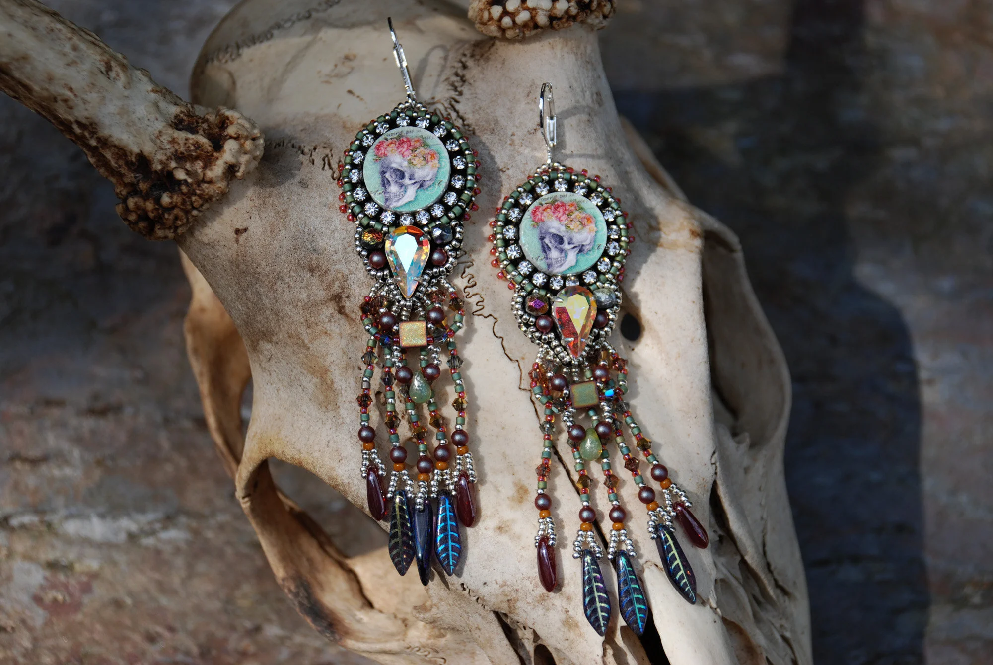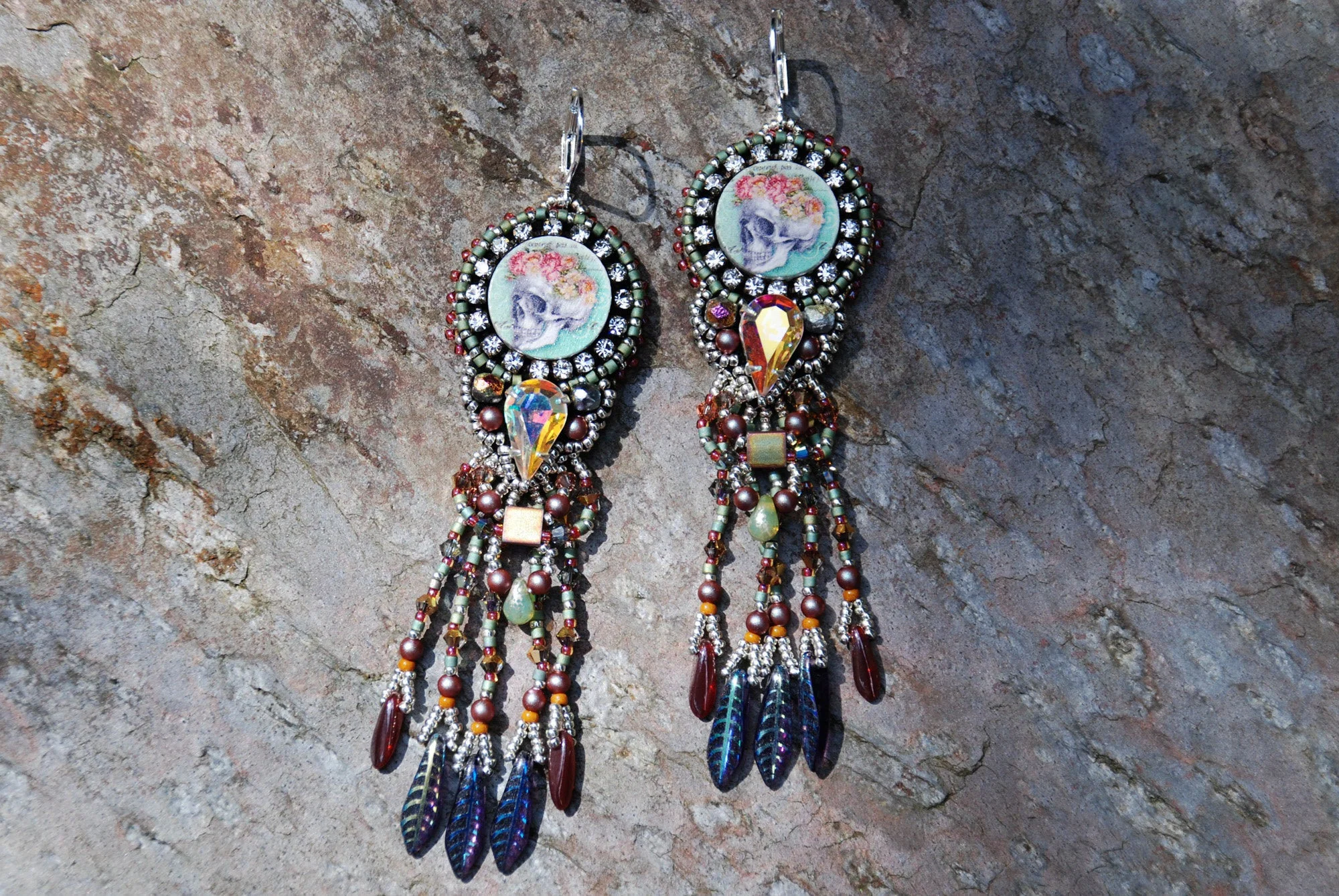 Amazing skull and rose cabochons surrounded by crystal cup chain with a beautiful yellow/orange Swarovski crystal pear. One of a kind, made with seed and dagger beads, and Swarovski crystals. Silver plated leaver back ear wires. Backed with black ultra-suede. 3 and 1/2 inches in length. Silver accents.