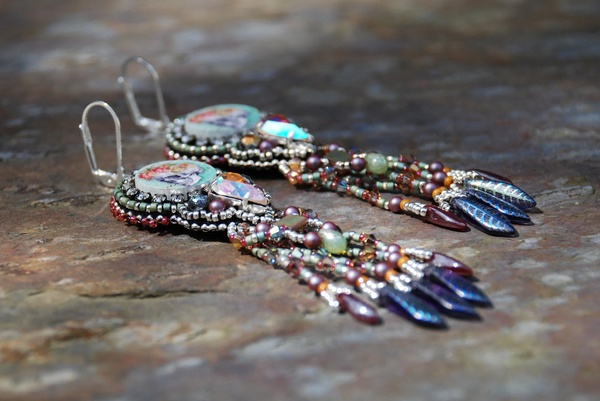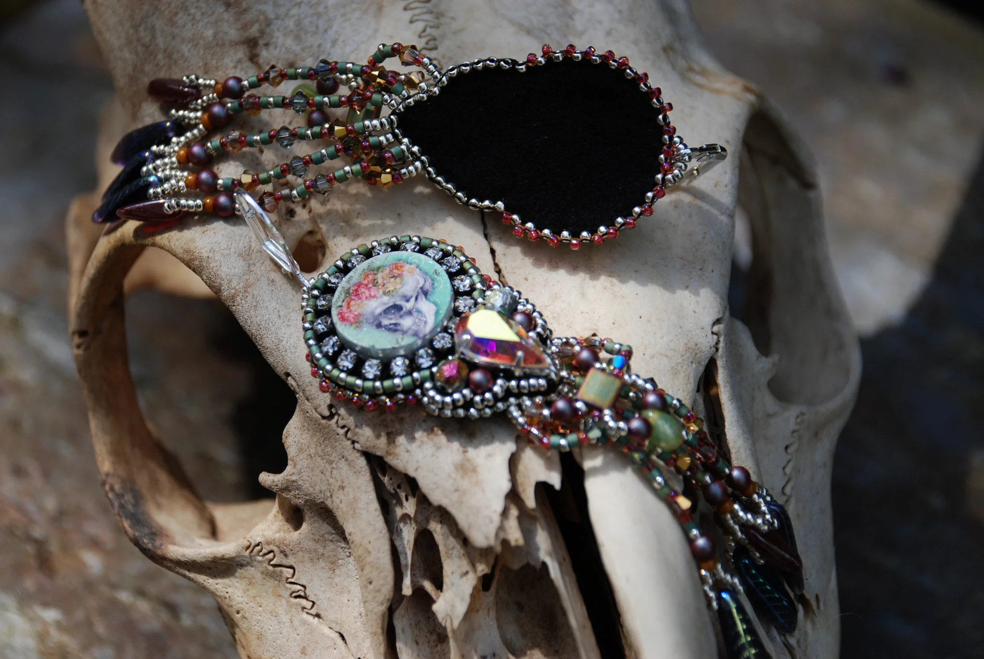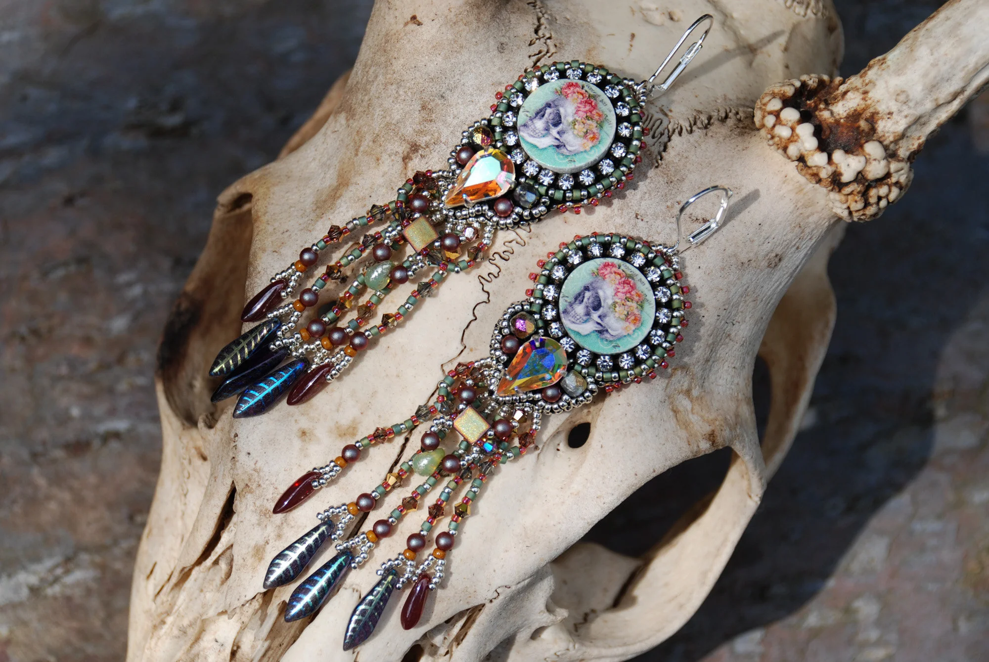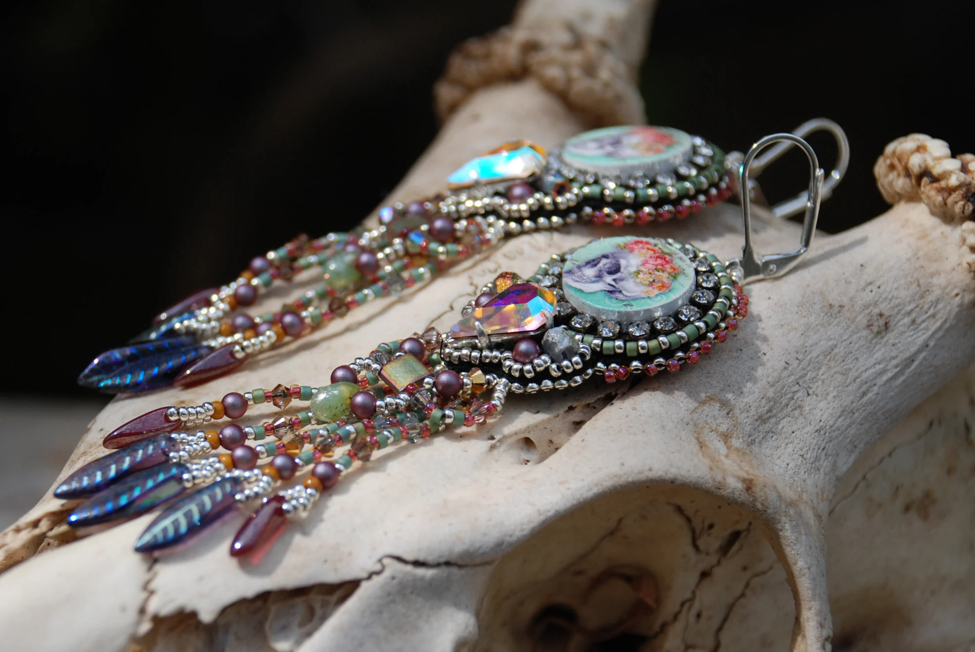 Amazing skull and rose cabochons surrounded by crystal cup chain with a beautiful yellow/orange Swarovski crystal pear. One of a kind, made with seed and dagger beads, and Swarovski crystals. Silver plated leaver back ear wires. Backed with black ultra-suede. 3 and 1/2 inches in length. Silver accents.