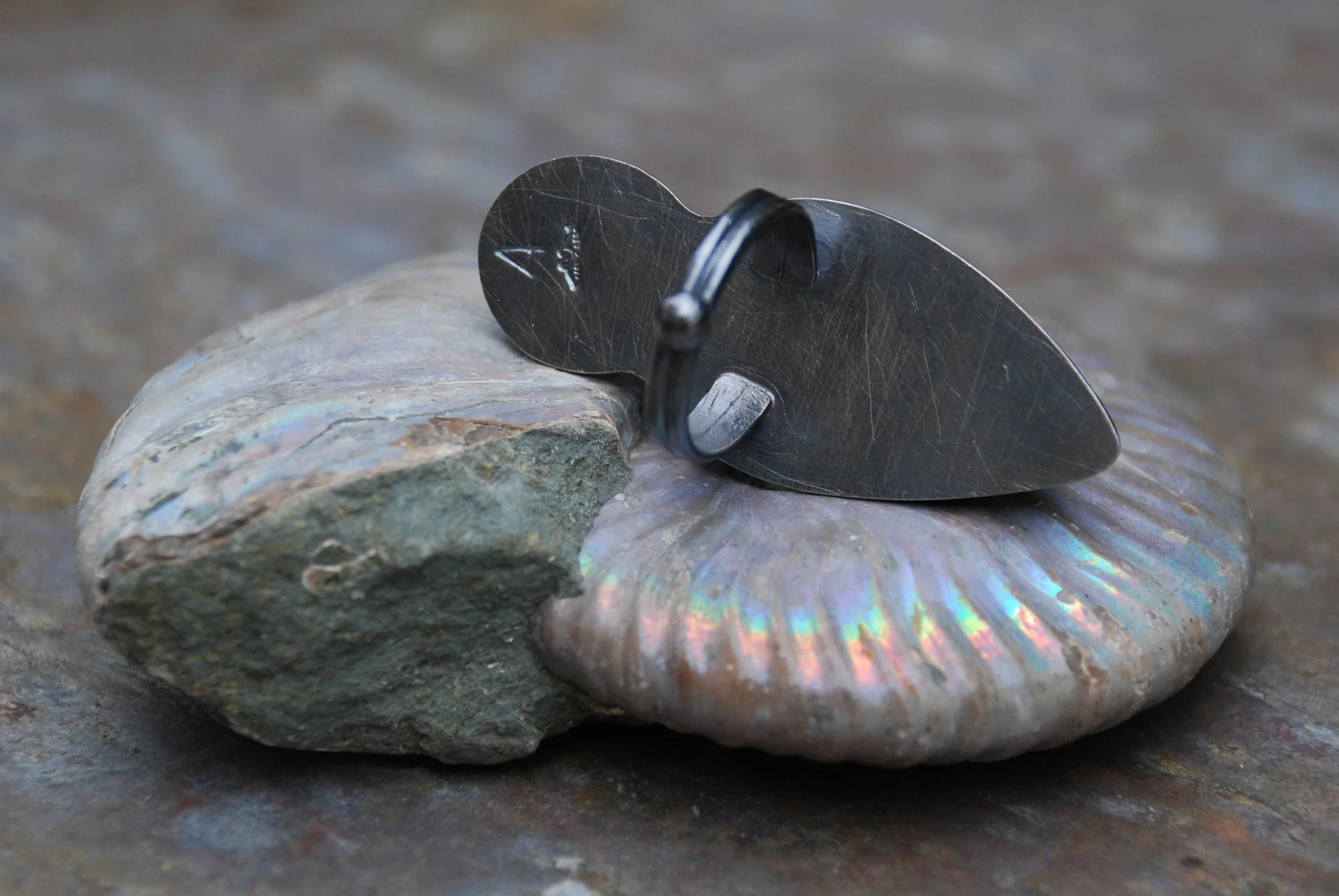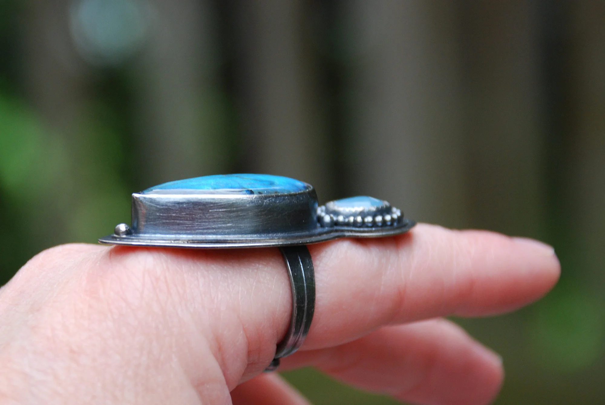 If you love the sea as much as I do, this is the ring for you. Full of blue and flash, representing the oceans, the movement and glimmers of refection. Aquamarine and Laboradite, take the ocean everywhere you go! Ring measures 2" x 1", size 7.5 US. Sterling silver, handmade, one of a kind, statement ring.
