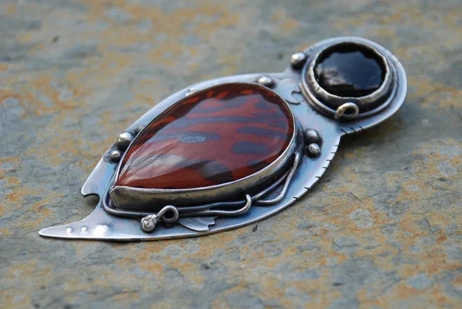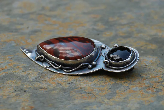 This one-of-a-kind pendant is made of sterling silver, black onyx, and Australian Print Stone. The zebra print makes this piece truly unique. Sterling wire and balls frame the fine silver bezels. The bail is approx. 1/4", to fit most any size chain. 3.25" in length, 1.5" wide. This piece has been oxidized. Hangs from a thick rustic brown leather cord that measures 19” with a 1” extender.