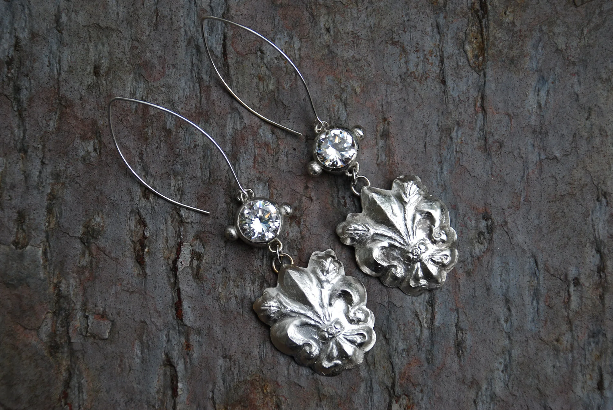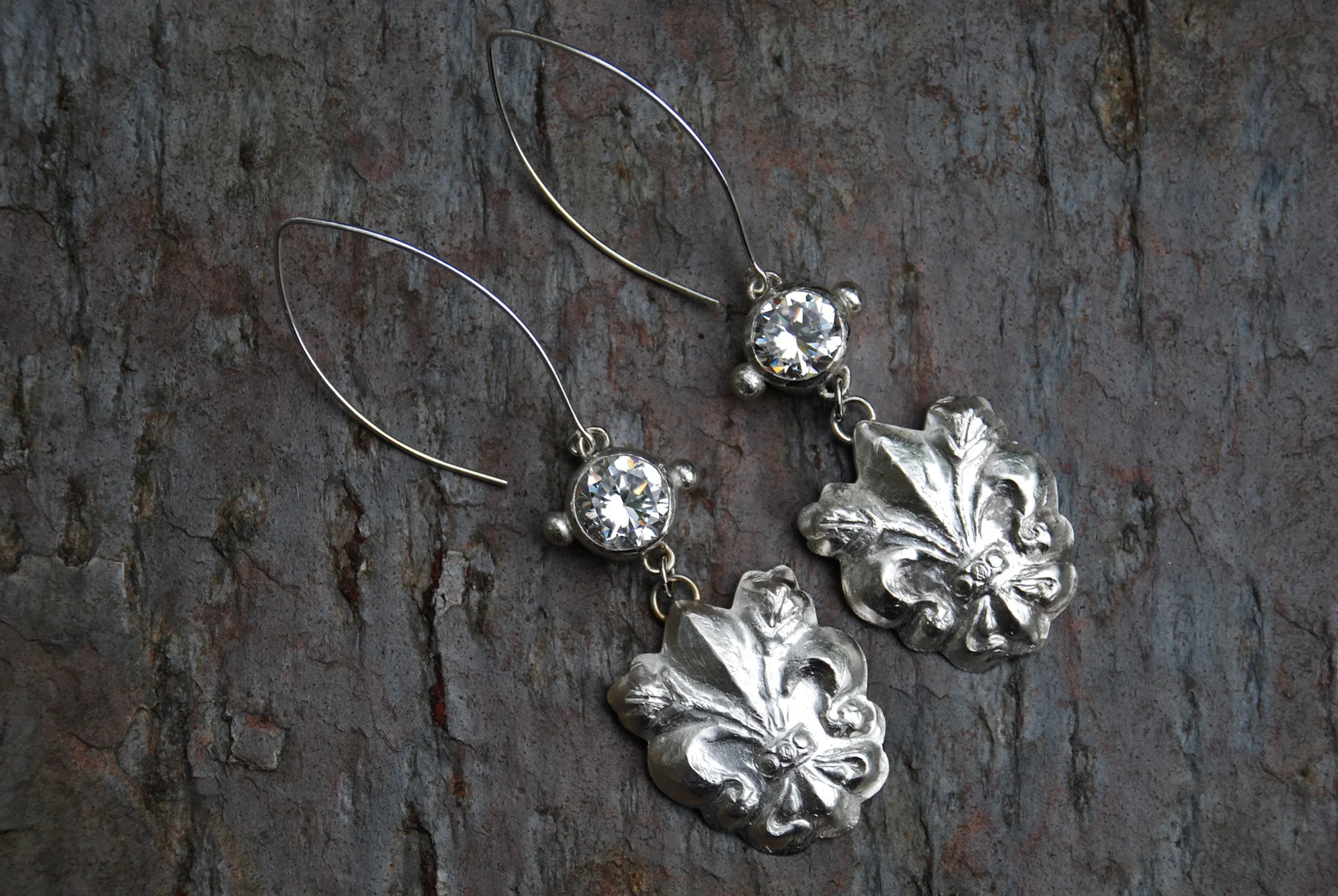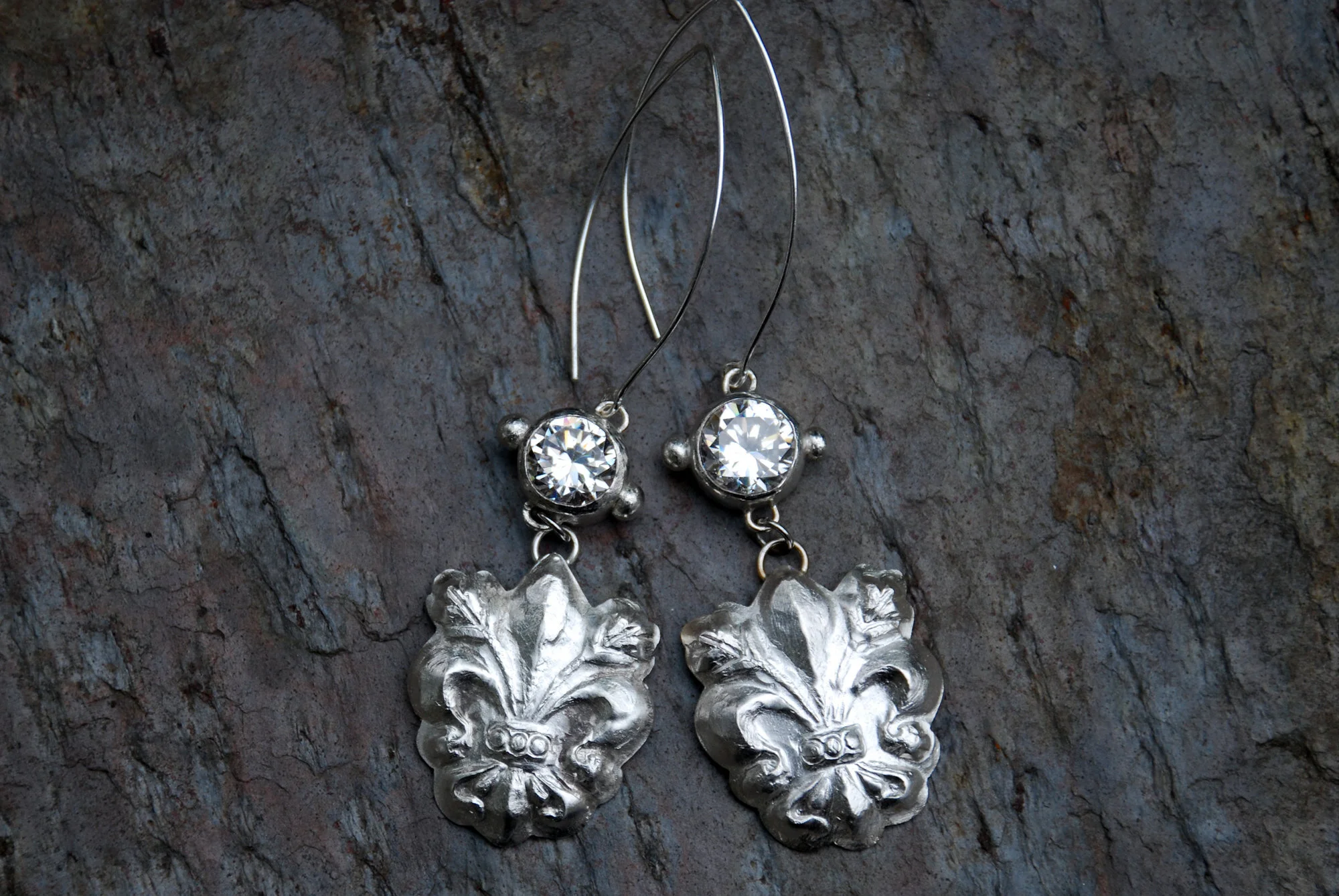 The fleur-de-lis is a stylized lily or iris commonly used for decoration. I've paired it with a large 10mm CZ. The fleur-de-lis has been hand forged from an impression die. 100% handmade. Sterling Silver. Total earring length is 3.25".
