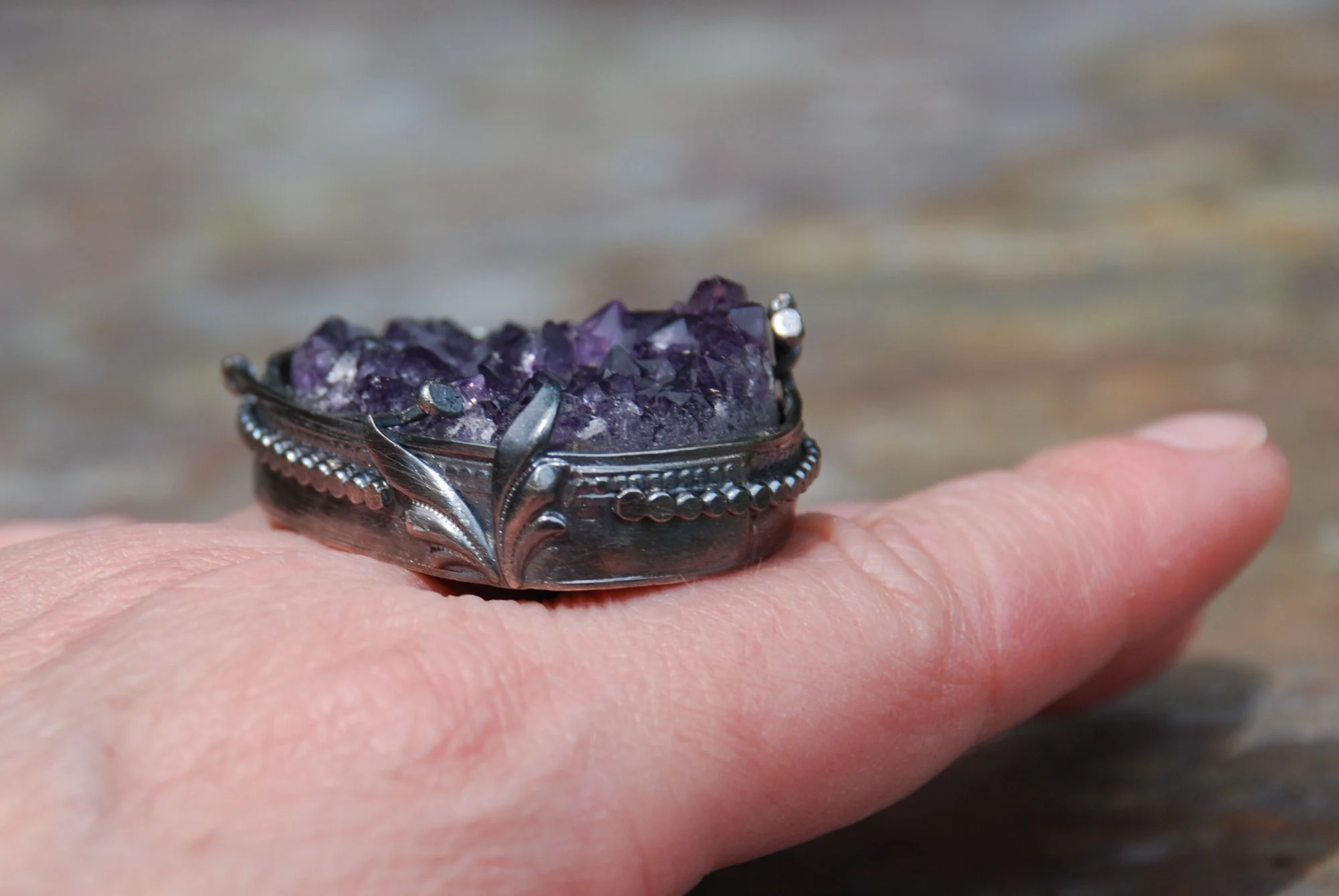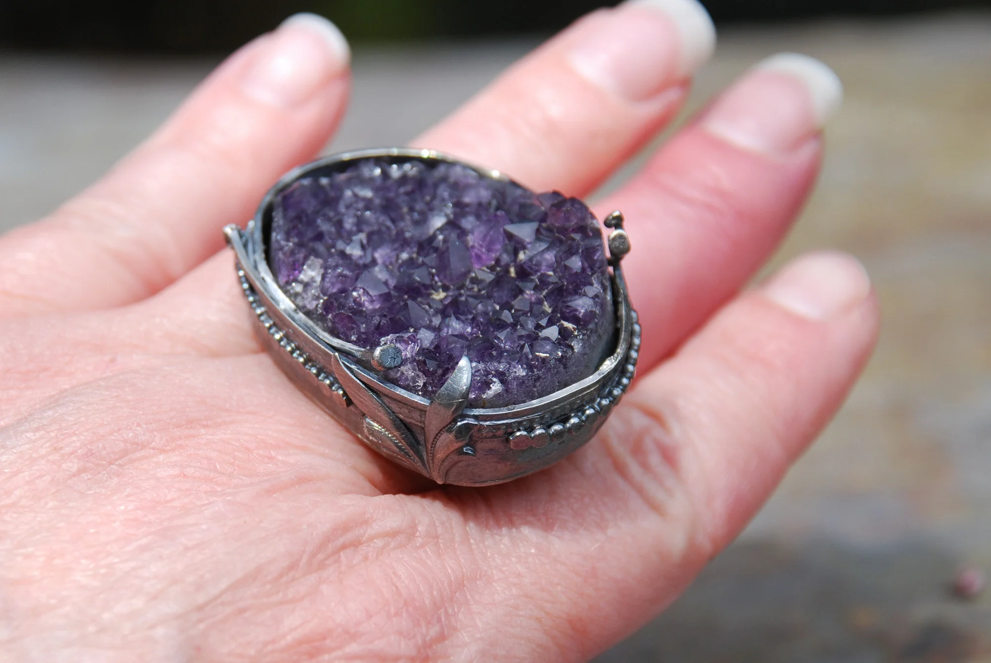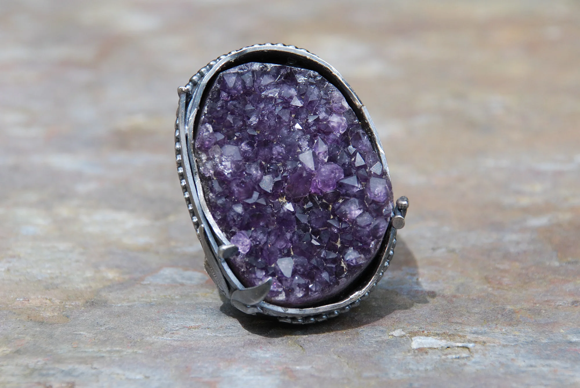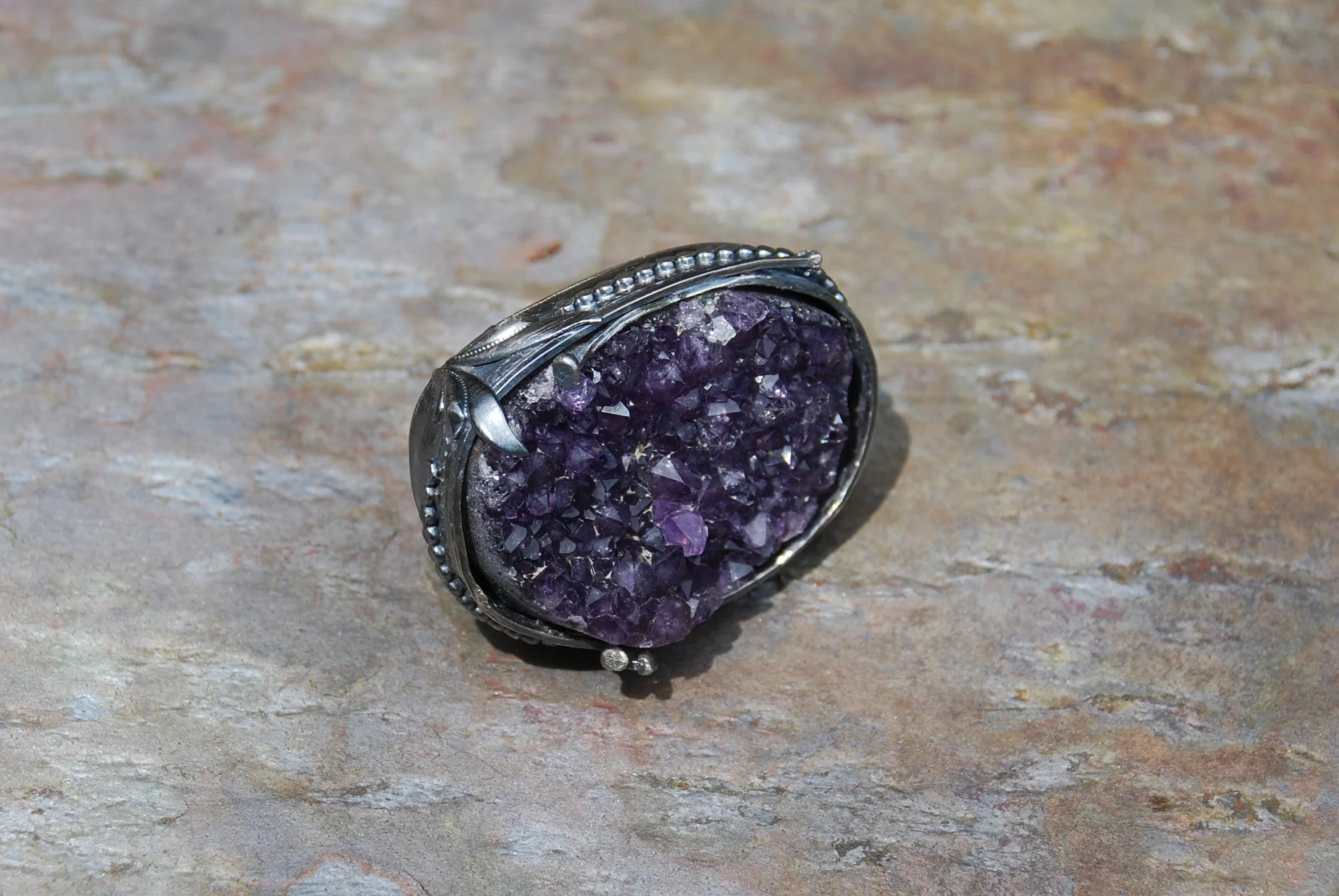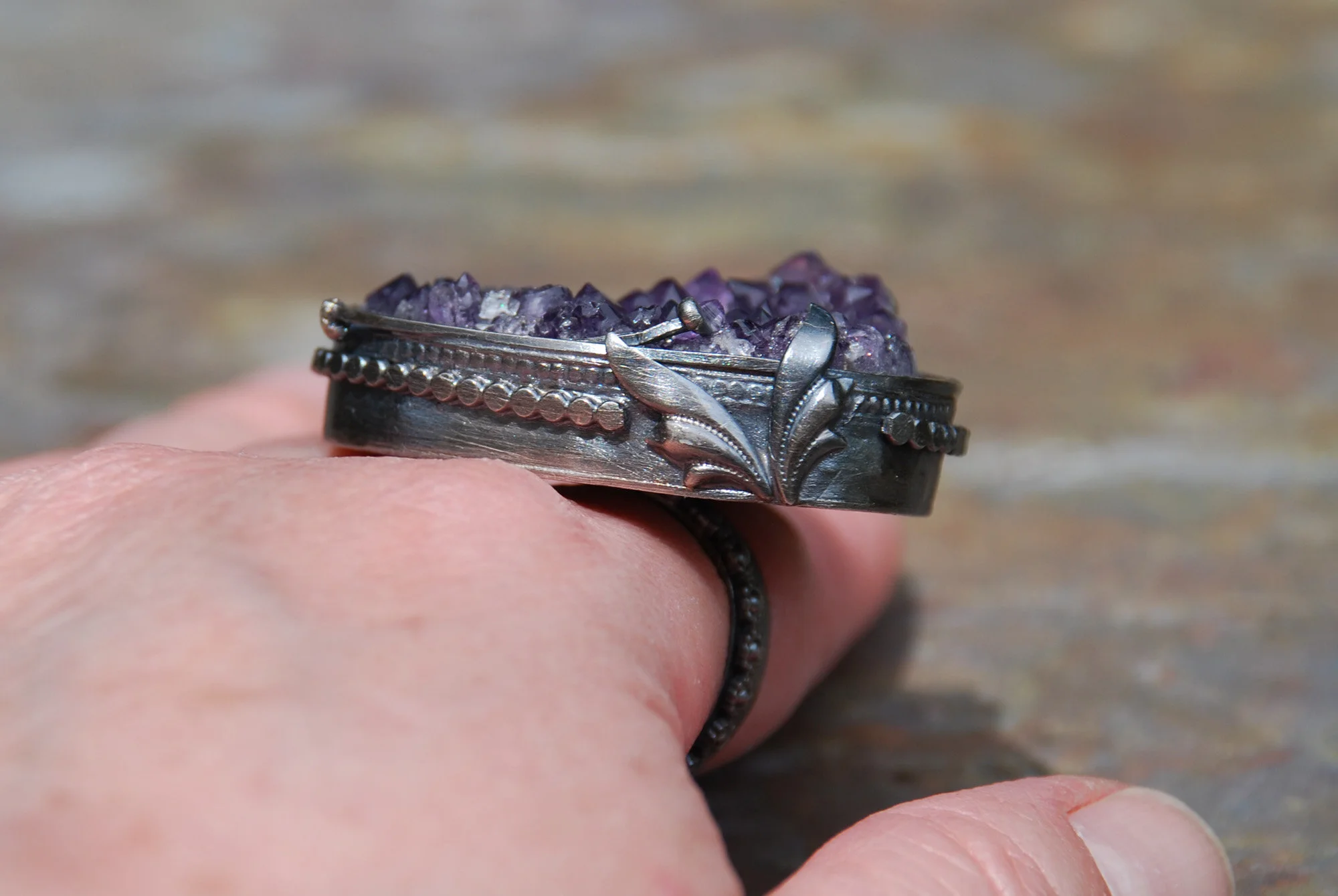 Large Amethyst druzy served up on a sterling silver base. Art nouveau leaves and beaded wire decorations. Nail heads act as prongs to hold in the stone. Floral shank. Size 7.5, adjustable. Ring measures 1.5" x 1", height 1/2".