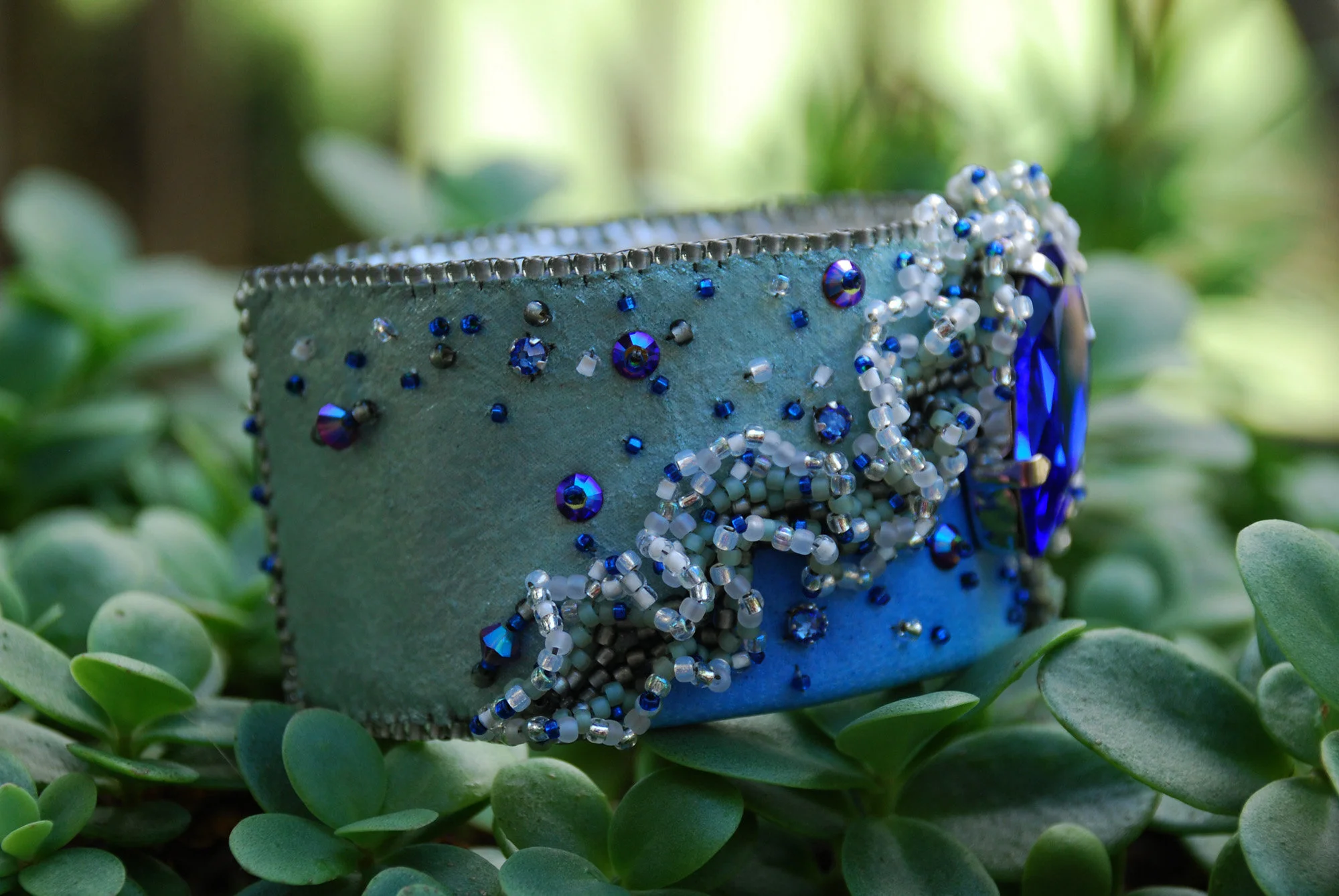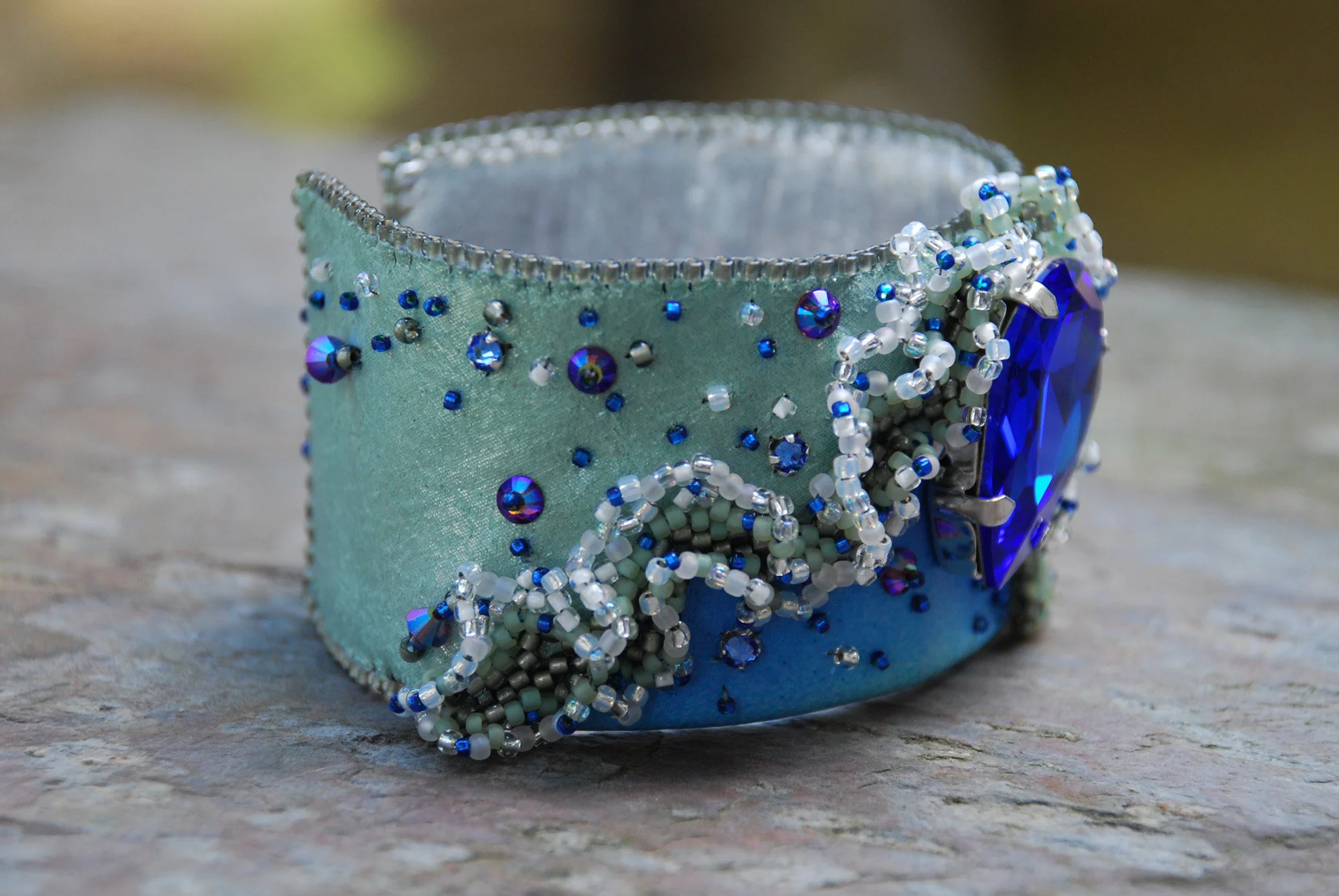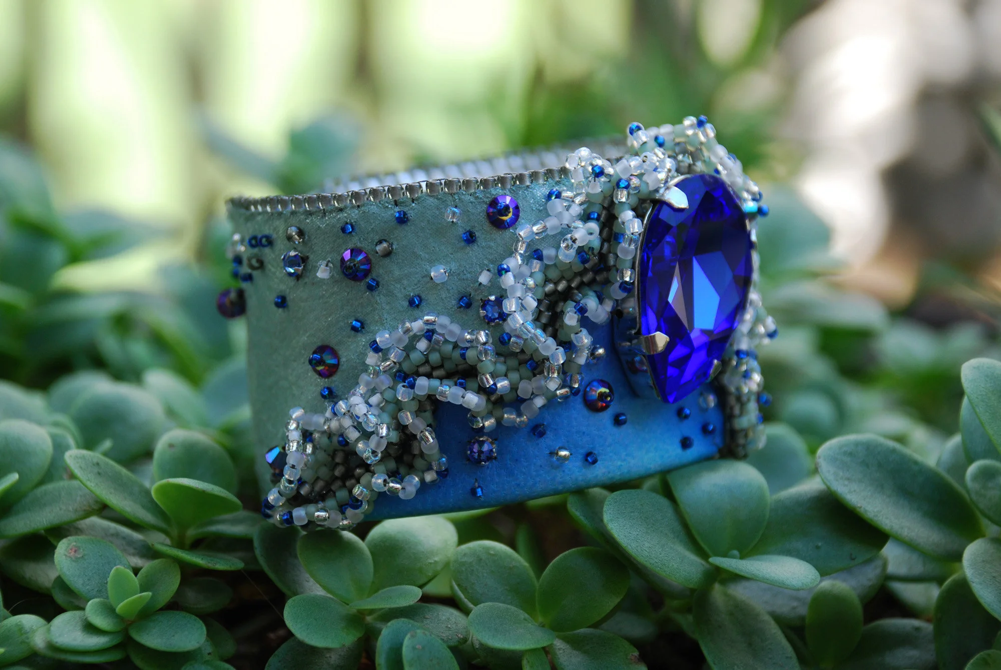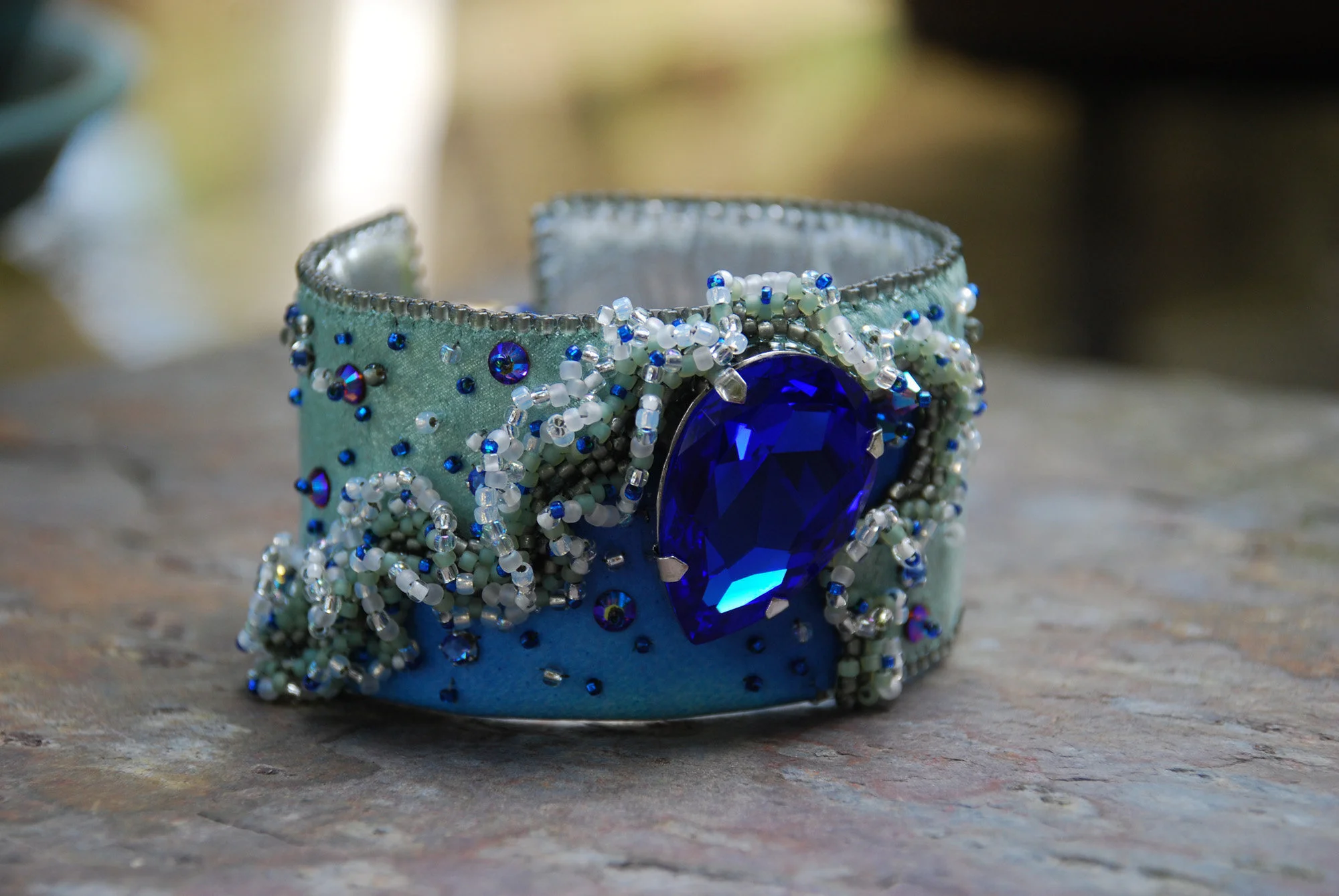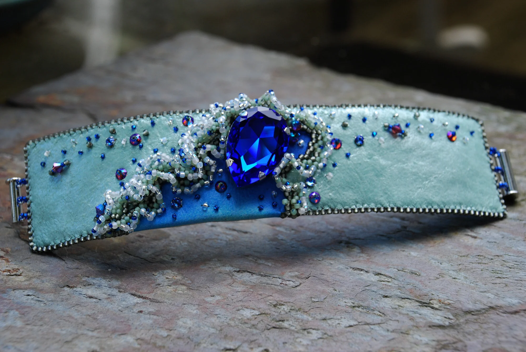 Our consciousness is like the wave that arises from the sea holding the essence of our true nature. Rolling like the tides, in and out, one thought after another. Get lost in this large Swarovski majestic blue crystal, such a gorgeous deep color that you could get lost in. Surrounded by a wave of seed beads and crystal elements bead embroidered on high quality garment leather. Rhodium plated slide clasp, magnetic. Backed with silver metallic leather. 7 - 1/4" in length.