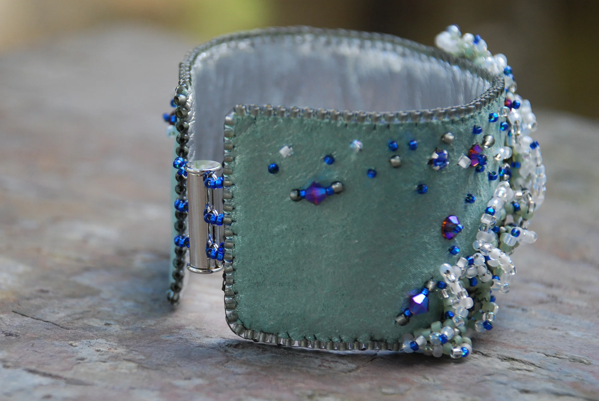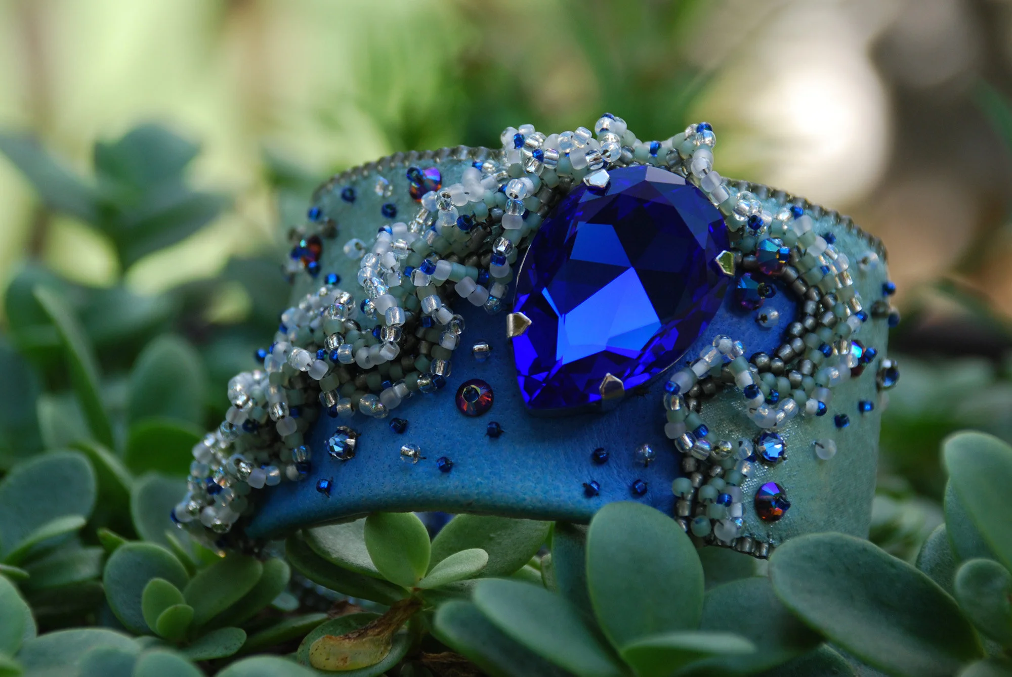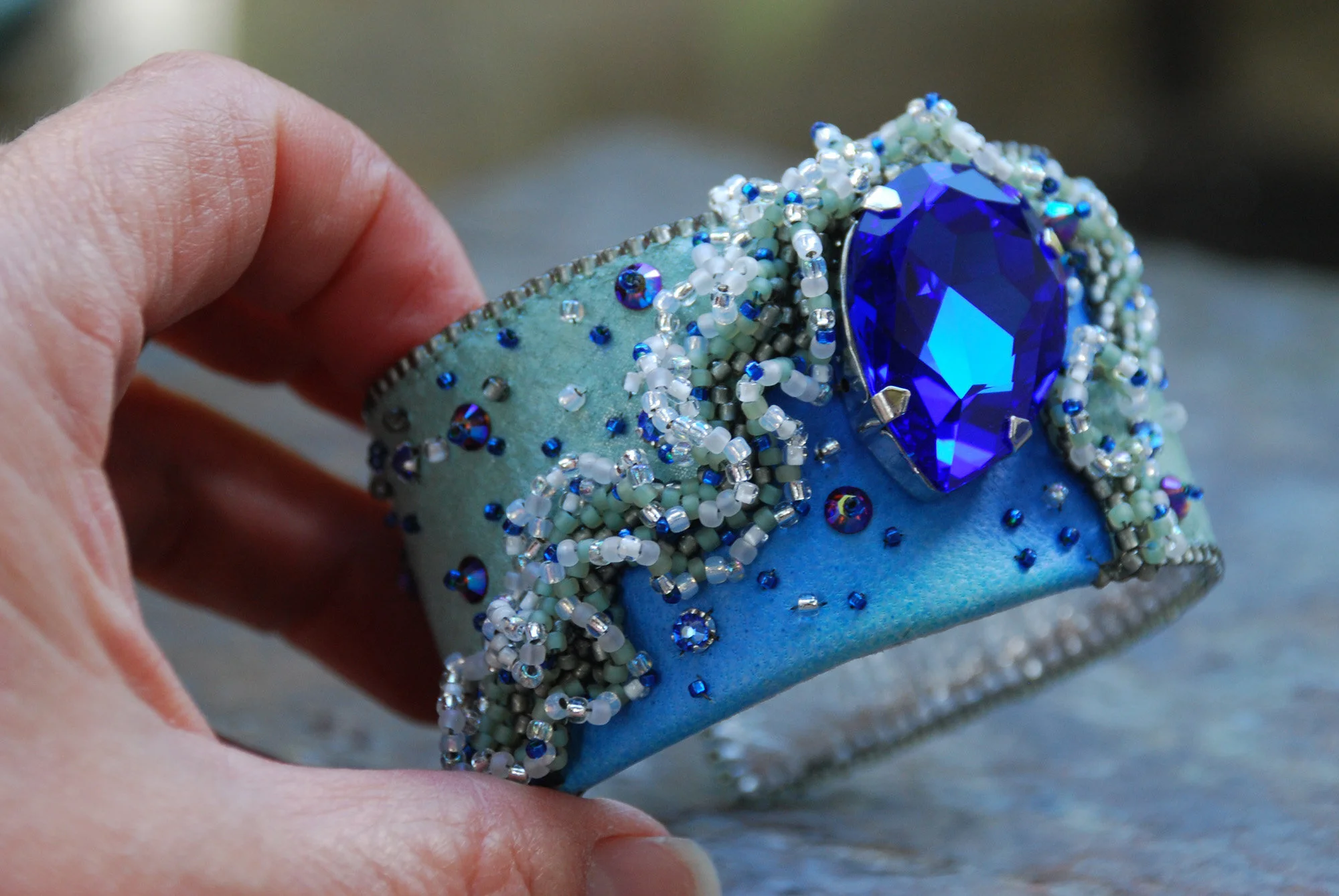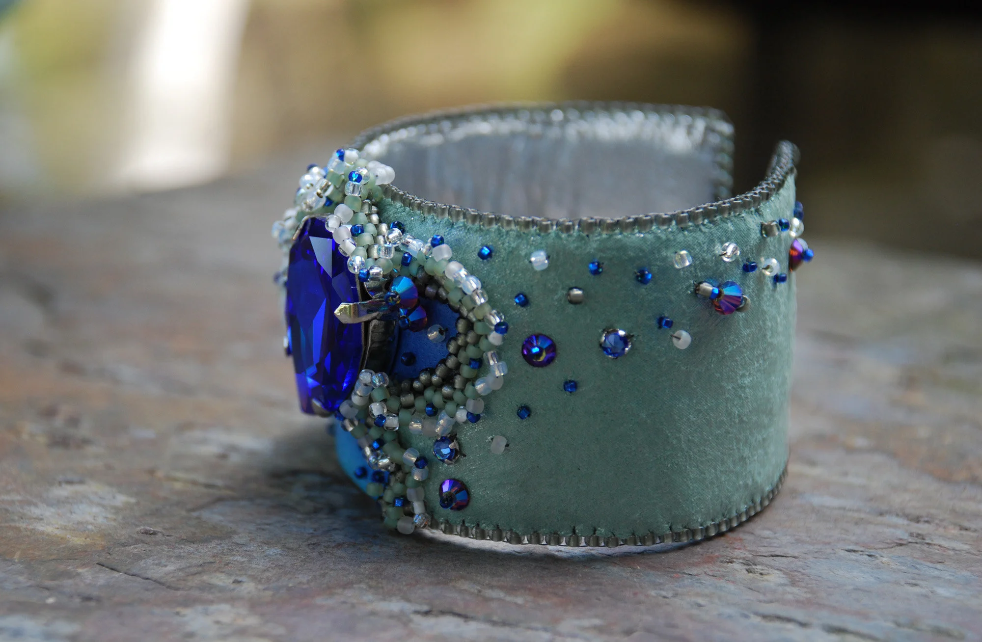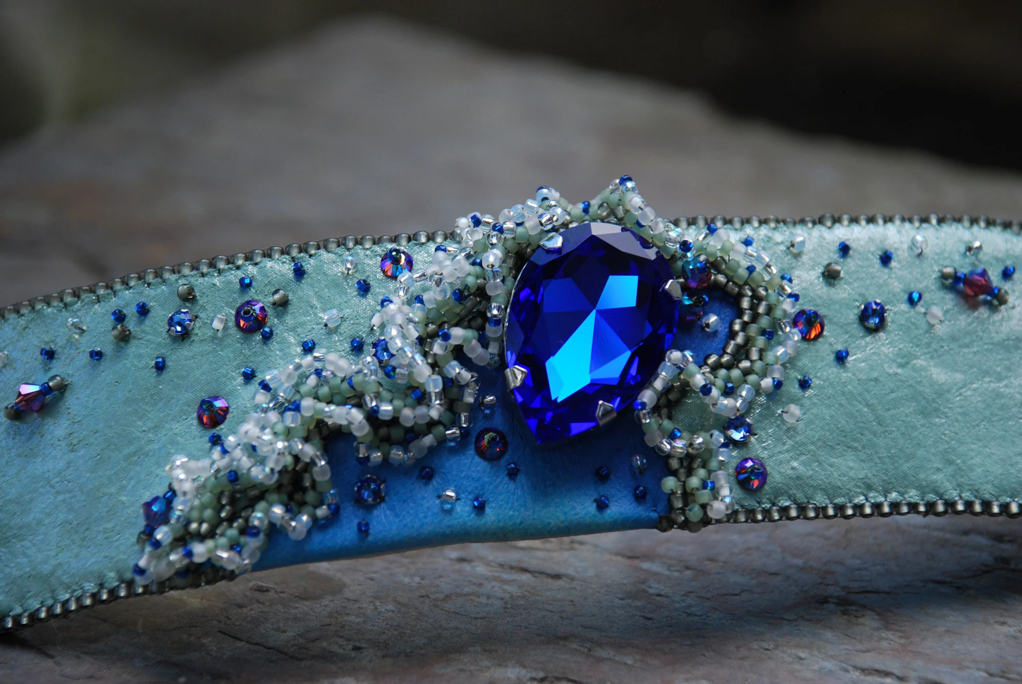 Our consciousness is like the wave that arises from the sea holding the essence of our true nature. Rolling like the tides, in and out, one thought after another. Get lost in this large Swarovski majestic blue crystal, such a gorgeous deep color that you could get lost in. Surrounded by a wave of seed beads and crystal elements bead embroidered on high quality garment leather. Rhodium plated slide clasp, magnetic. Backed with silver metallic leather. 7 - 1/4" in length.