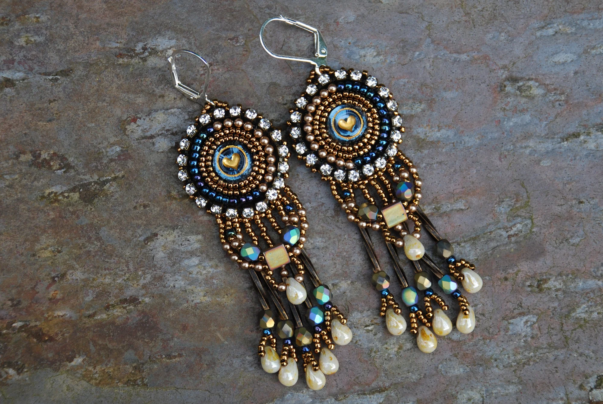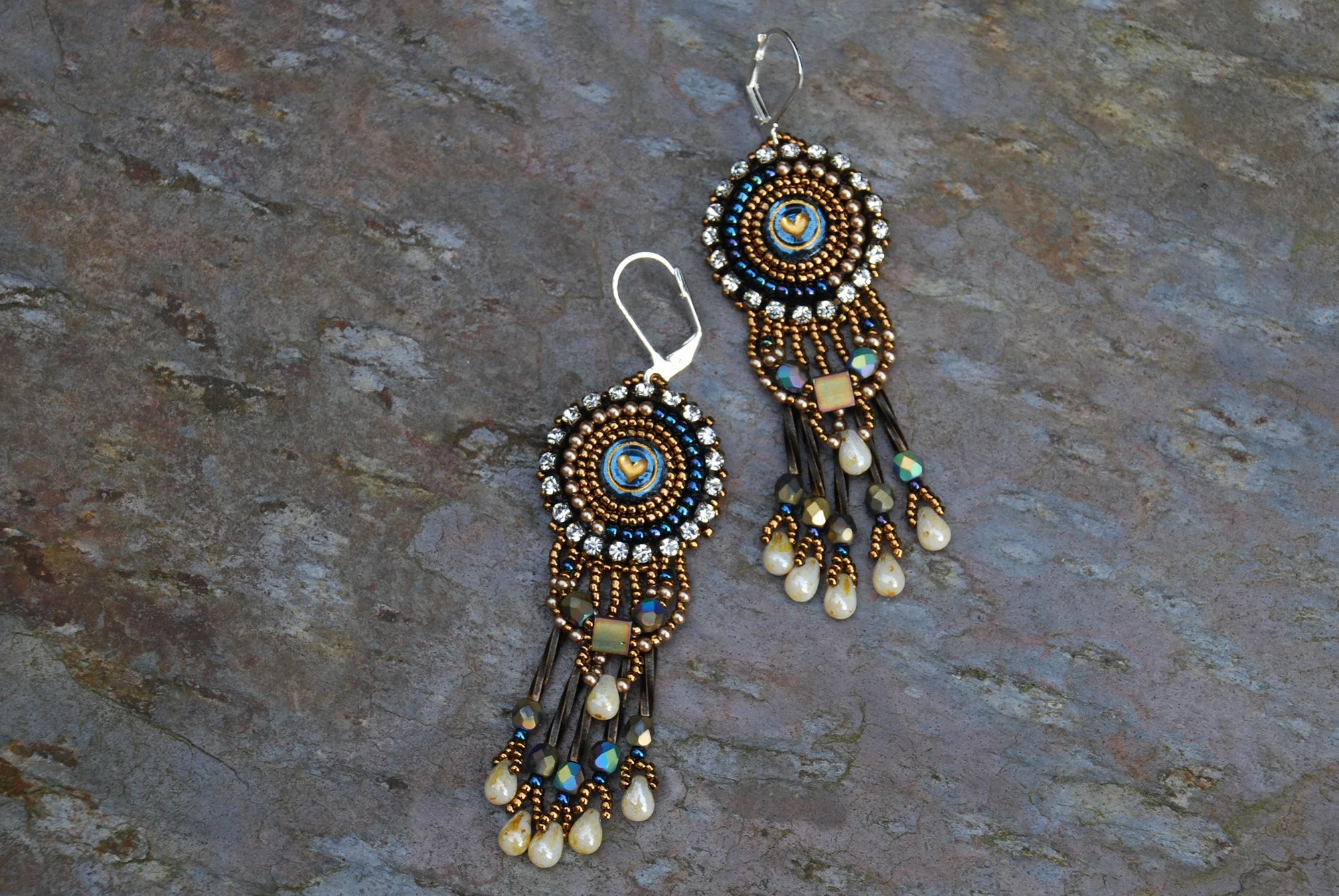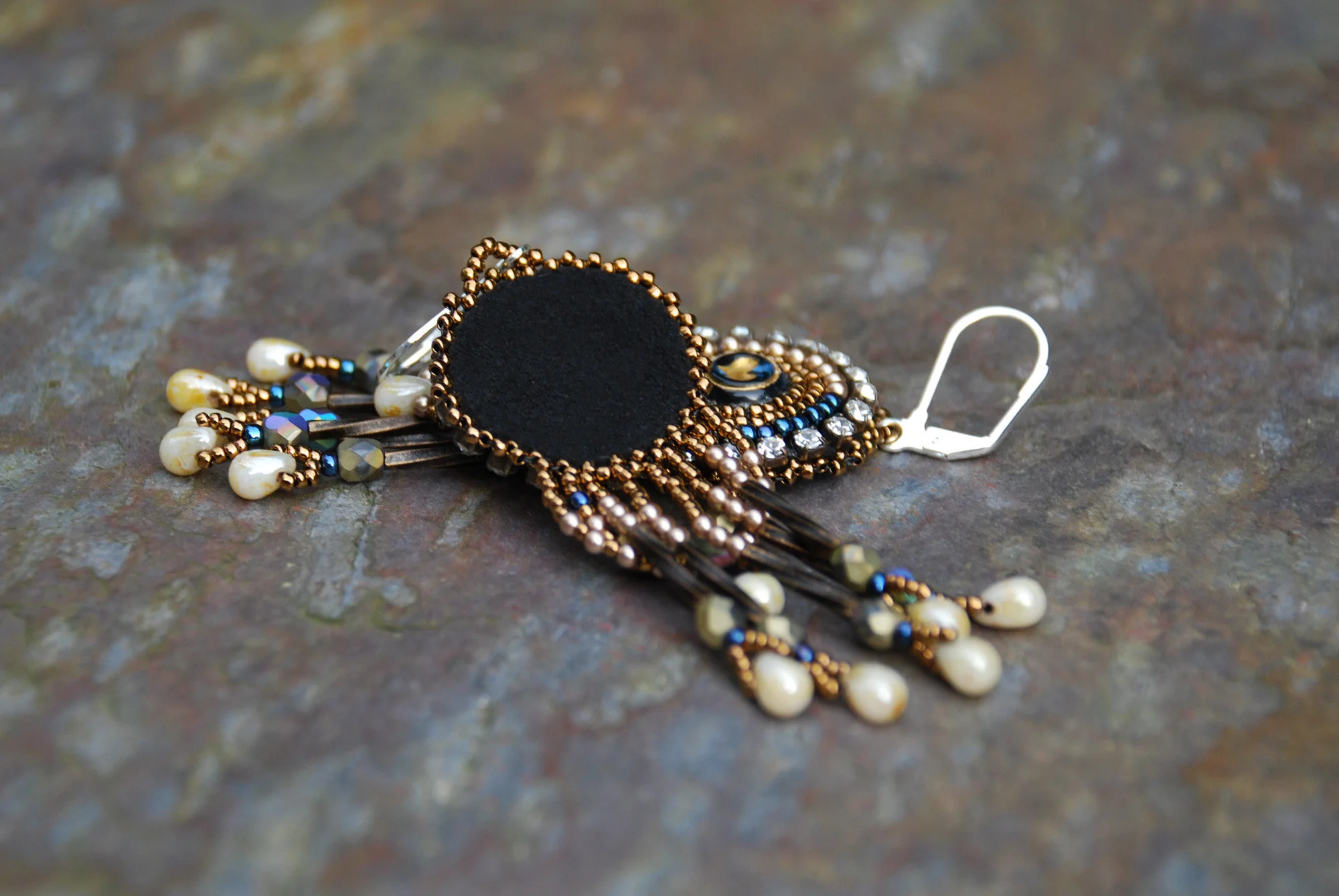 Elegant bead embroidered earrings focused on the vintage heart cabochons. One of a kind, with rhinestone cup chain, seed and drop beads. Silver plated leaver back ear wires. Backed with black ultra-suede. Approx. 3" total length.