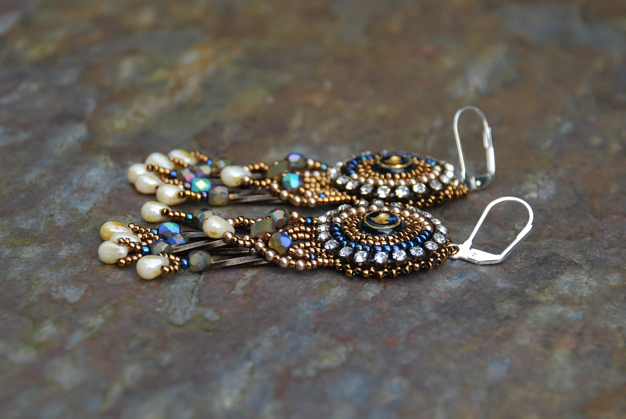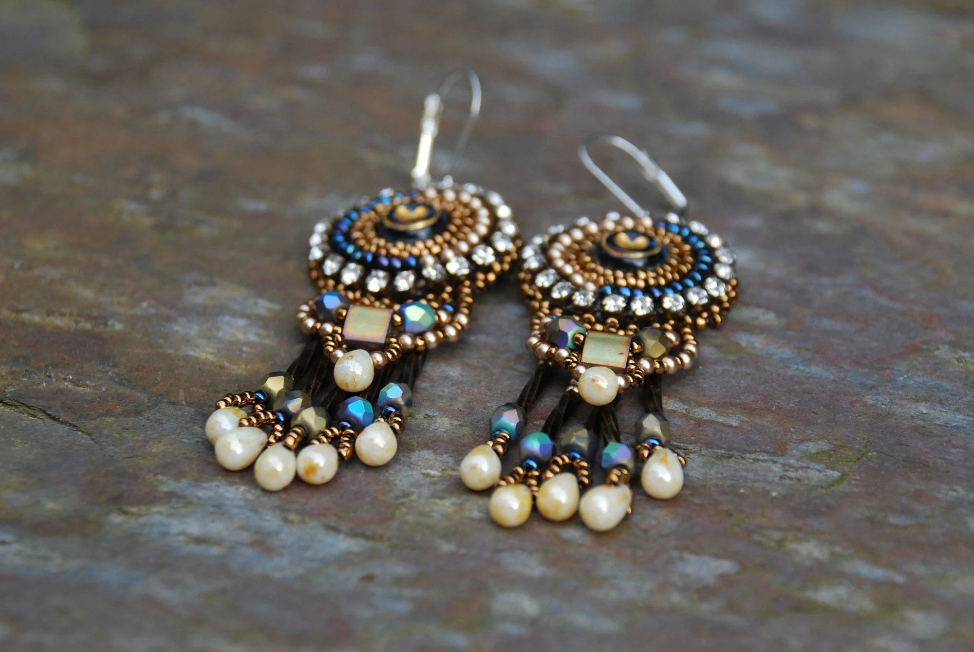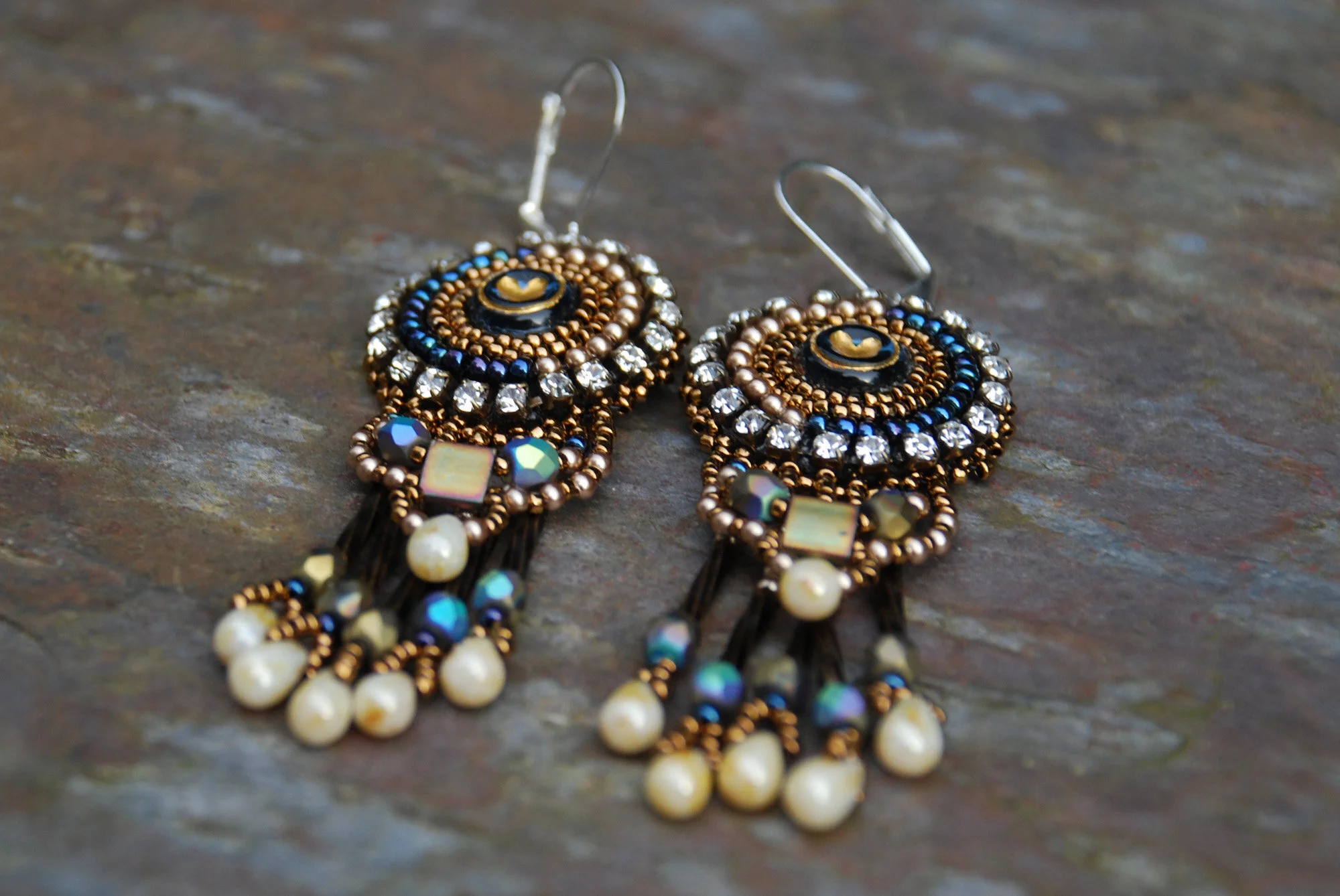 Elegant bead embroidered earrings focused on the vintage heart cabochons. One of a kind, with rhinestone cup chain, seed and drop beads. Silver plated leaver back ear wires. Backed with black ultra-suede. Approx. 3" total length.